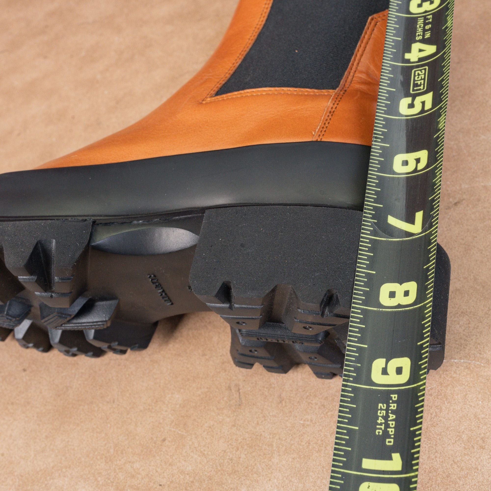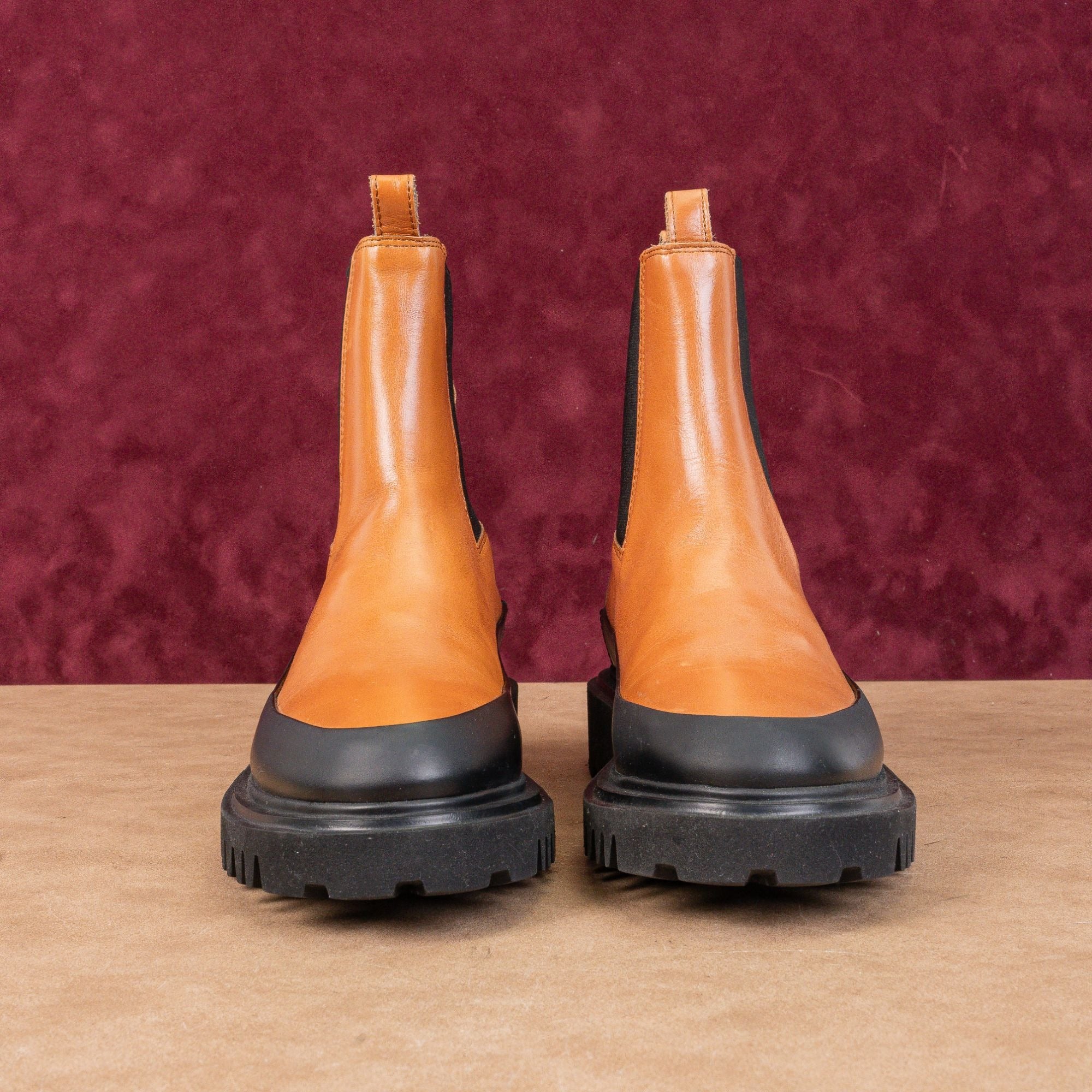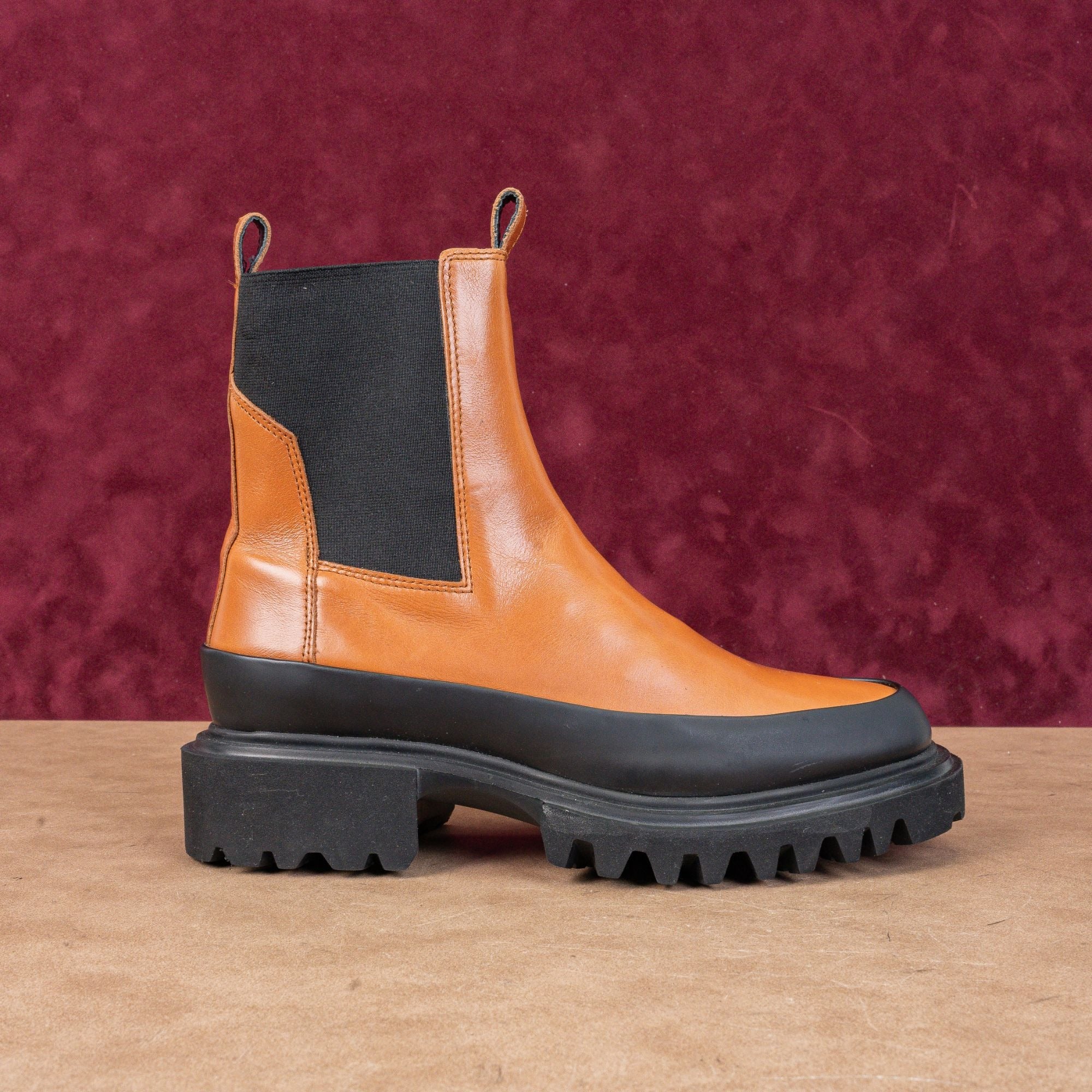 Featuring a striking black leather upper with a contrasting tan rubber mudguard, these boots boast a chunky platform lug sole for an edgy, industrial look.