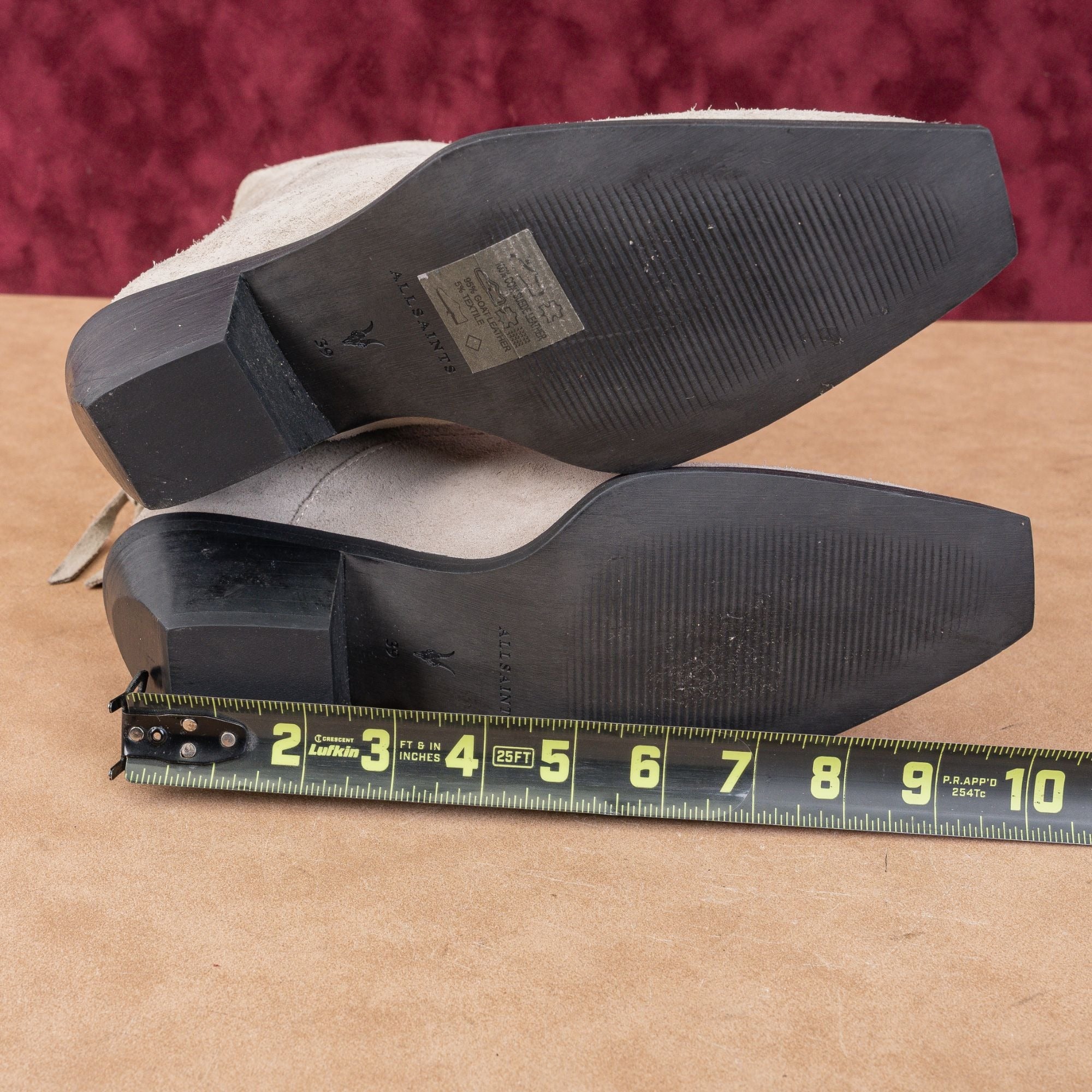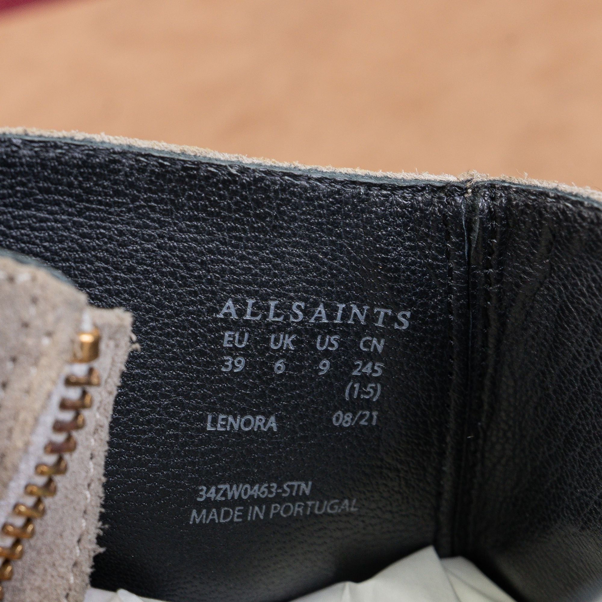 The AllSaints Lenora Boots combine effortless sophistication with a modern edge. Crafted from soft beige suede, these ankle boots feature a signature Cuban block heel for subtle elevation and all-day comfort.