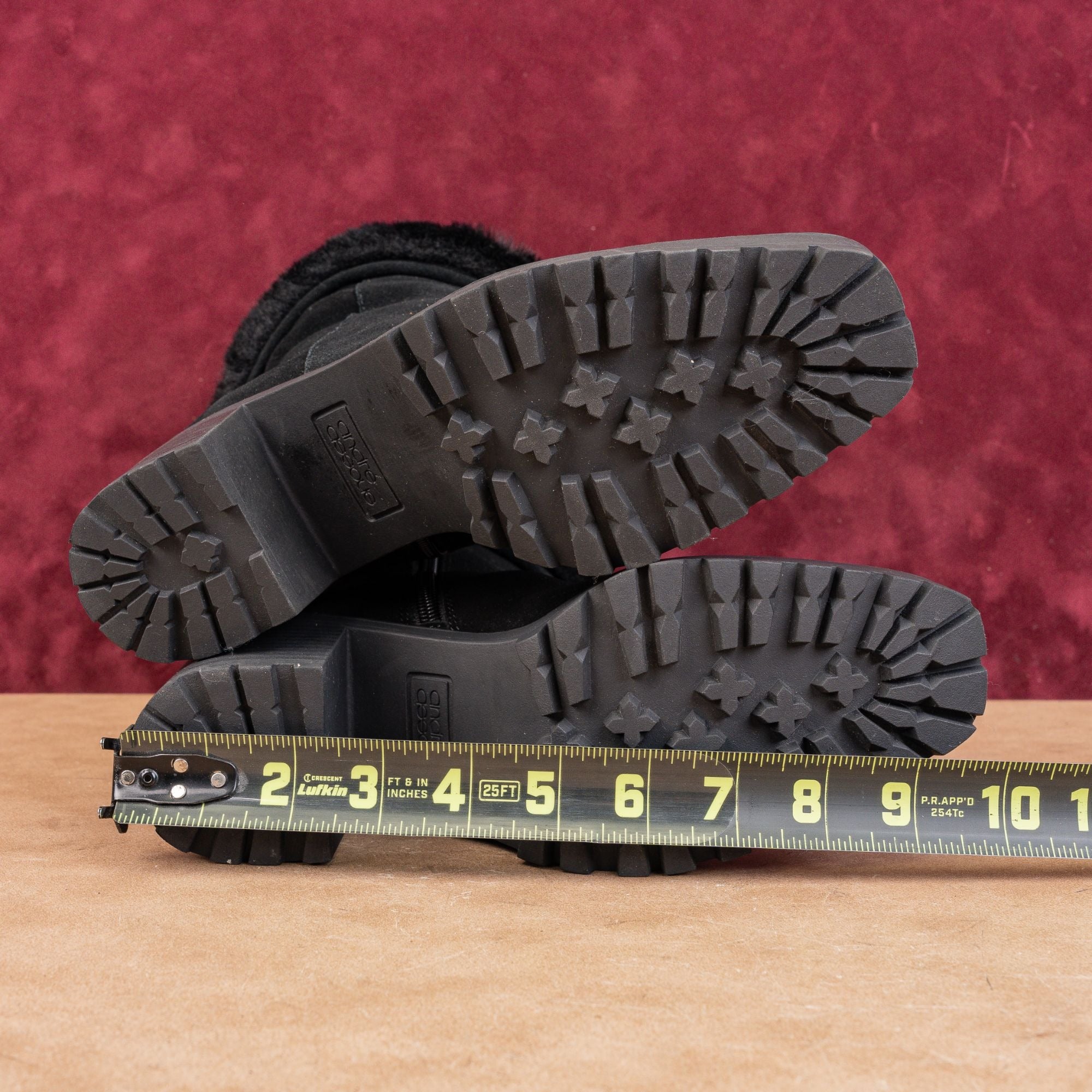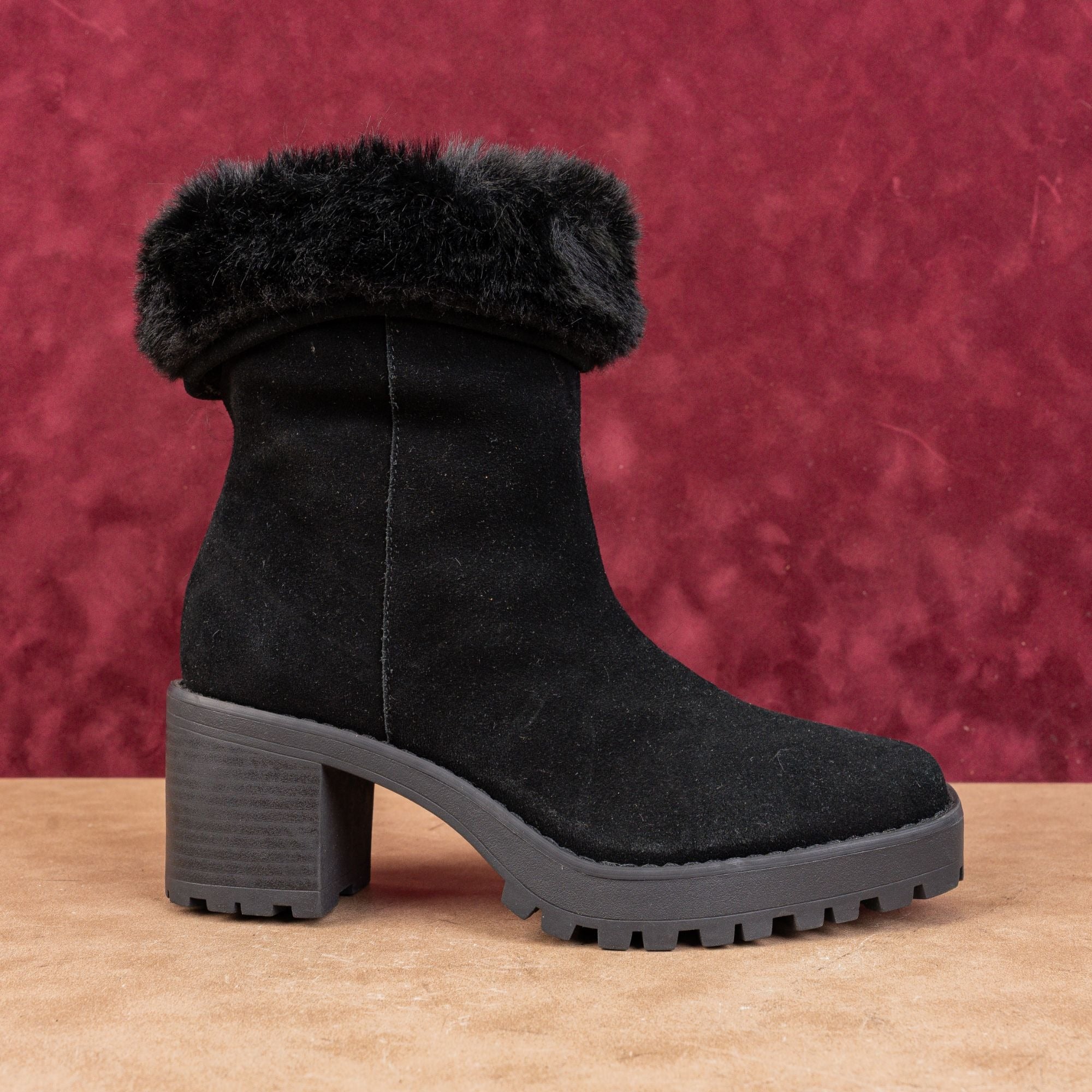 Excellent Condition. Minimal signs of wear on the soles. Display Model. Retails for $128. Made in China. Suede Upper, Faux Fur Lining and Lug rubber soles. Side zipper closure for easy on and off. Square toe Please check photos carefully for more information and details.