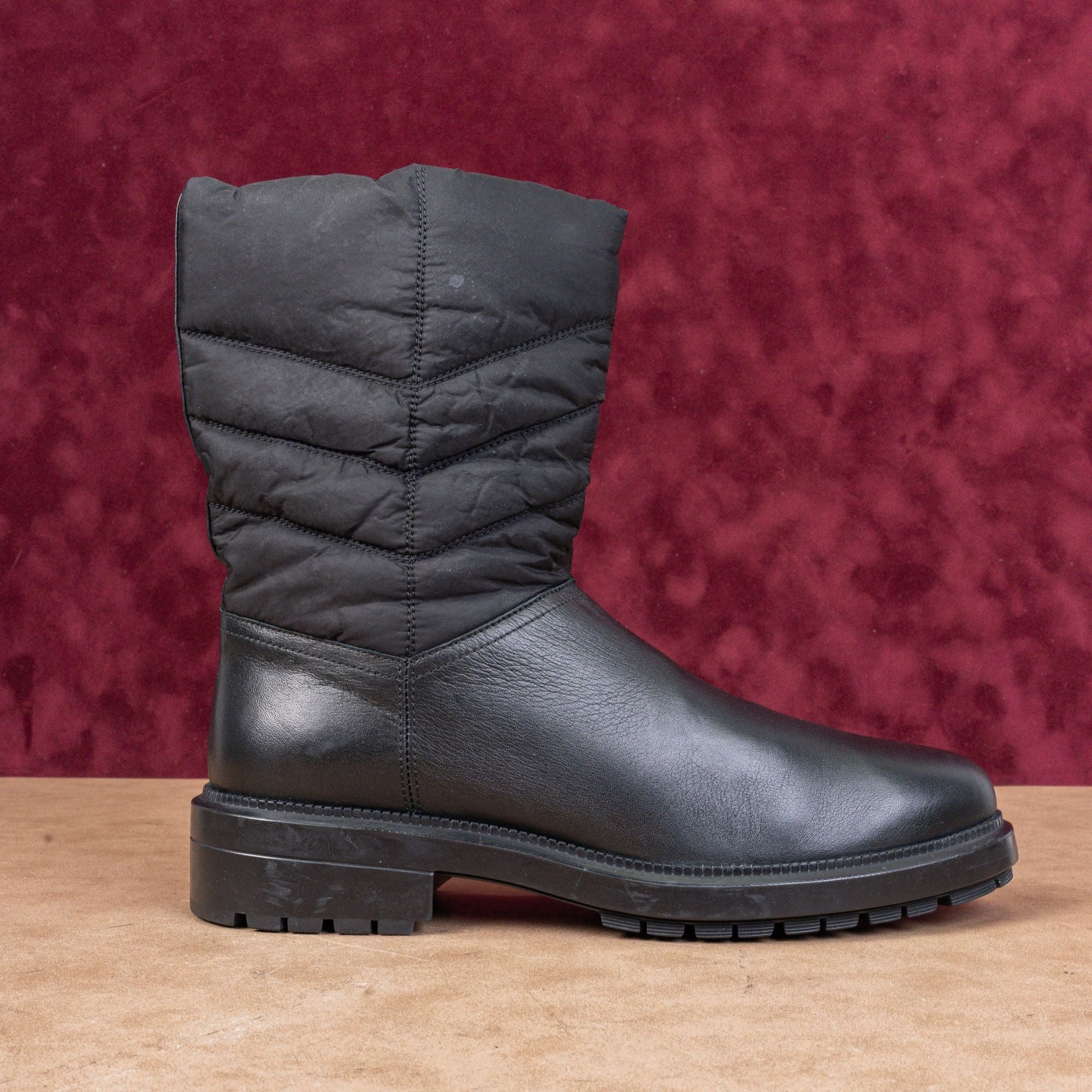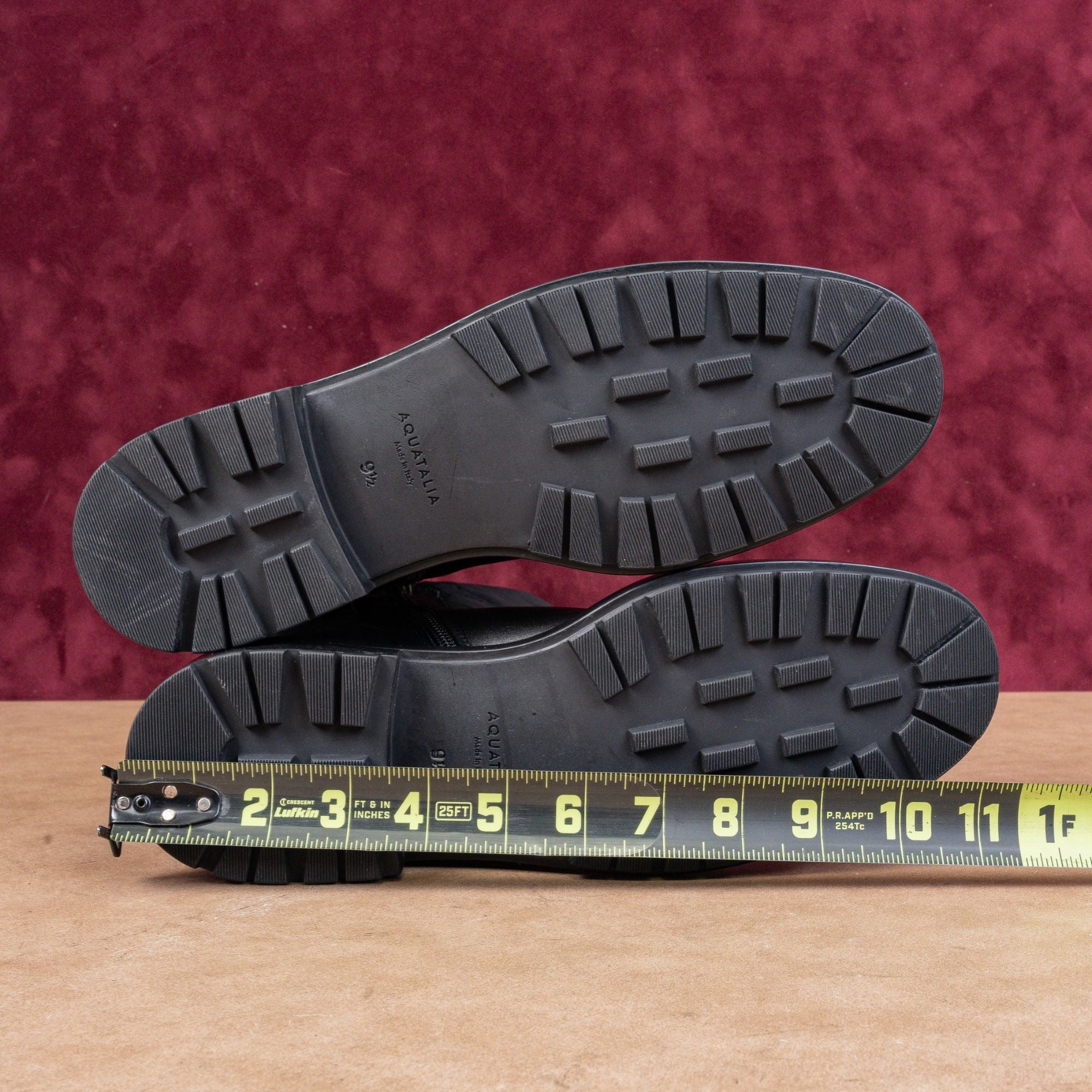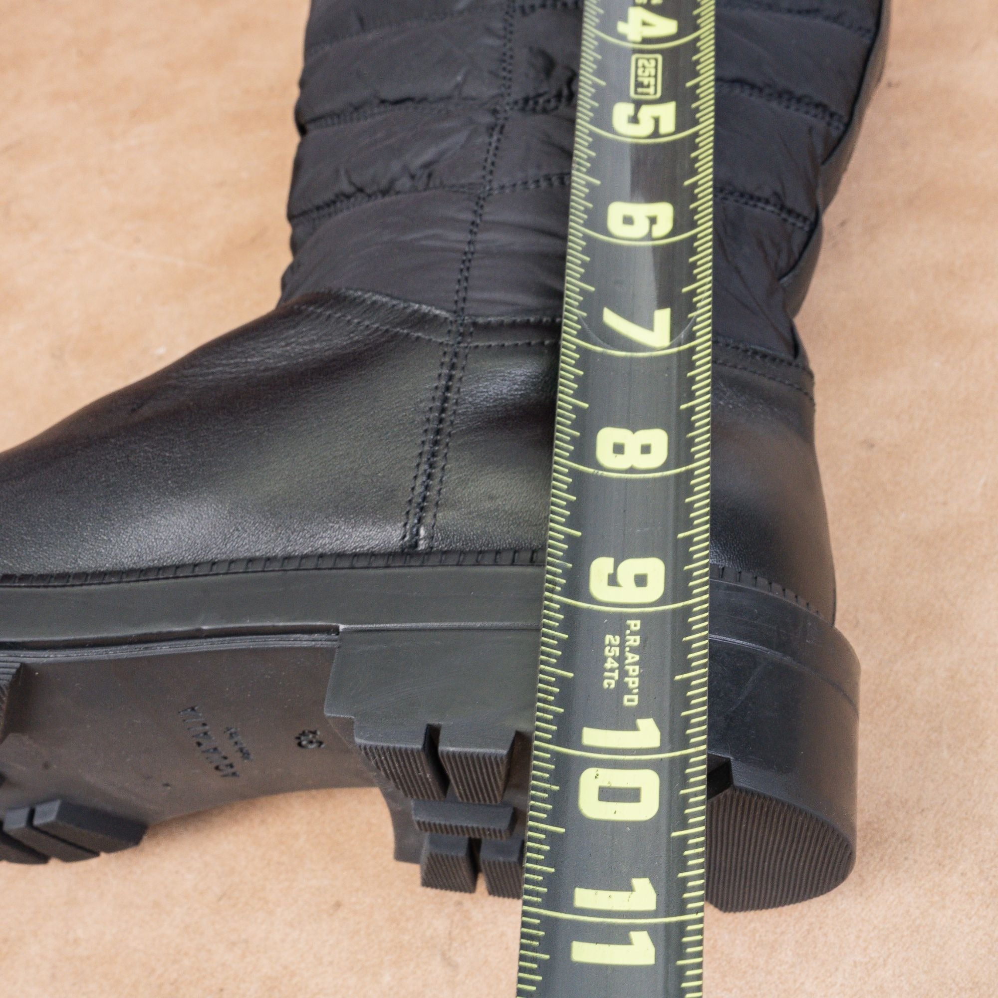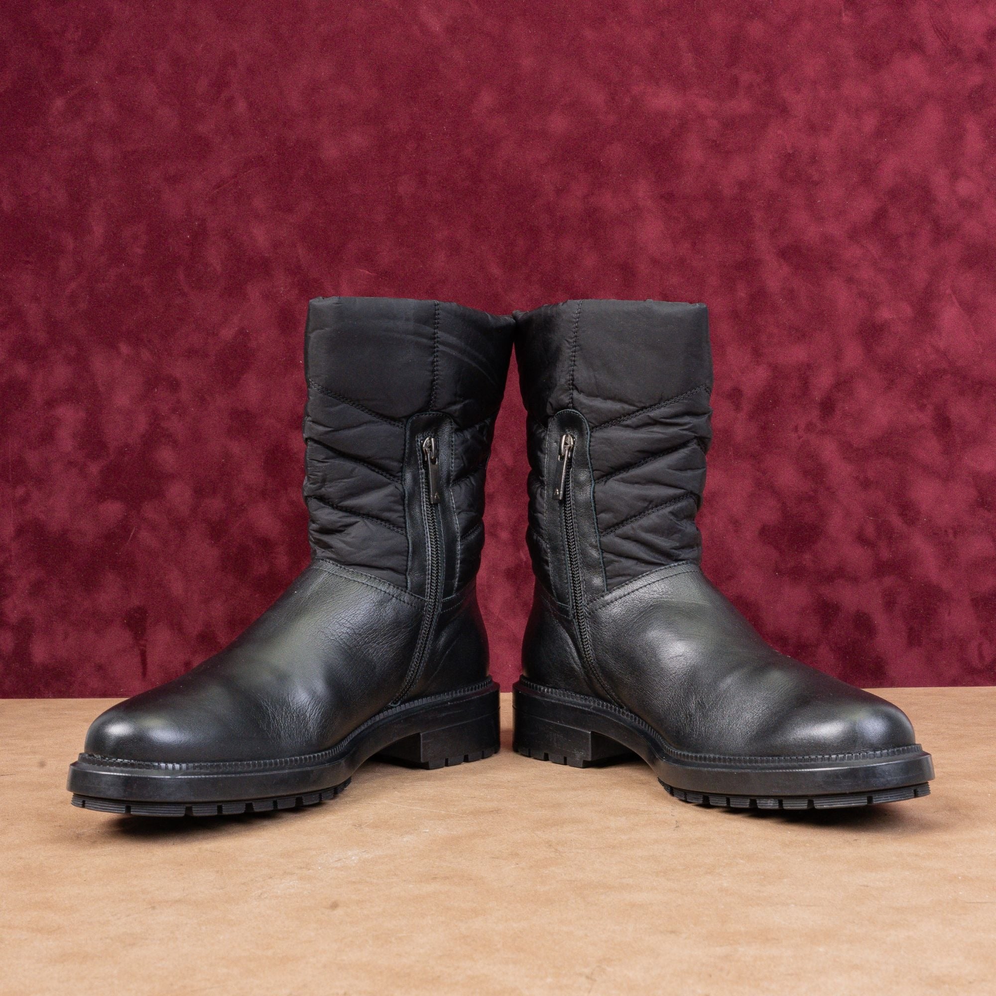 New Condition. No signs of wear on the soles or boots. Slim and Narrow Fit around the toe box. Brand-New. Made in Italy. Model #Lori. Leather Upper, Fabric lining and rubber soles. Partial inset side zipper closure for easy on and off. Quilted shaft and lug sole. Round toe. Retails $495. SKU11484