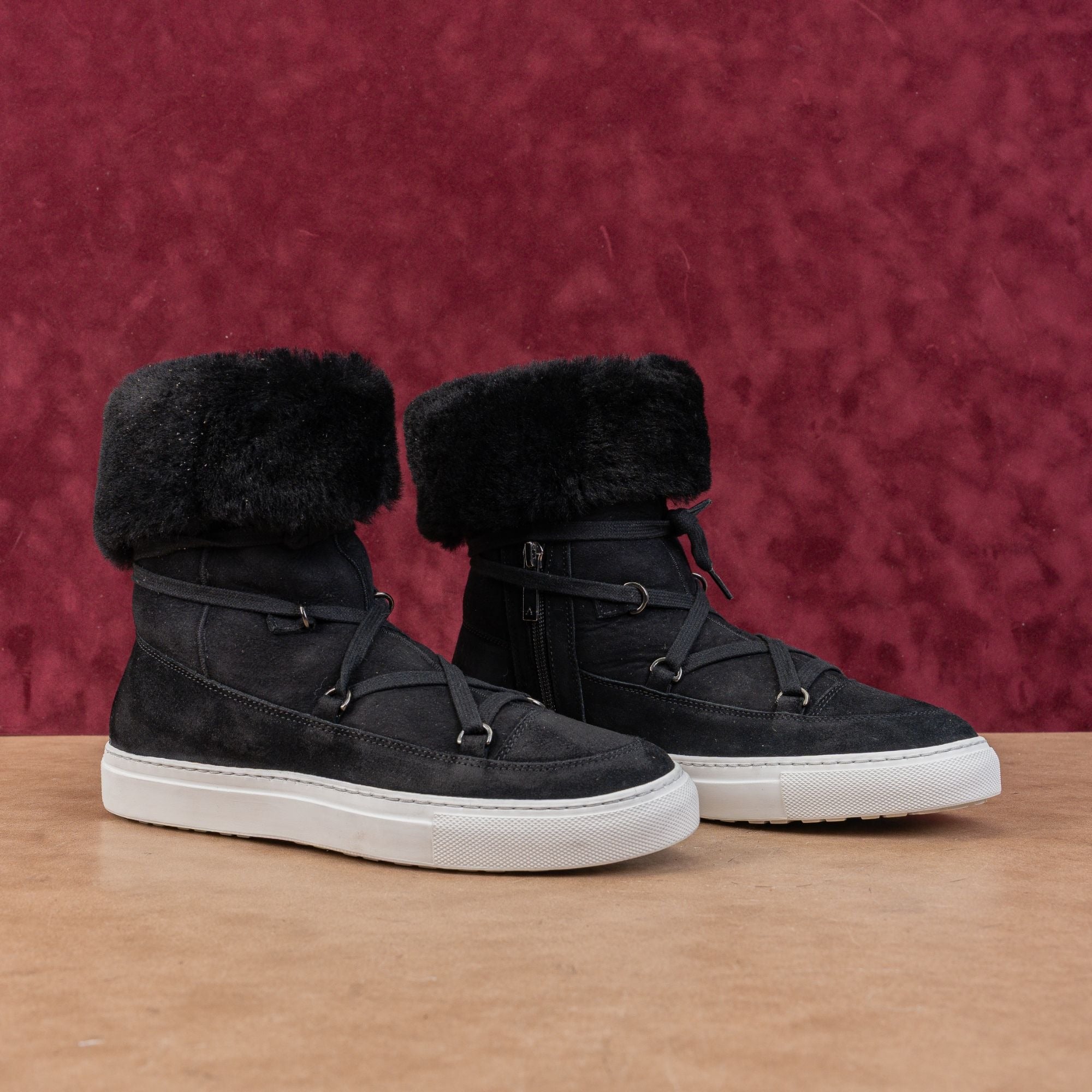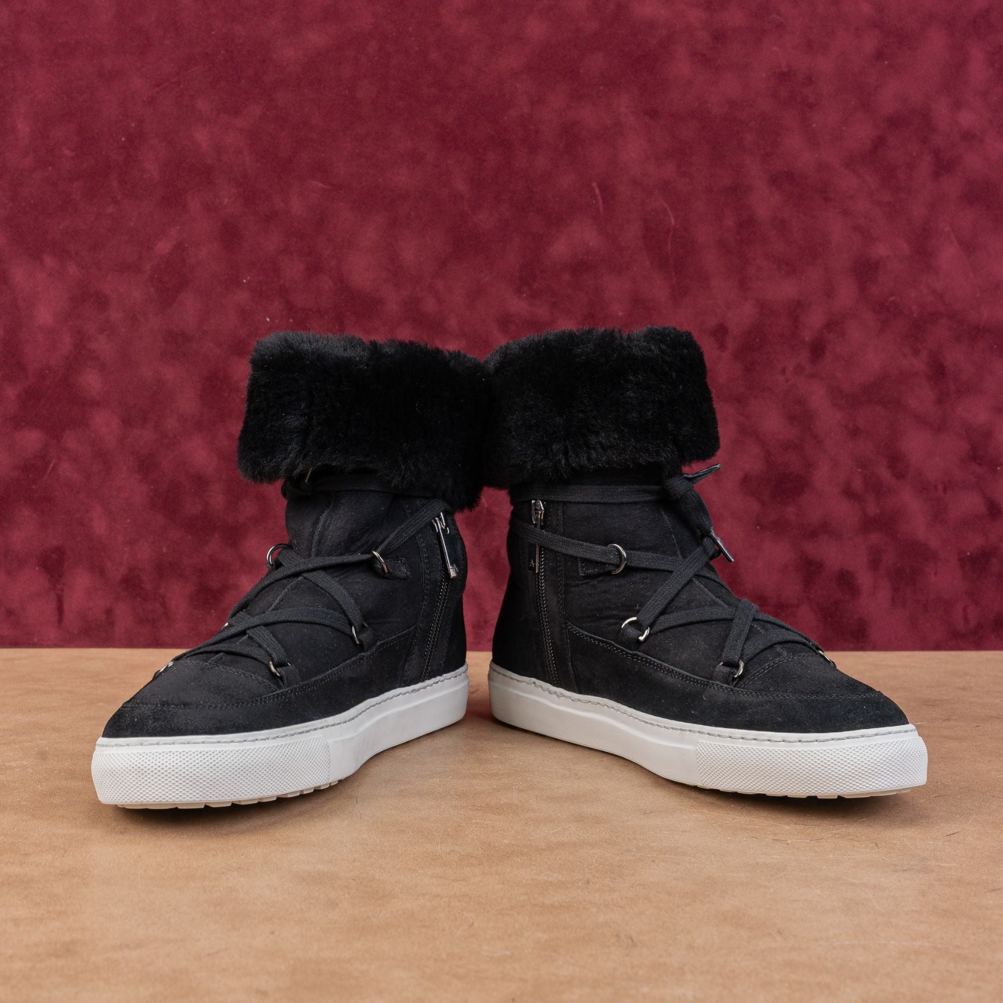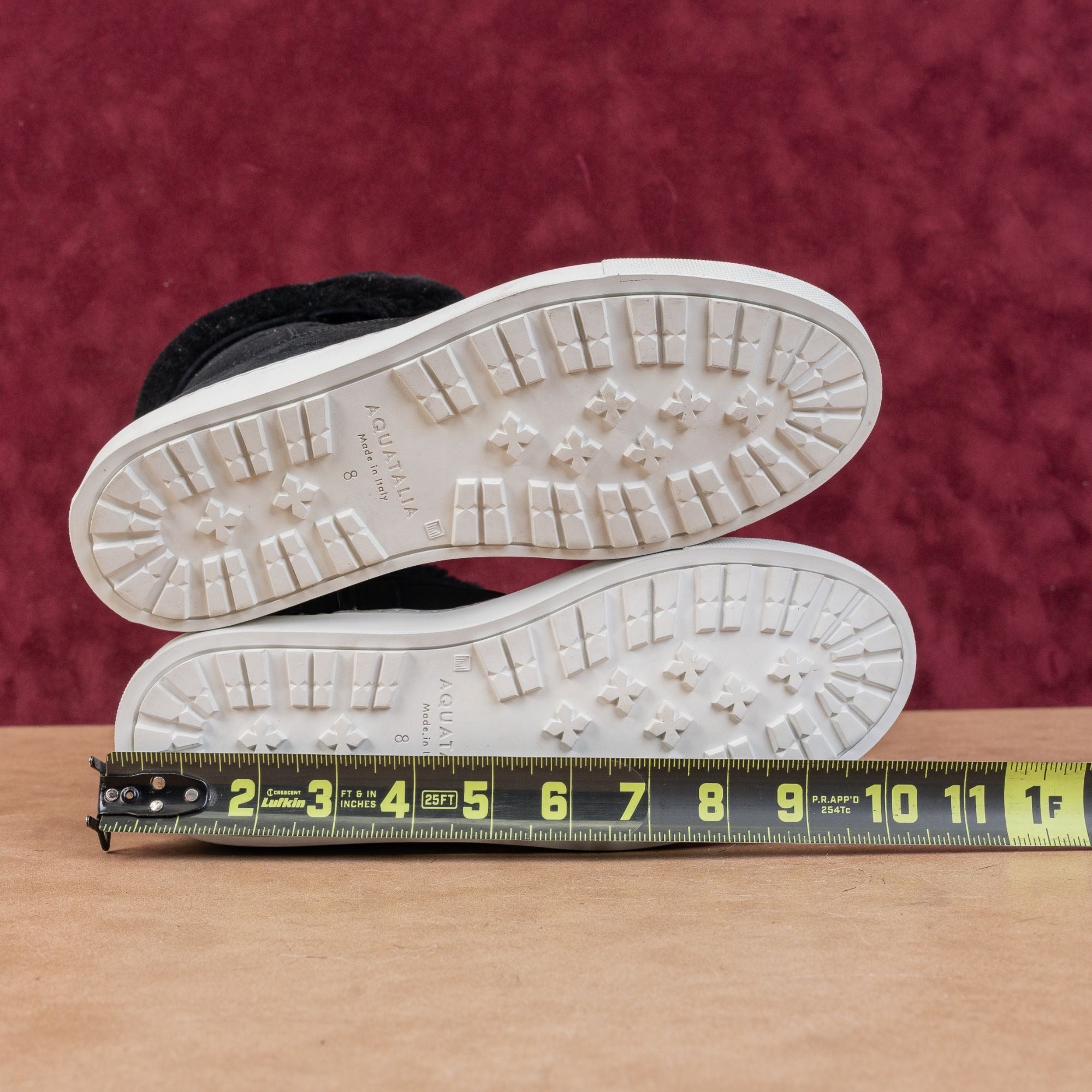 New Condition. No signs of wear on the soles. never Worn. Retails for $395. Round toe. Runs 1/2 Size smaller fits a size 7.5. Smooth Italian Suede upper, Shearling Lining and synthetic sole. Partial side zipper for easy and off. Made in Italy. Please check photos carefully for more information and details. SKU11844