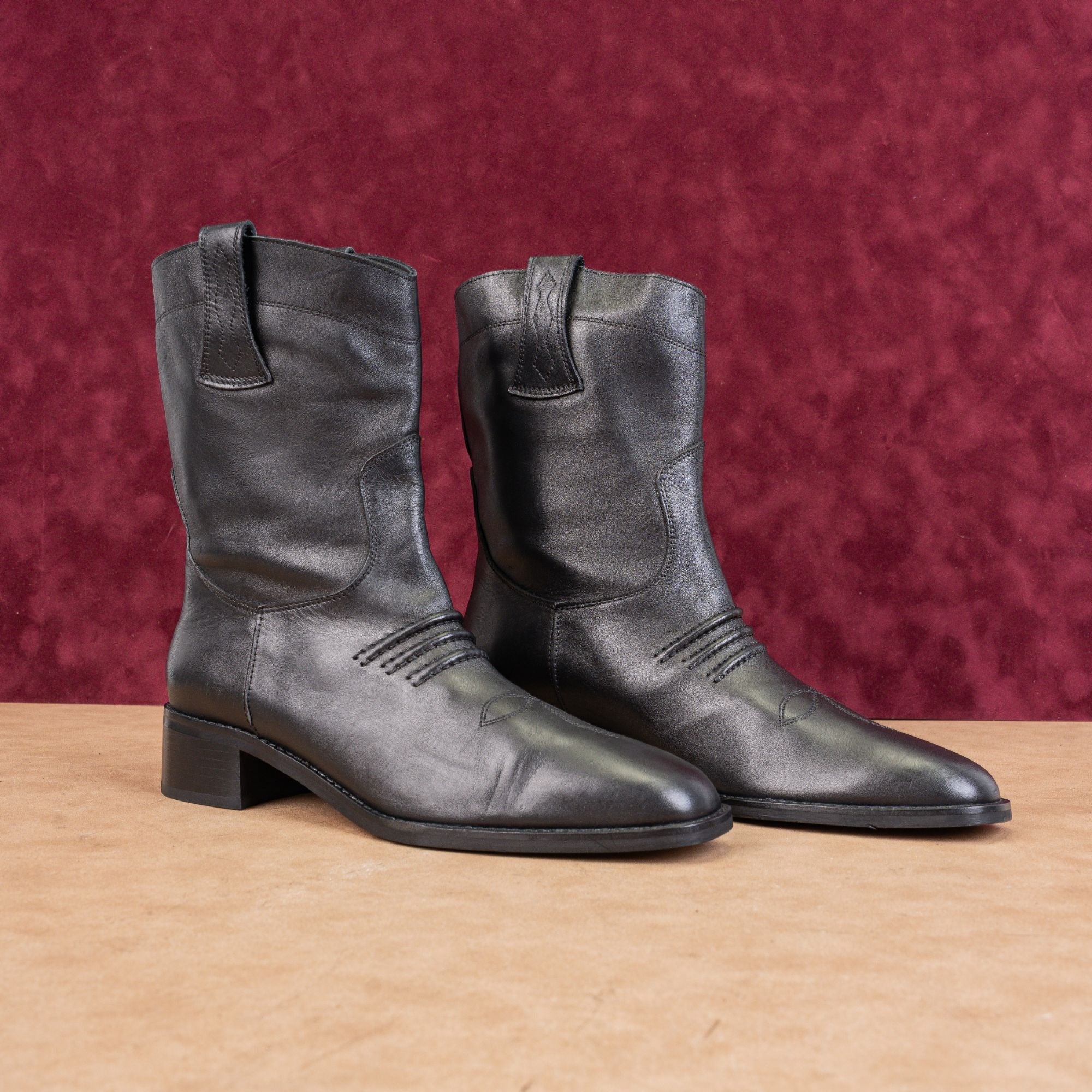 These amazing Bibi Lou mid-calf cowboy boots in a Women's size 9 (EUR 39). Crafted in Spain from a classic, durable black leather, these boots have the perfect modern western silhouette—chic enough for the city, but with that timeless cowboy attitude.