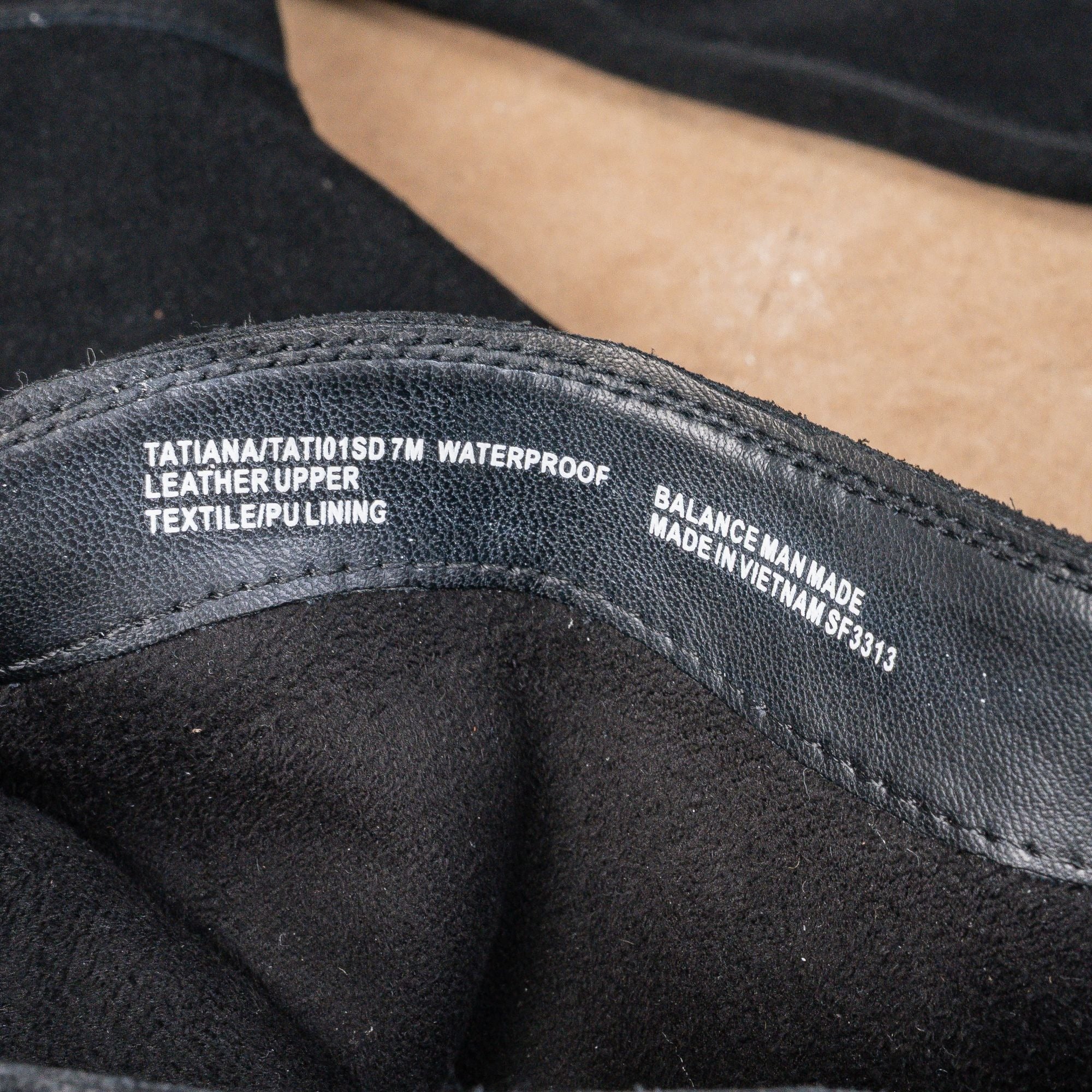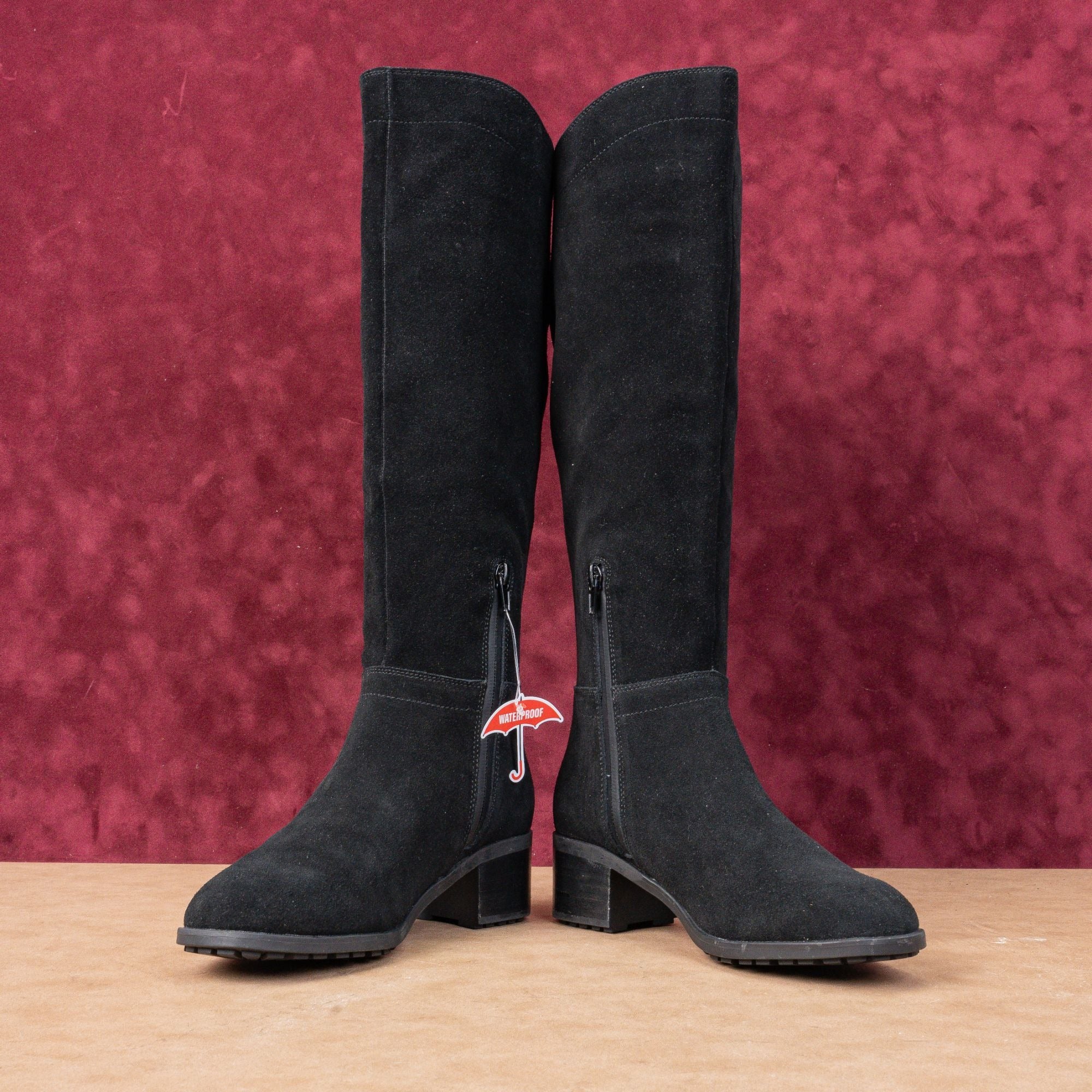 Crafted from waterproof black suede, this boot features a cozy fleece lining and a comfortable wedge heel for a chic, all-weather lift.