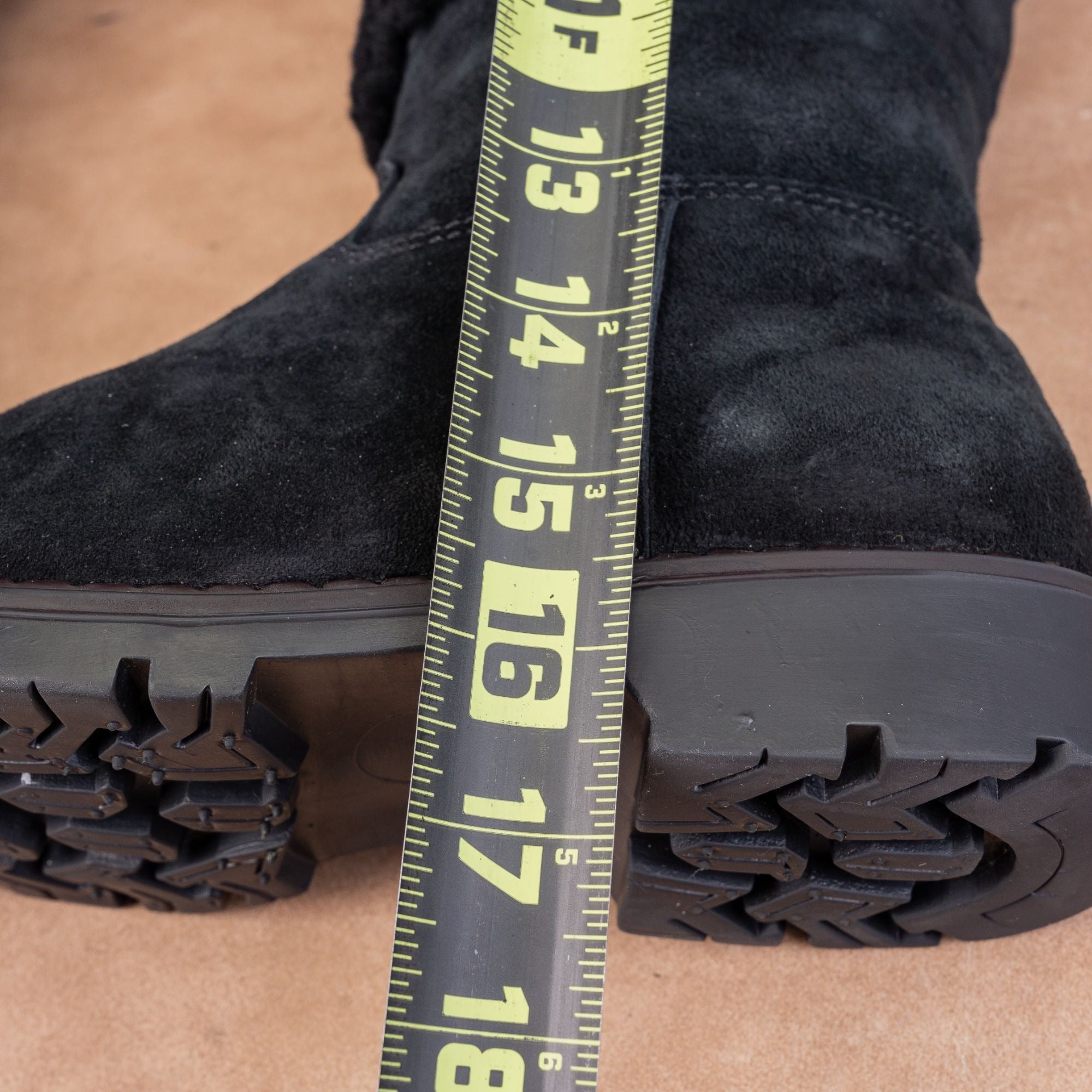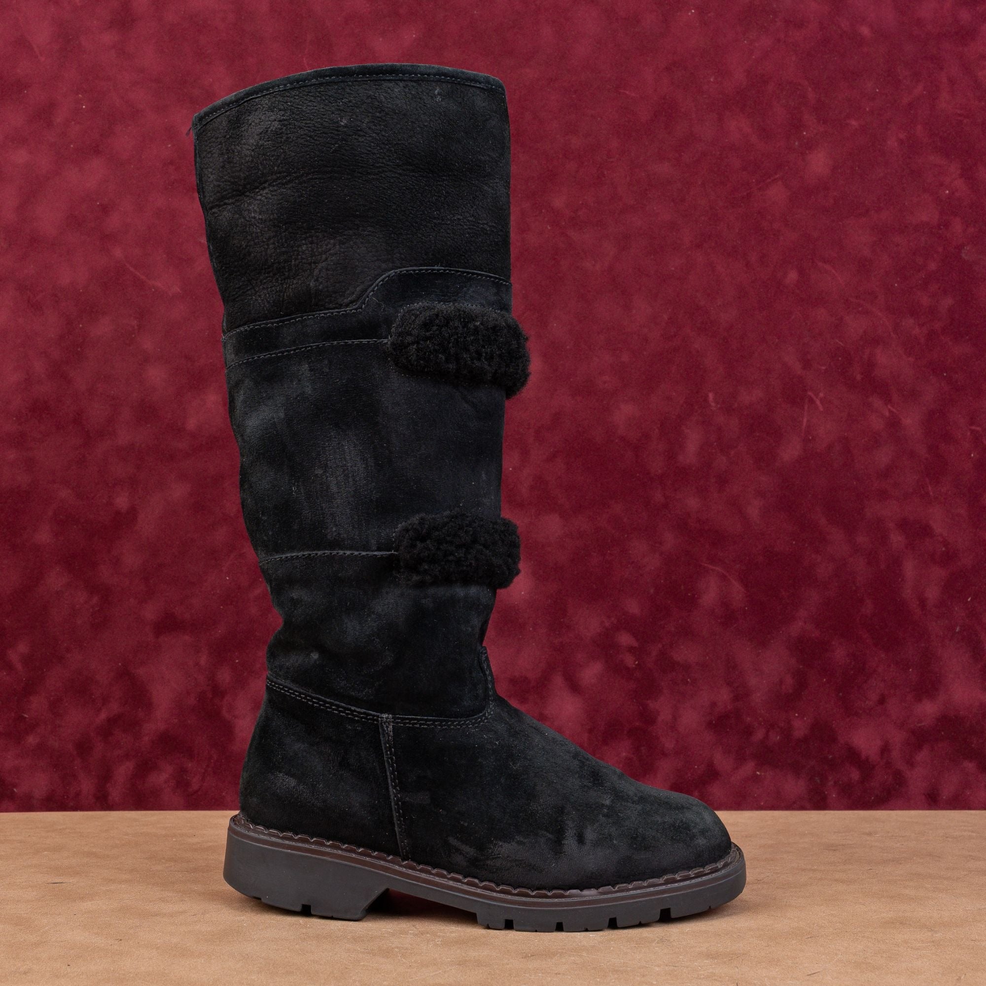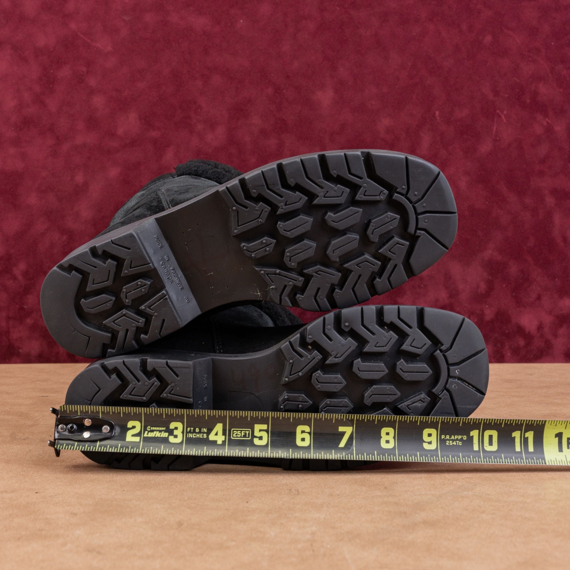 Crafted from heavy-duty, waterproof black leather and featuring a cozy, plush shearling lining, these boots offer a timeless "Cabin Core" aesthetic.
