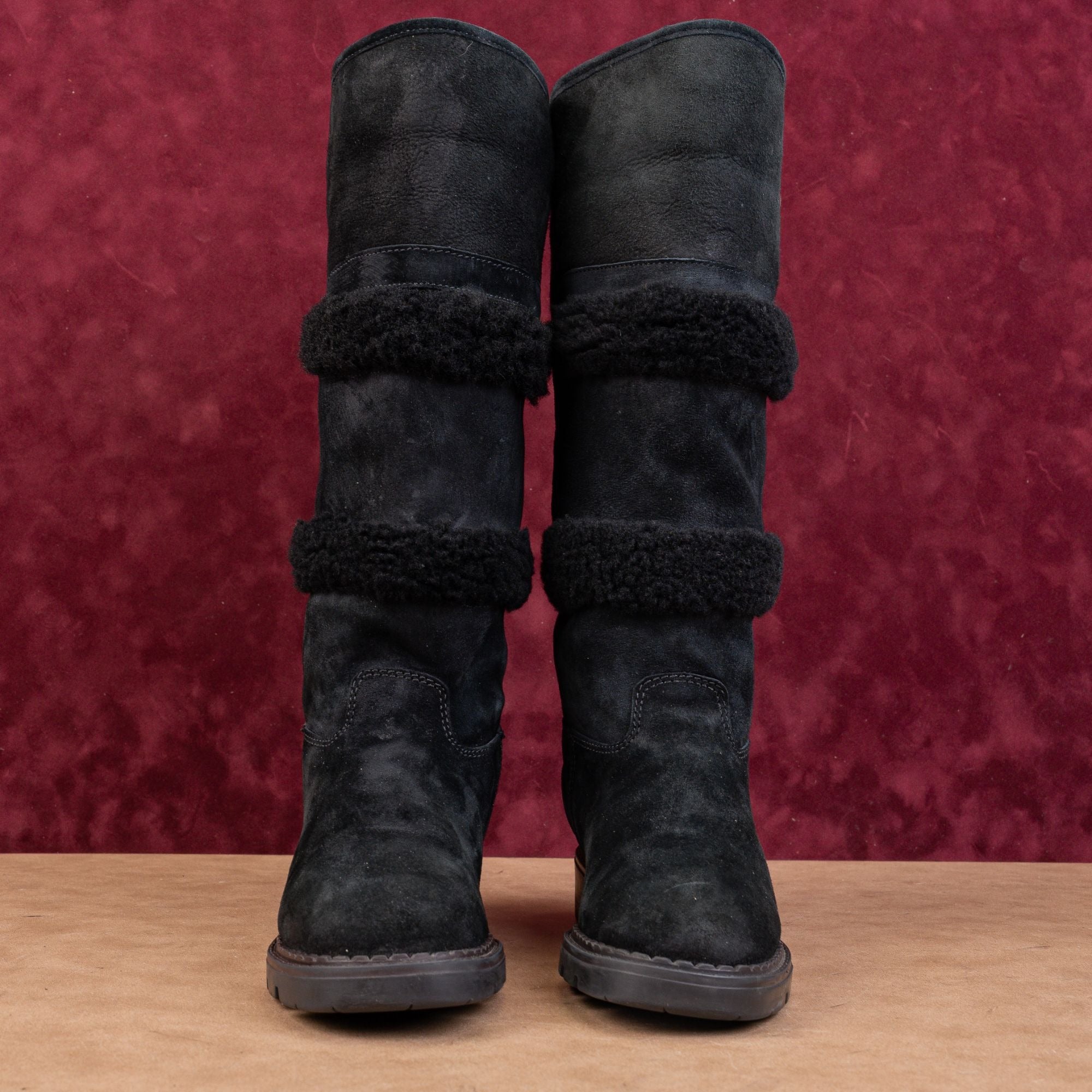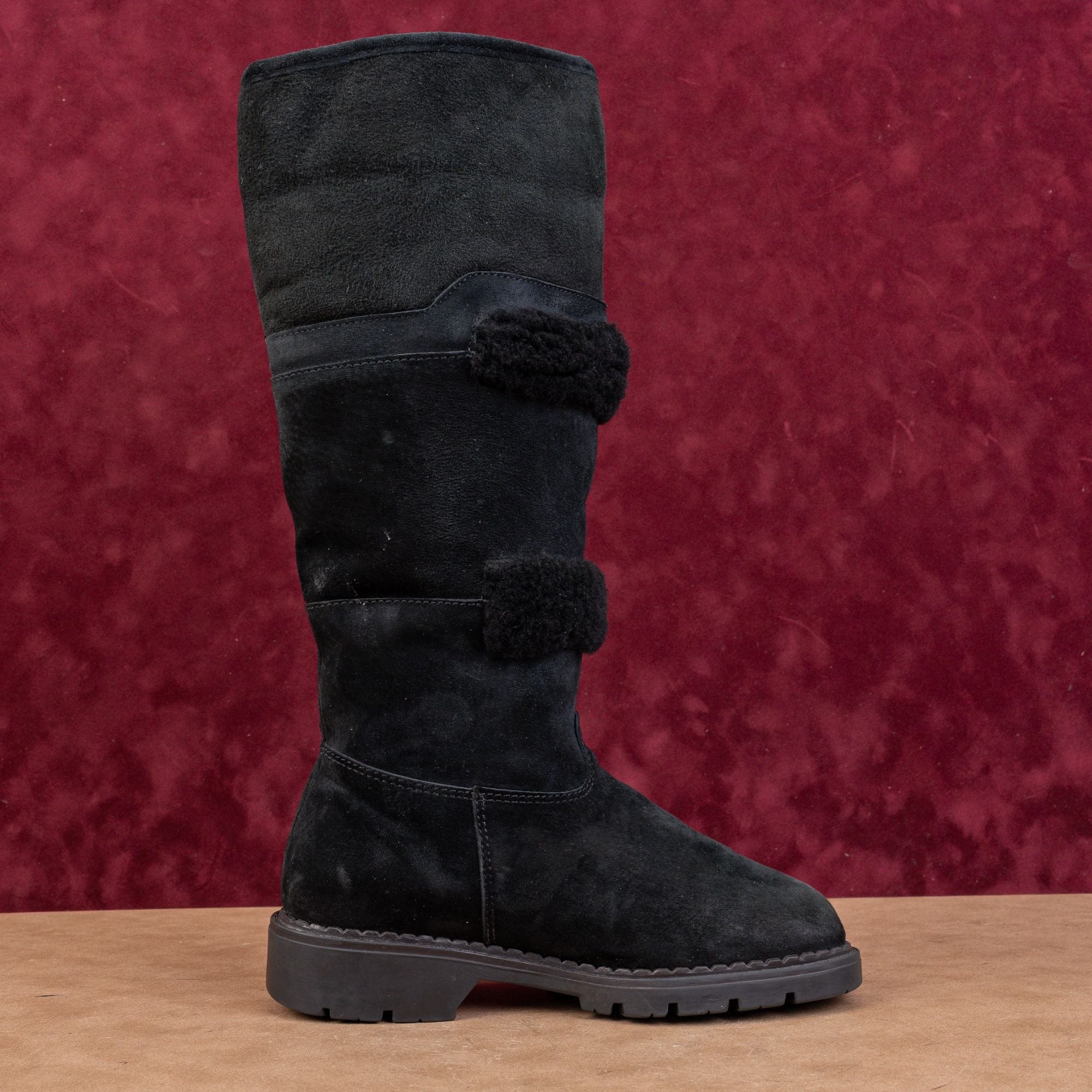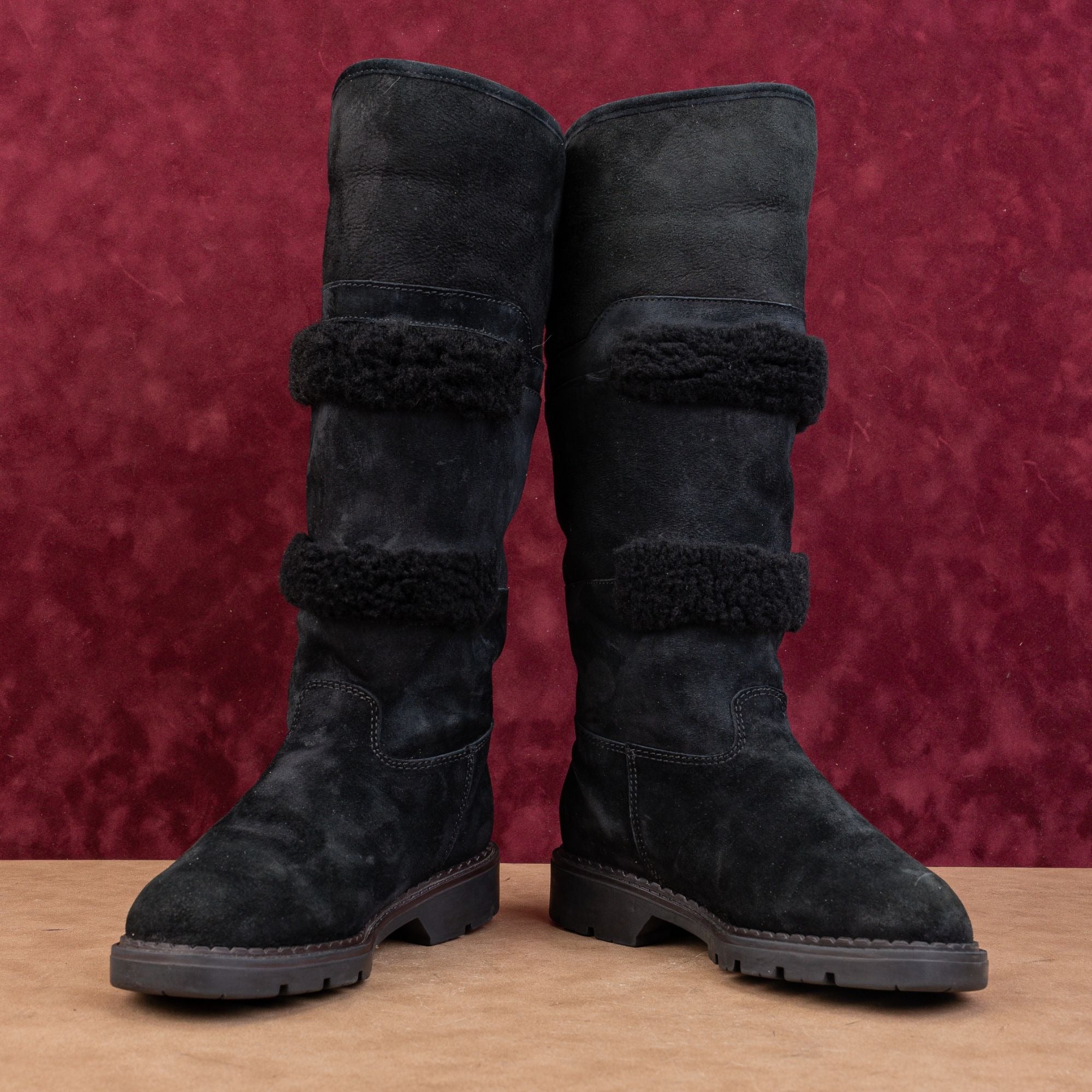 Crafted from heavy-duty, waterproof black leather and featuring a cozy, plush shearling lining, these boots offer a timeless "Cabin Core" aesthetic.