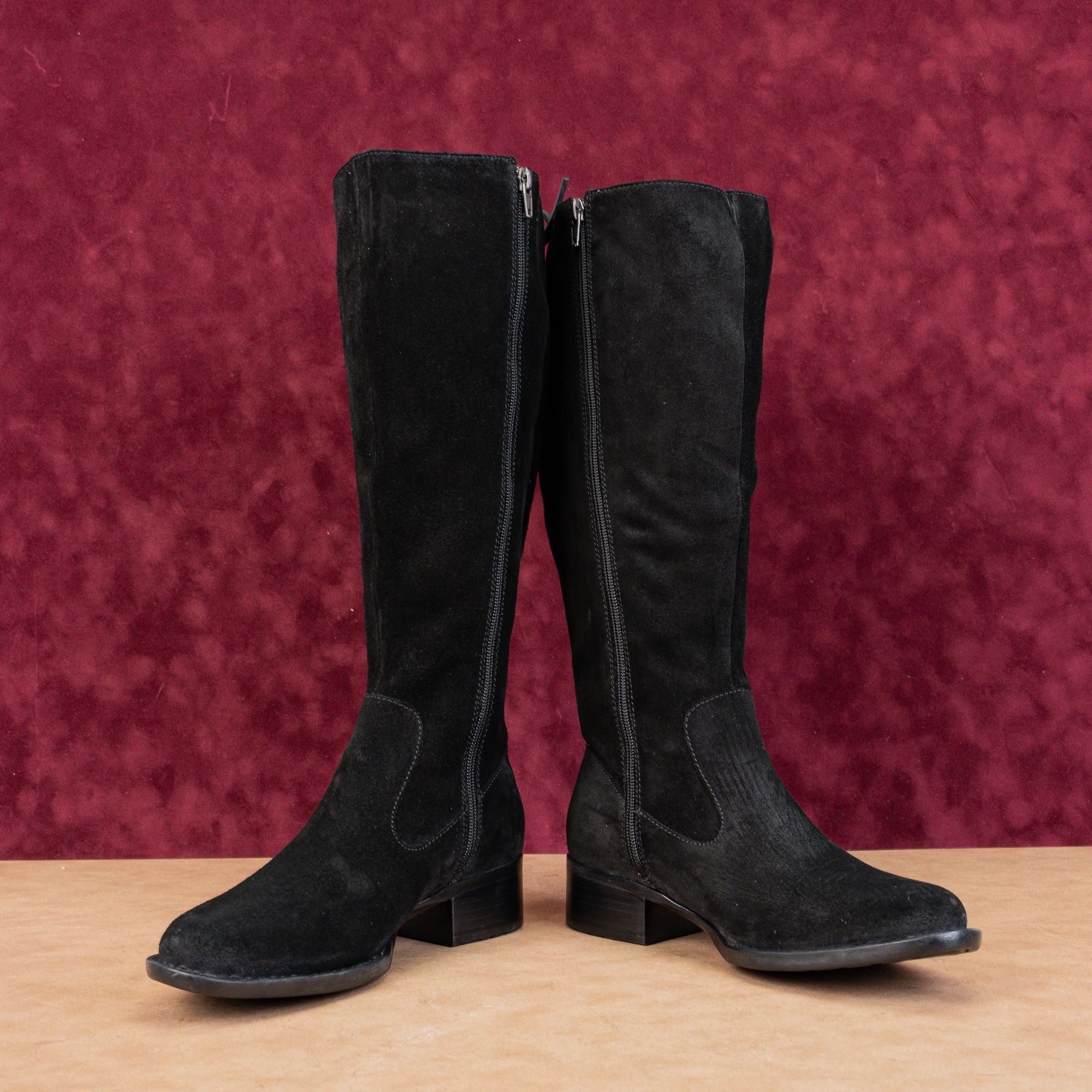 These amazing Born "North" knee-high boots in a Women's size 8.5, specifically designed with a WIDE CALF. They're crafted from a luxe, soft black suede and feature a stunning corset-style lace-up back, which not only looks incredible but also allows for a truly custom, perfect fit.