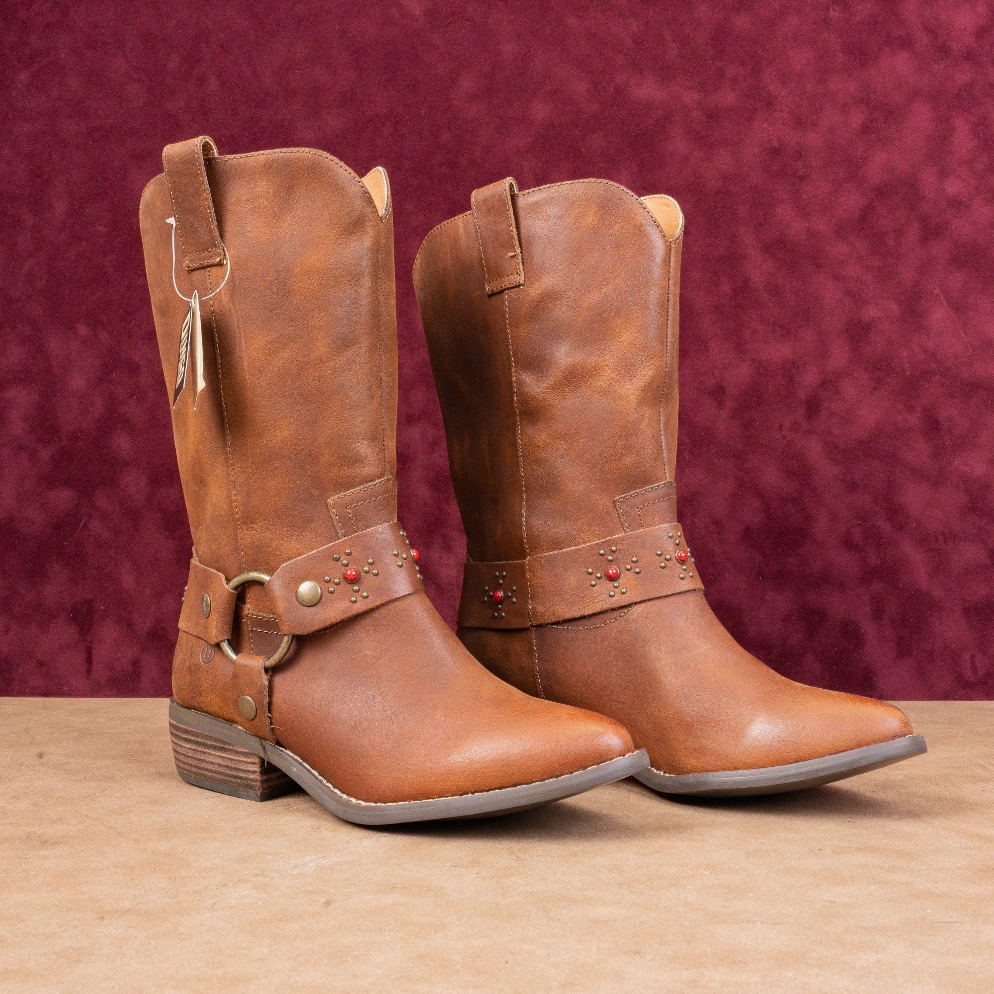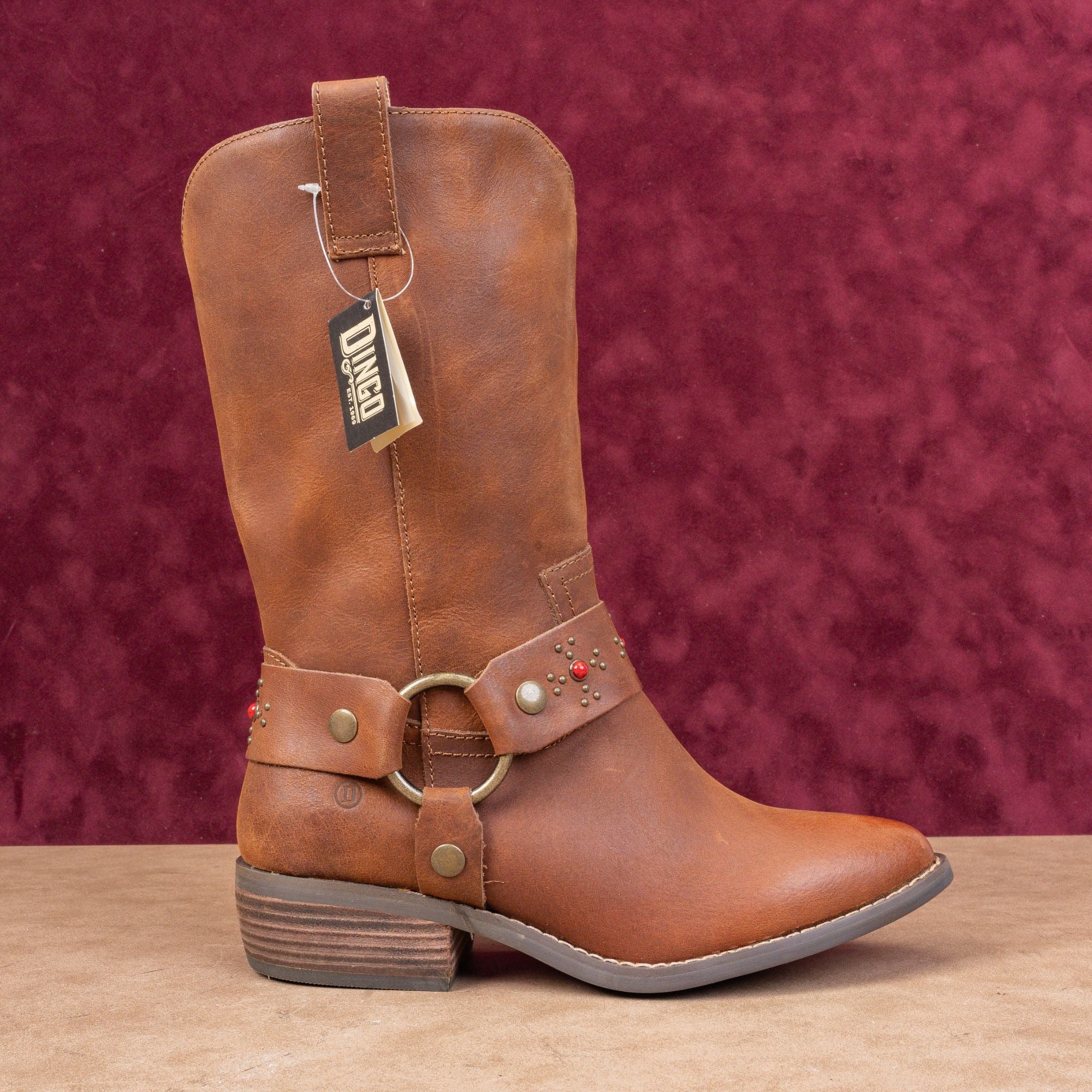 Dingo Women Cognac Leather Harness Western Cowboy Mid Calf Boots sz 8