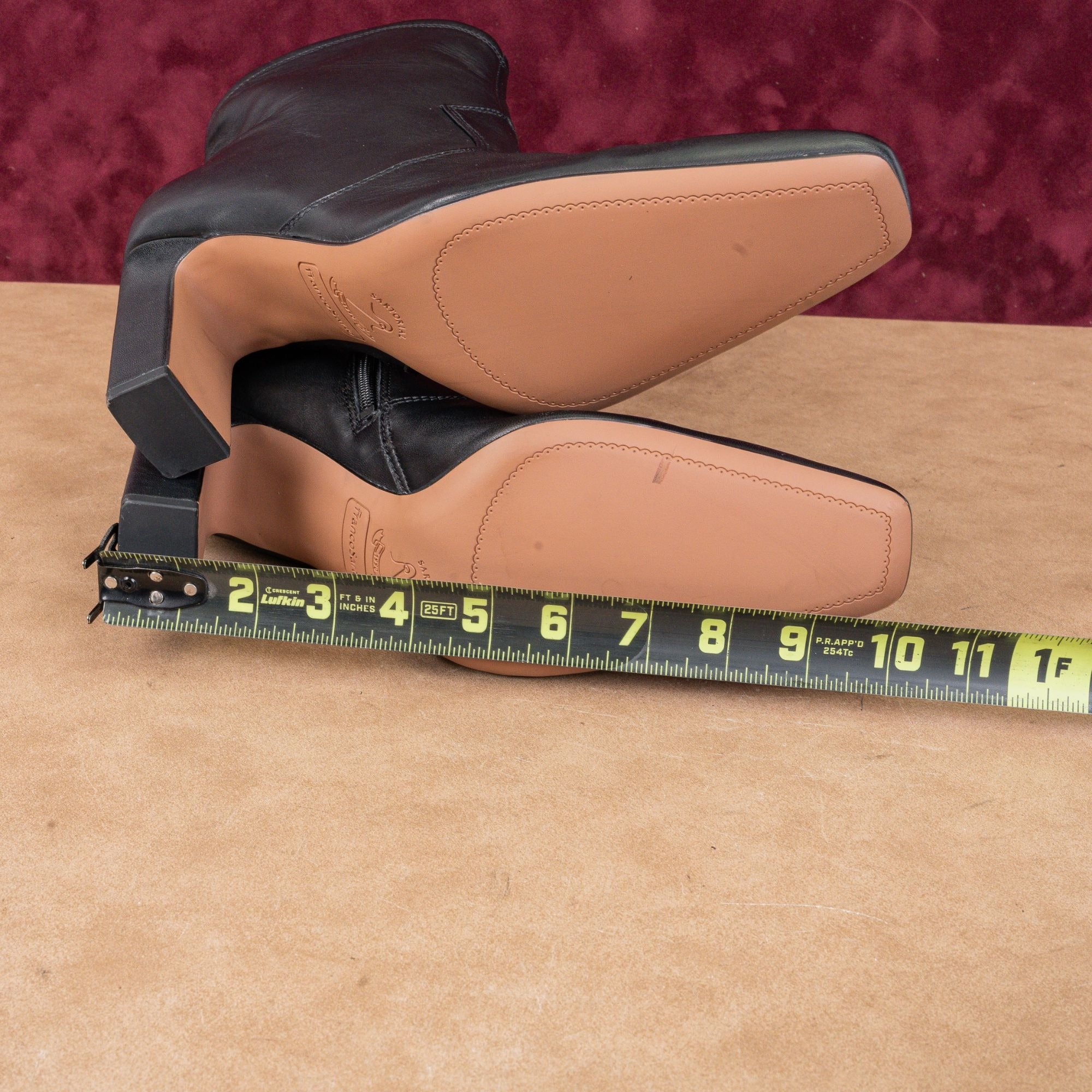 Crafted from sleek black leather, this boot features a chic pointed toe and a comfortable stacked block heel. A clean side zipper makes for easy, effortless style.