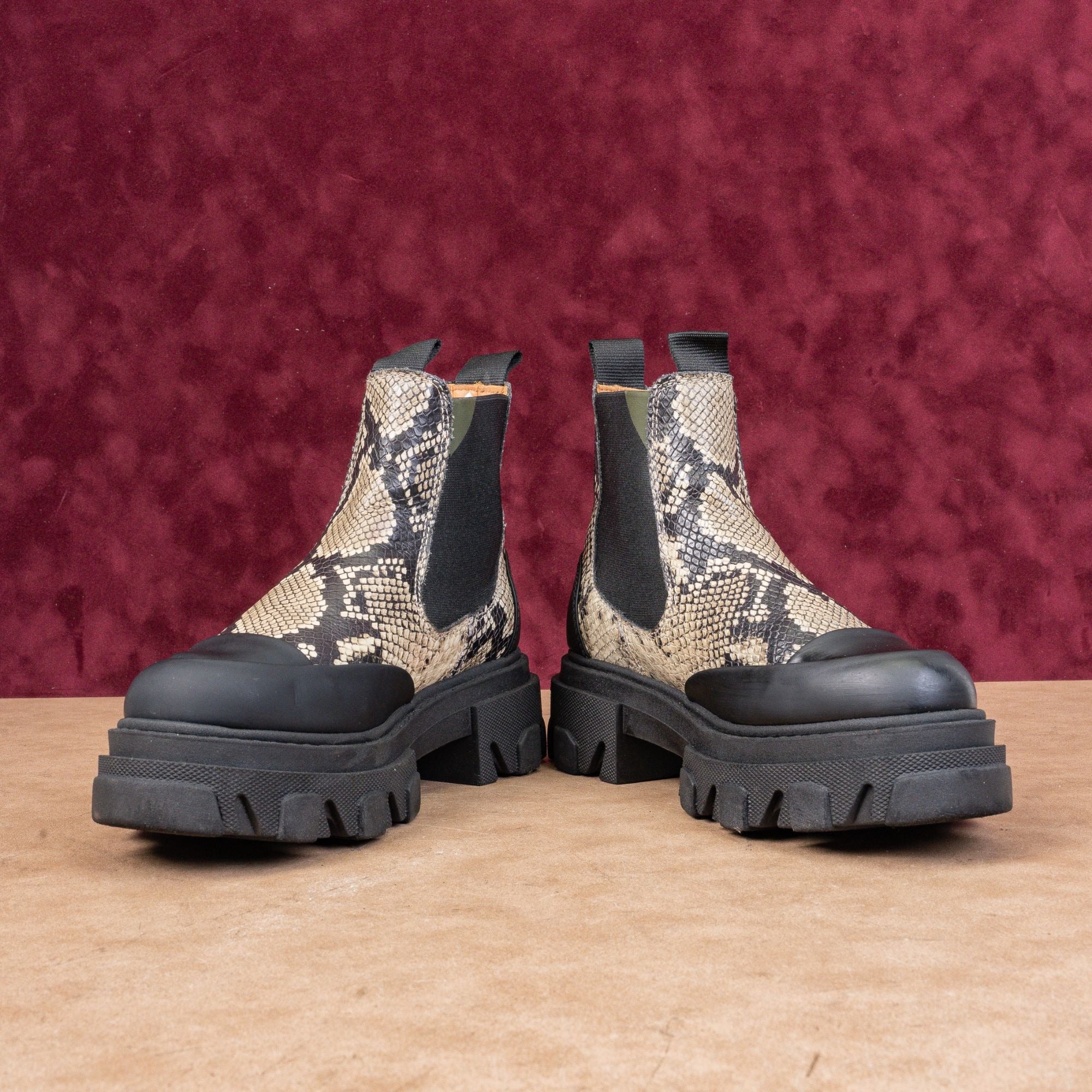Make a bold fashion statement with the Ganni Snake Print Chelsea Boots, where Scandinavian cool meets animal-print edge.