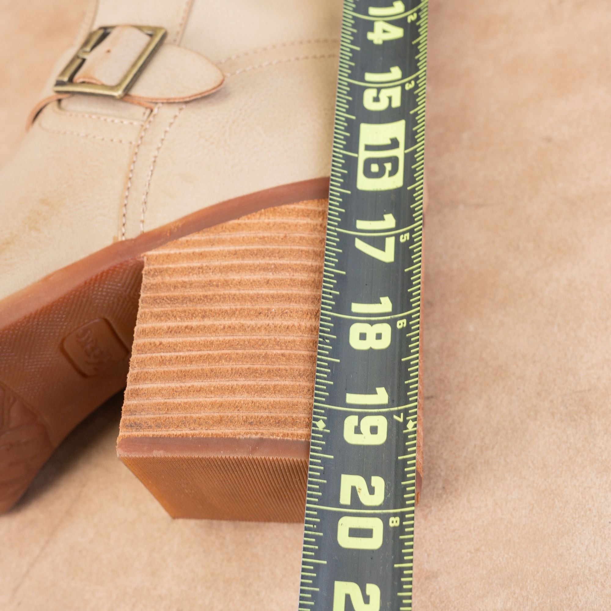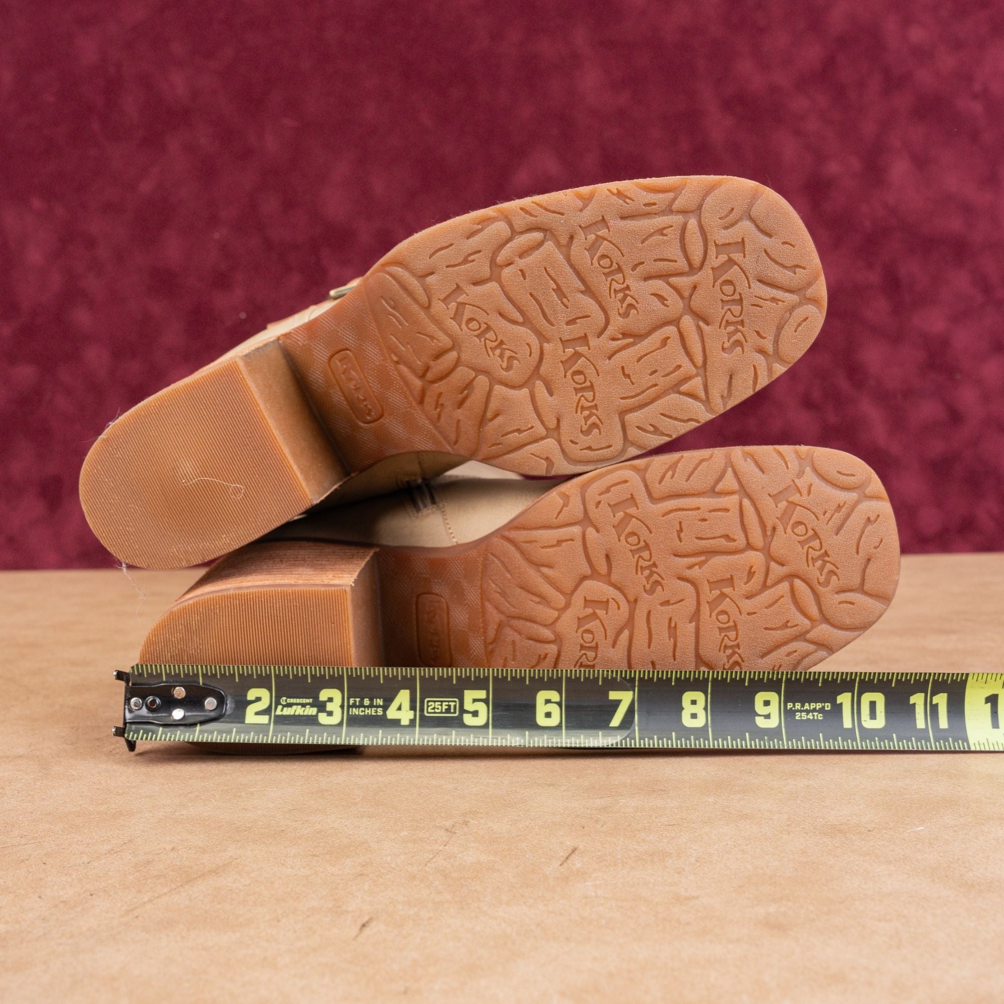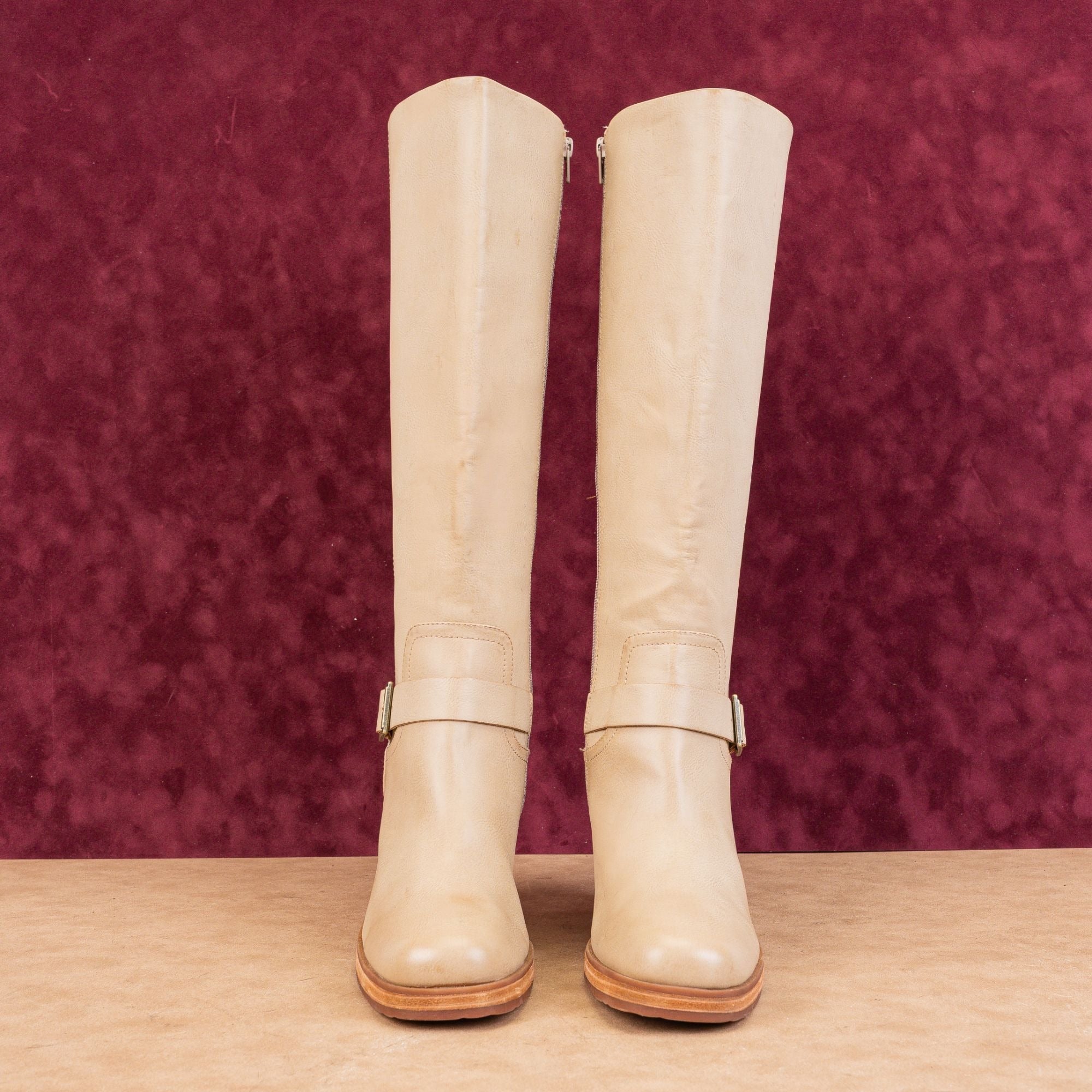 these amazing Korks "Karelyn" knee-high boots, specifically designed with a WIDE CALF in a size 11. They're crafted from a cool distressed cream VEGAN leather (100% cruelty-free!).
