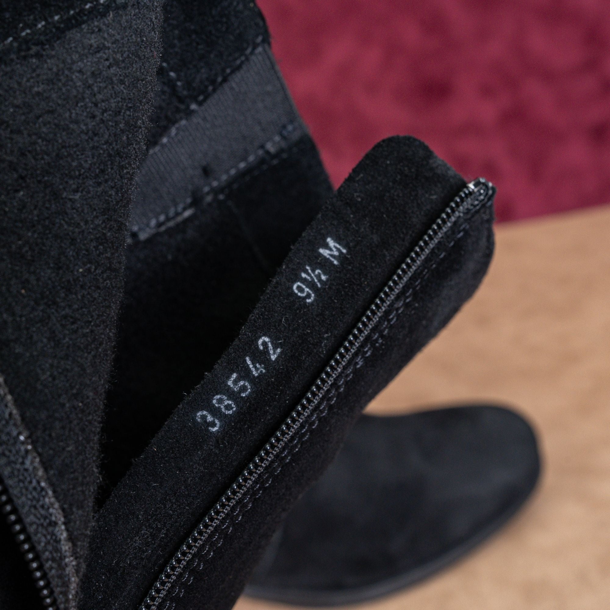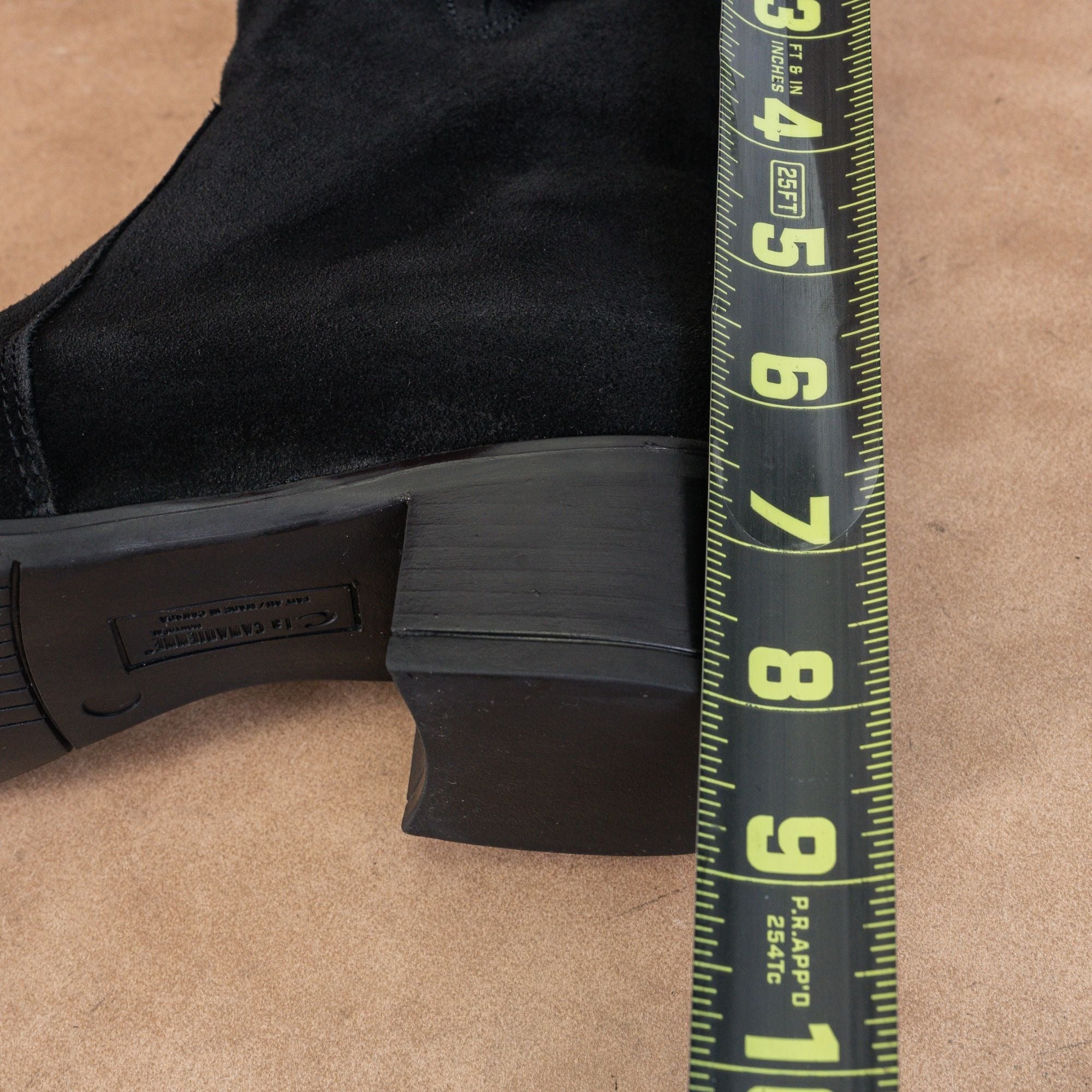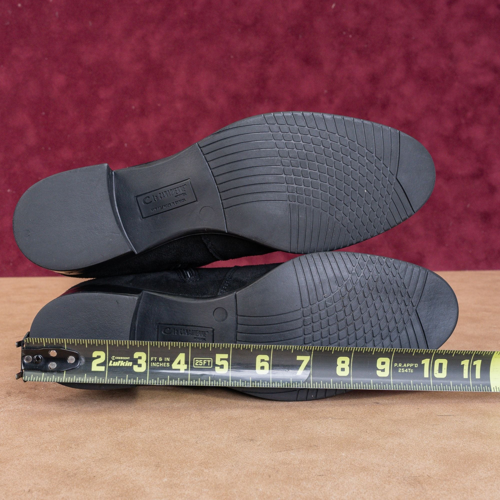 Like New Condition. Minimal signs of wear on the soles. Pre-loved. Made in Canada. Model # Halo. Retail $595. Suede Upper, Fabric Lining and Rubber soles. Side zipper style for easy on and off. SKU 10964