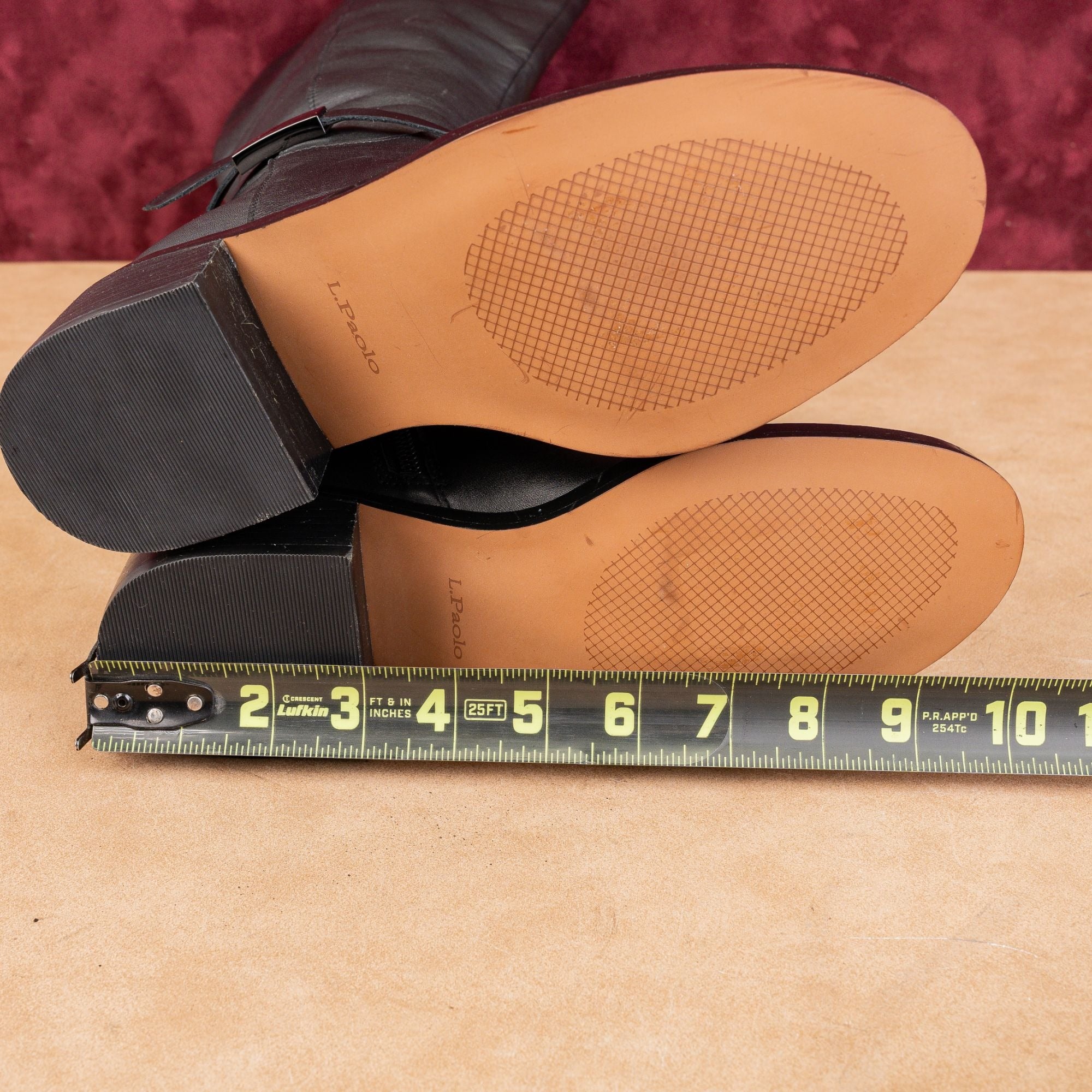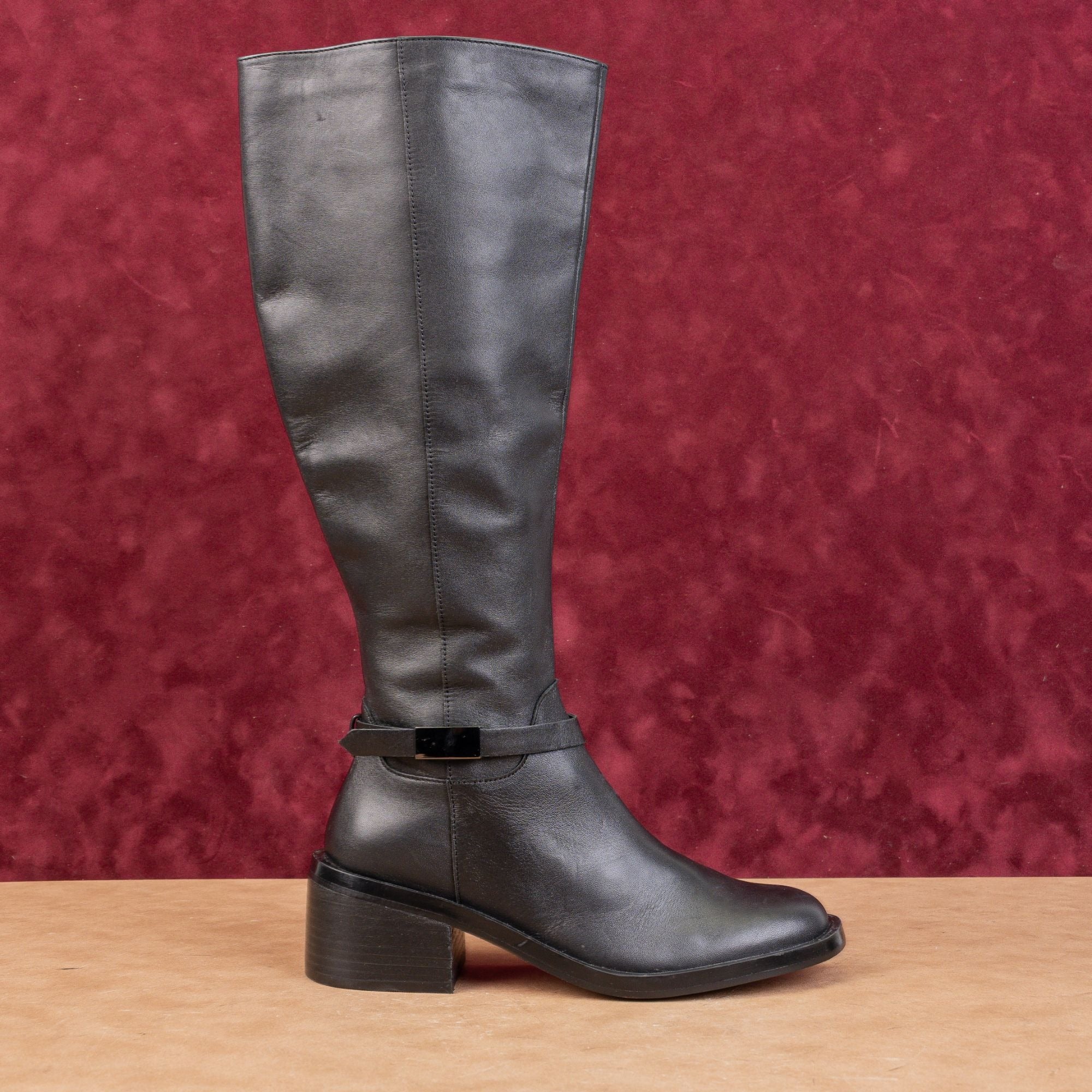 New Condition. No signs of wear on the soles just glue tag residue on the soles. Never-Worn. Wide calf measures 14.50in Model#Kamile. Made in Vietnam. Retail price for $250. Leather upper, Fabric Lining and Synthetic sole. Partial Side zipper for easy on and off. Round Toe Please check photos carefully for more information and details. SKU12235