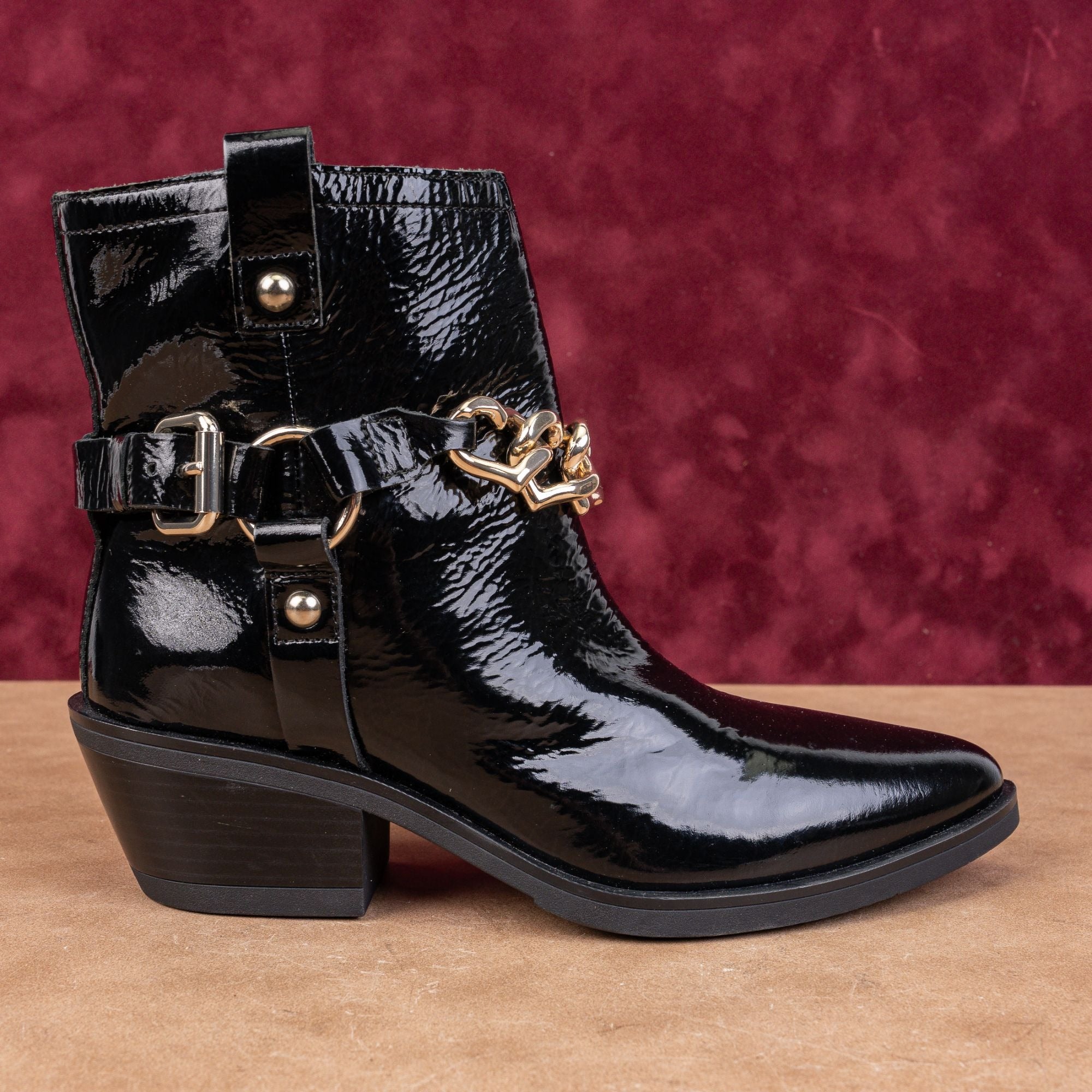 A masterclass in high-fashion subversion, these boots take the rugged DNA of a Western harness boot and reimagine it in liquid-shine black patent leather.