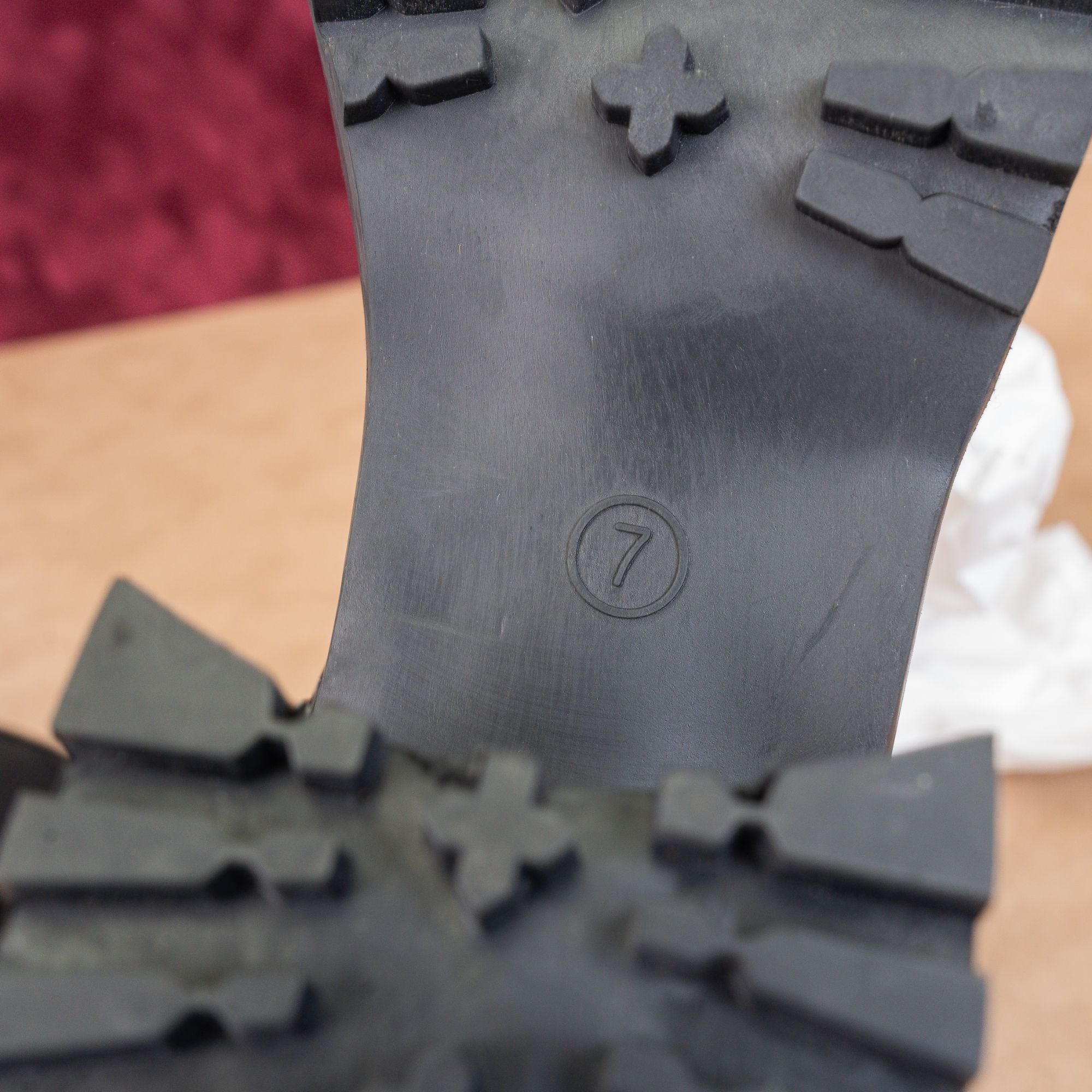 The iconic MIA platform combat boots in a Women's size 7. They're crafted from a durable black VEGAN leather and feature a massive, chunky platform lug sole for that perfect 90s grunge look.
