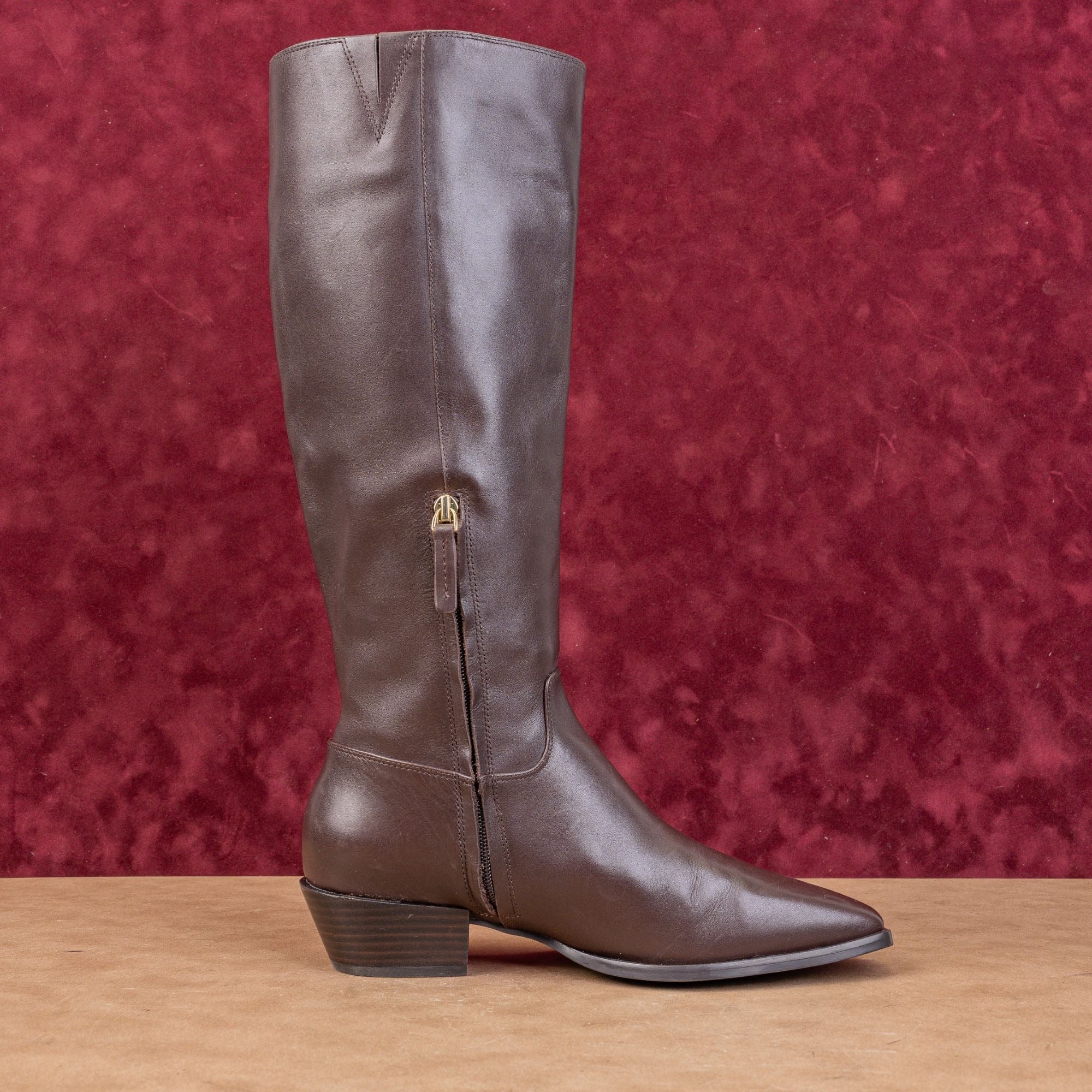 These boots offer a sophisticated take on the cowboy trend, featuring a classic almond-shaped pointed toe and a perfectly pitched stacked block heel.