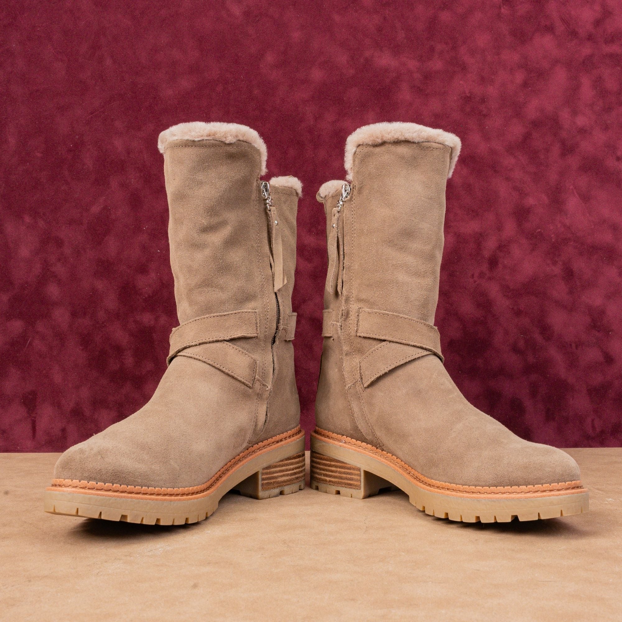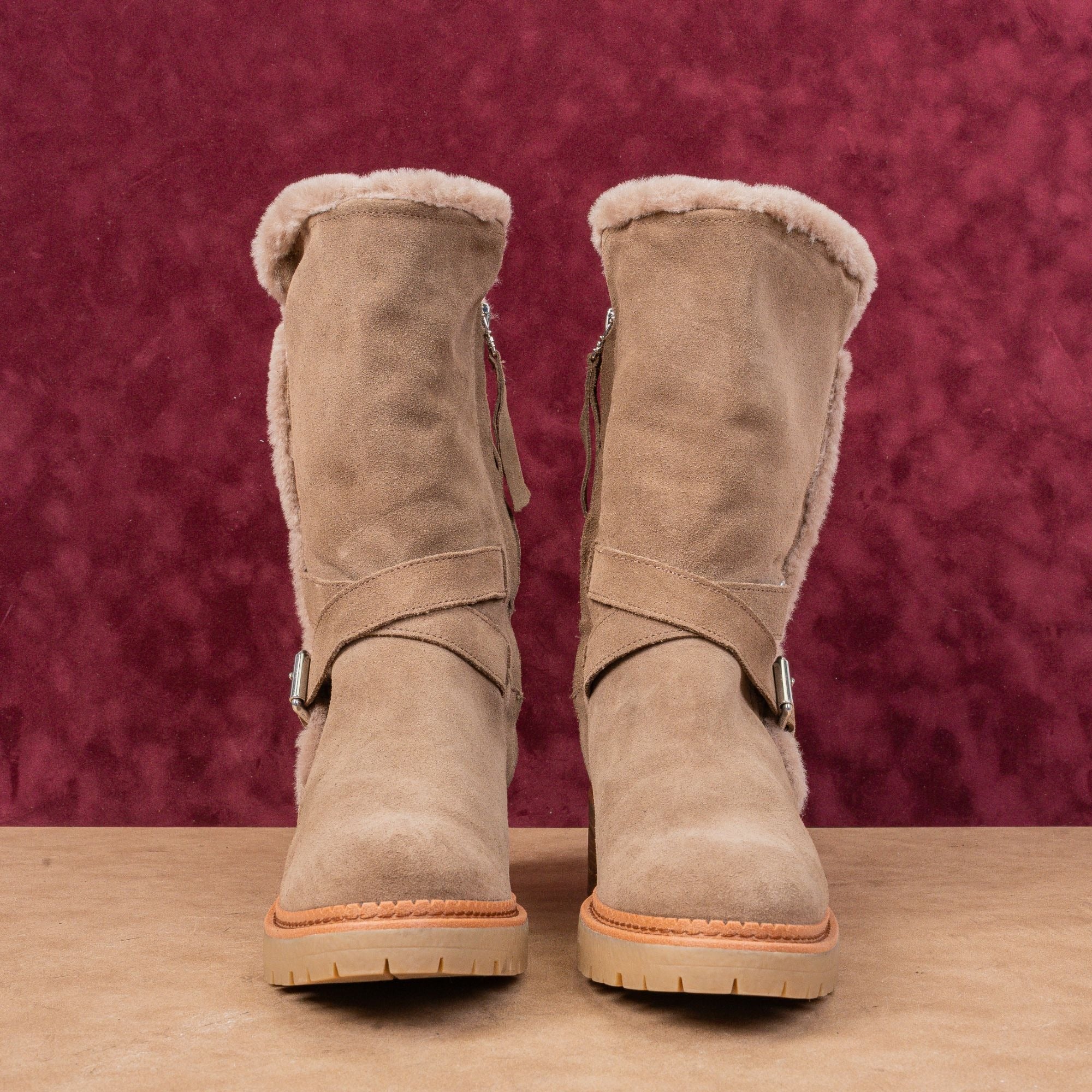 Like New Condition. Minimal signs of wear on the soles. Pre-Loved Retails for $220. Suede upper, Faux Fur Fabric lining and Rubber sole. Made in China. Side zipper closure for easy on and off. Round Toe. Please check photos carefully for more information and details. SKU11492