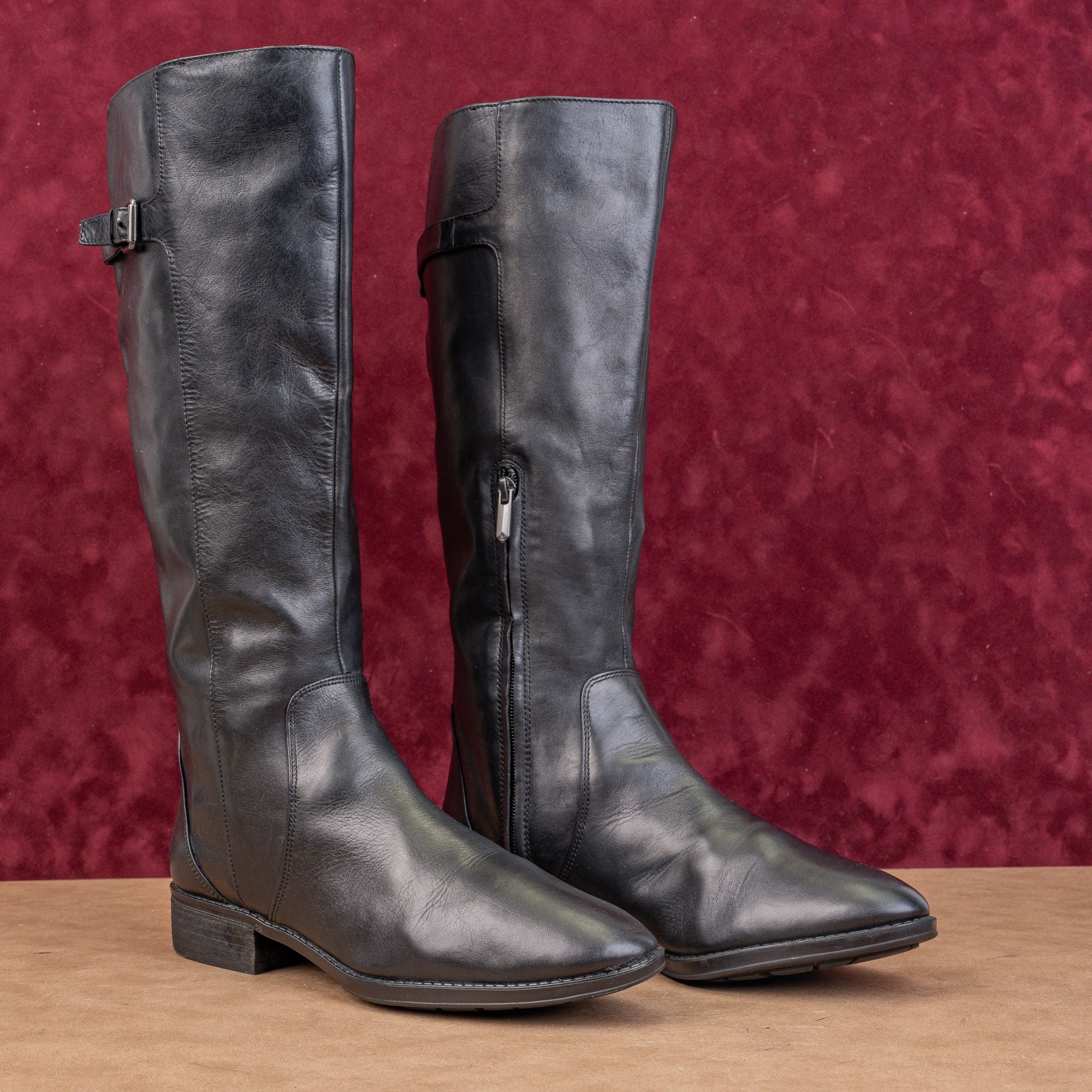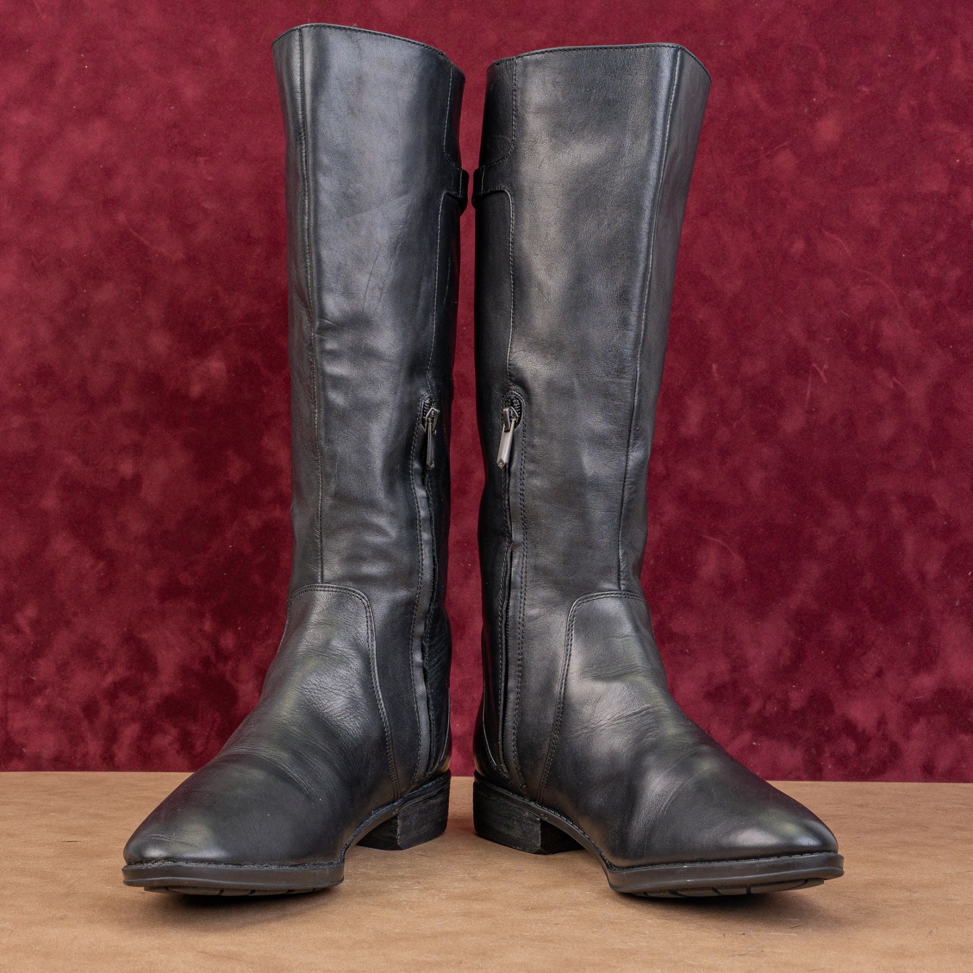These boots are a sophisticated take on the traditional equestrian silhouette, featuring a sleek, tall shaft and a polished rounded toe.