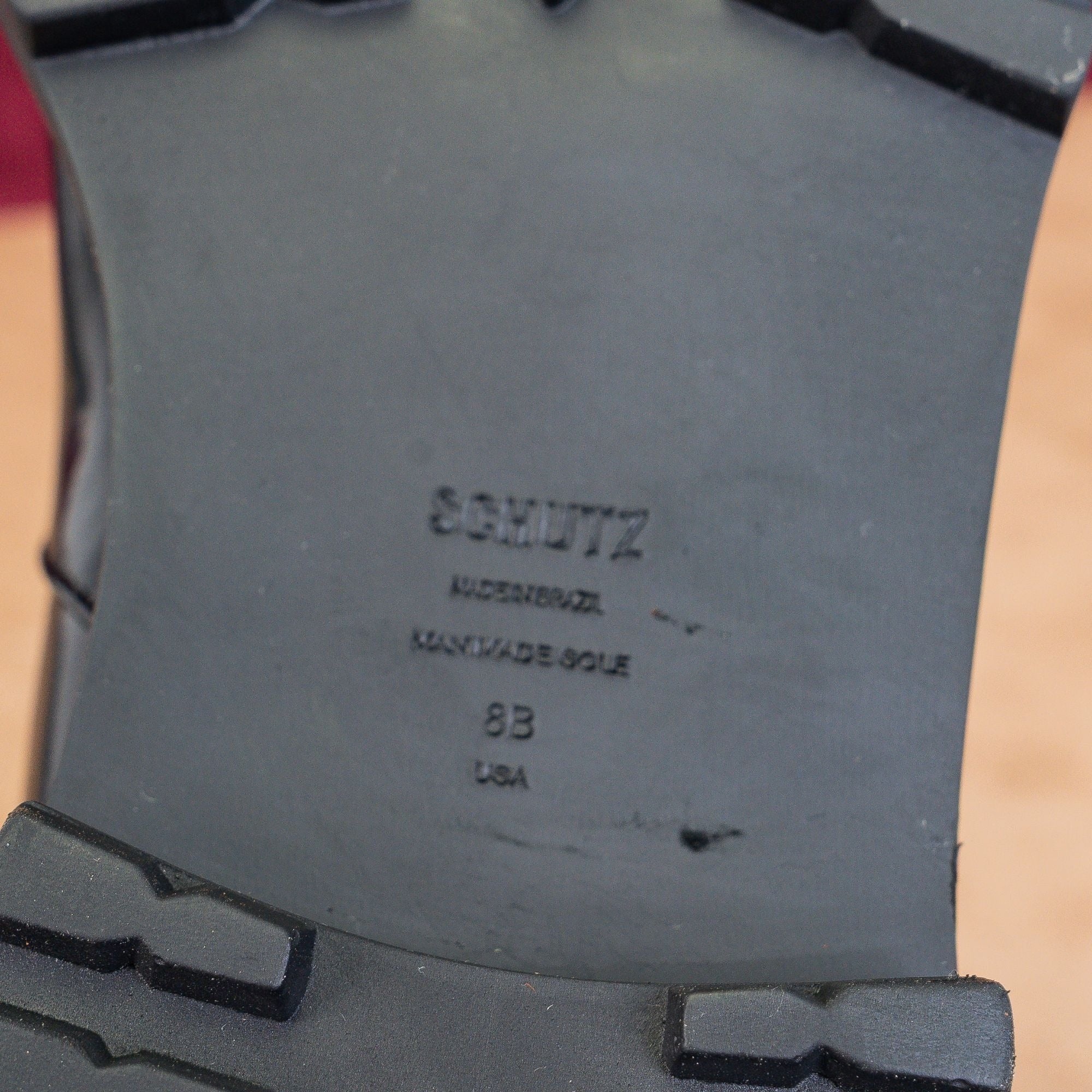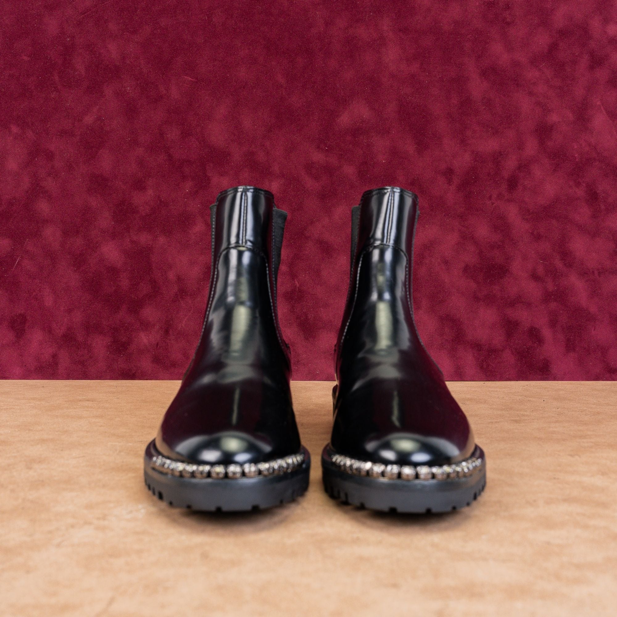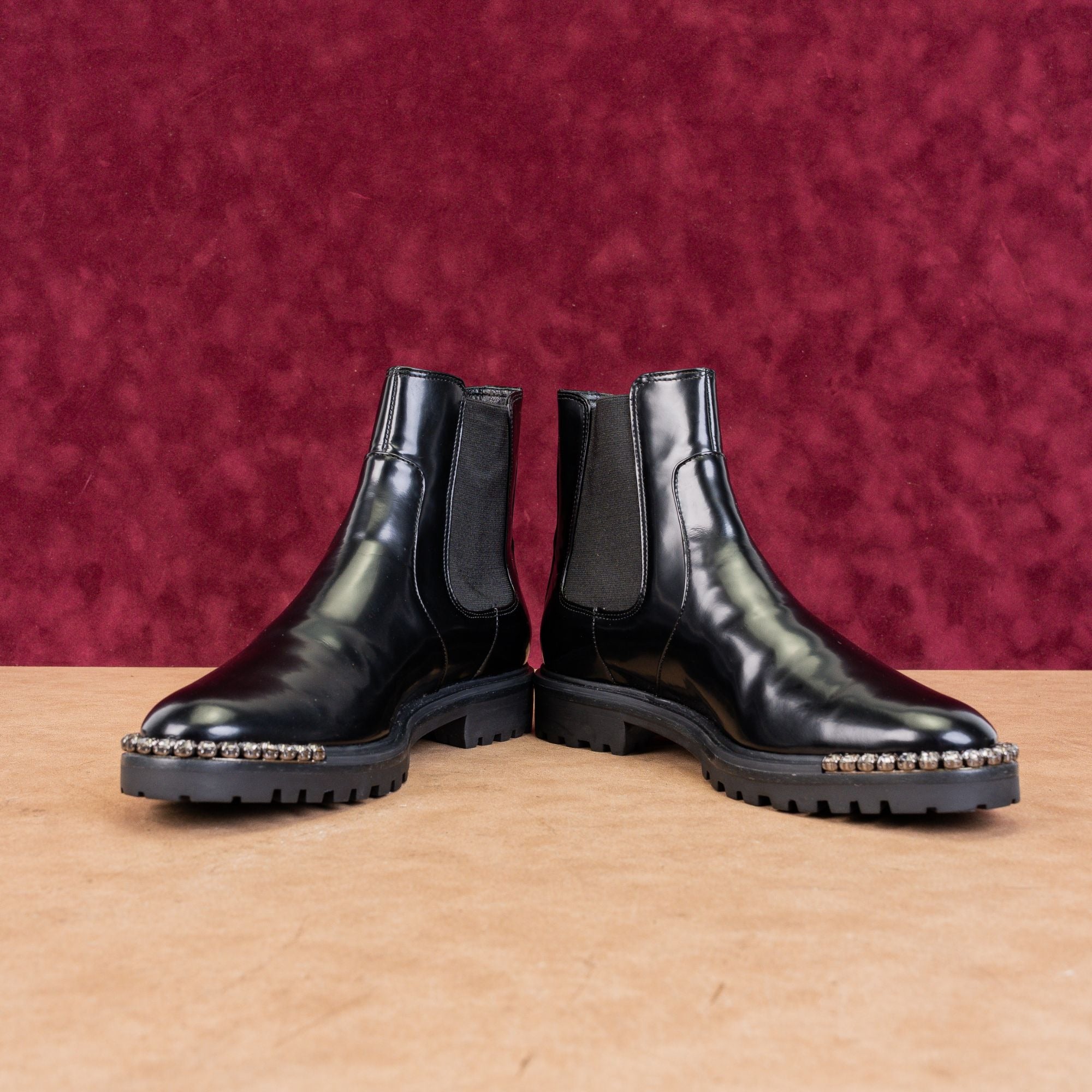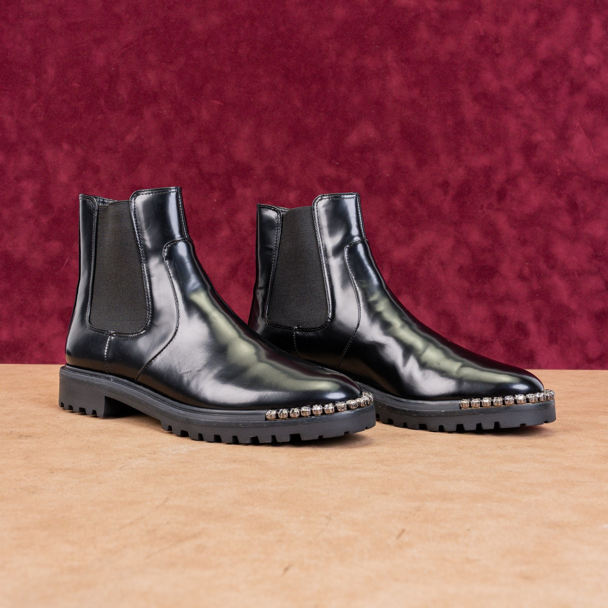 Selling these absolutely insane Schutz "Daisha" boots in a Women's size 8. The classic chunky lug sole Chelsea boot silhouette is completely covered in sparkling crystals/rhinestones over a shiny black patent leather base.