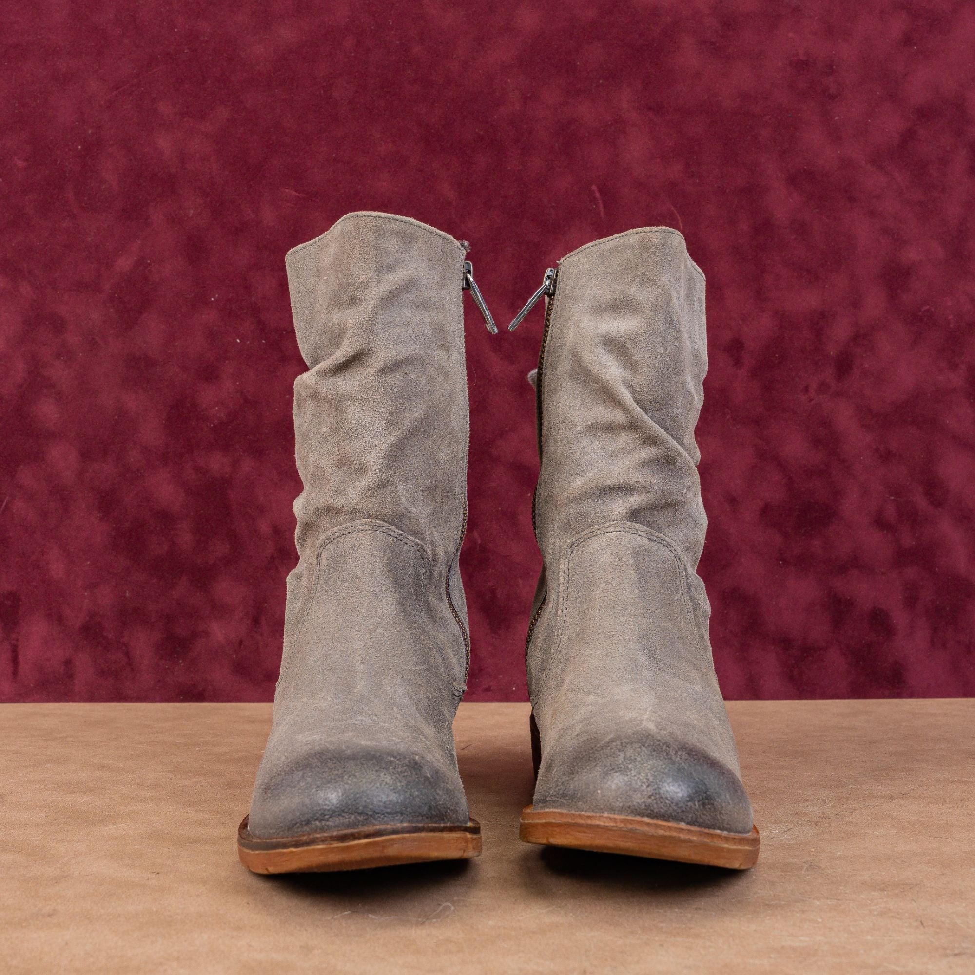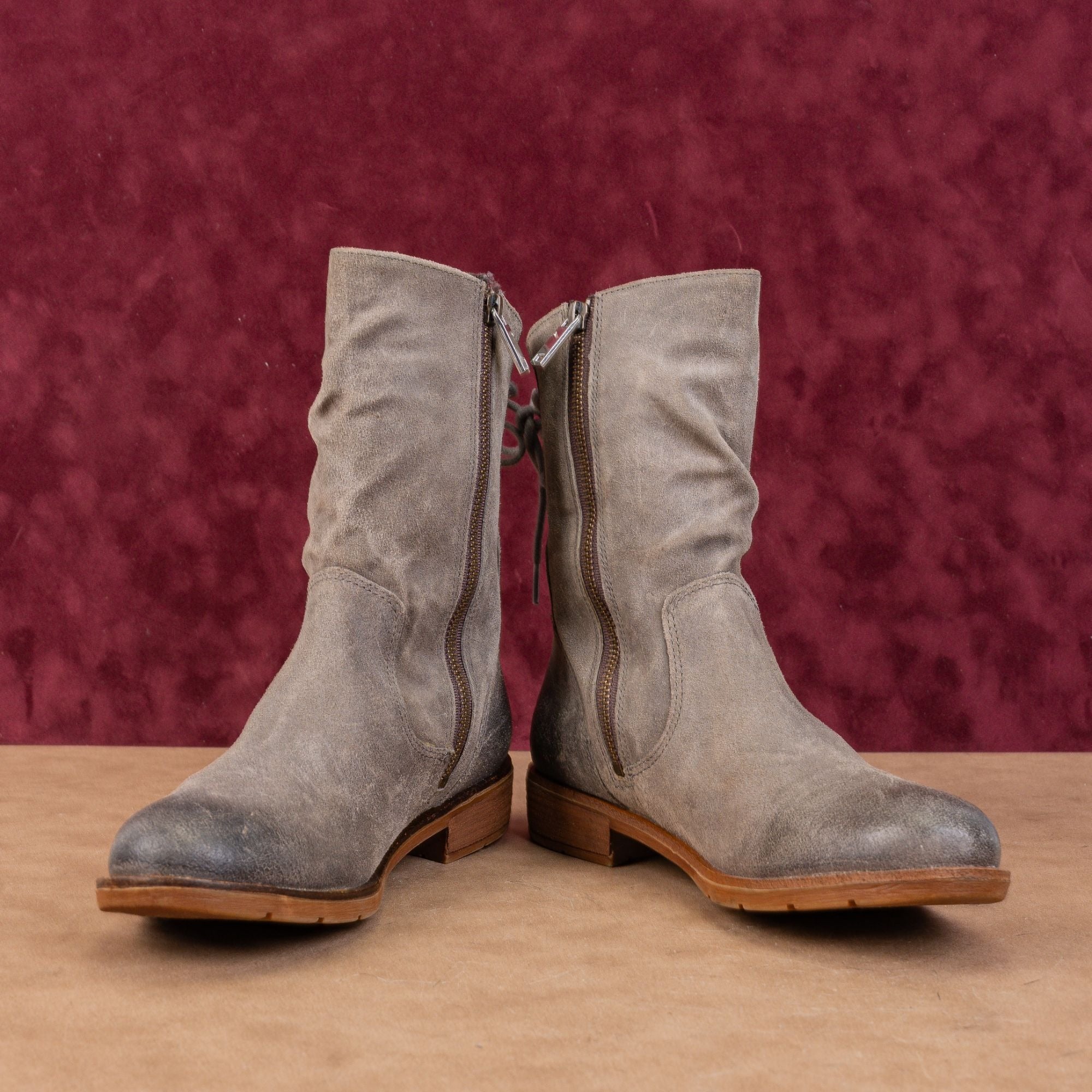 Crafted from buttery-soft distressed suede in a versatile smoky grey, these mid-calf boots feature a signature full-back lace system that allows you to adjust the circumference for a narrow or wide calf fit.
