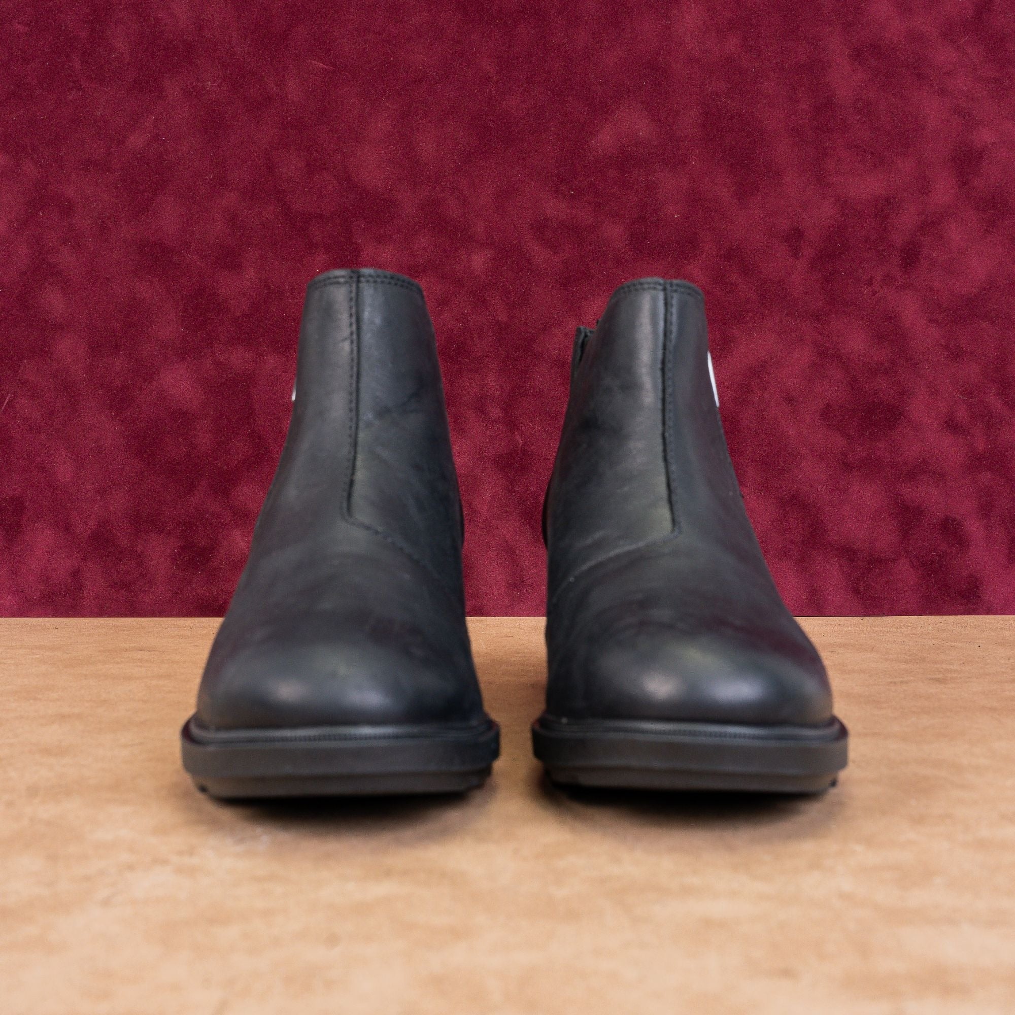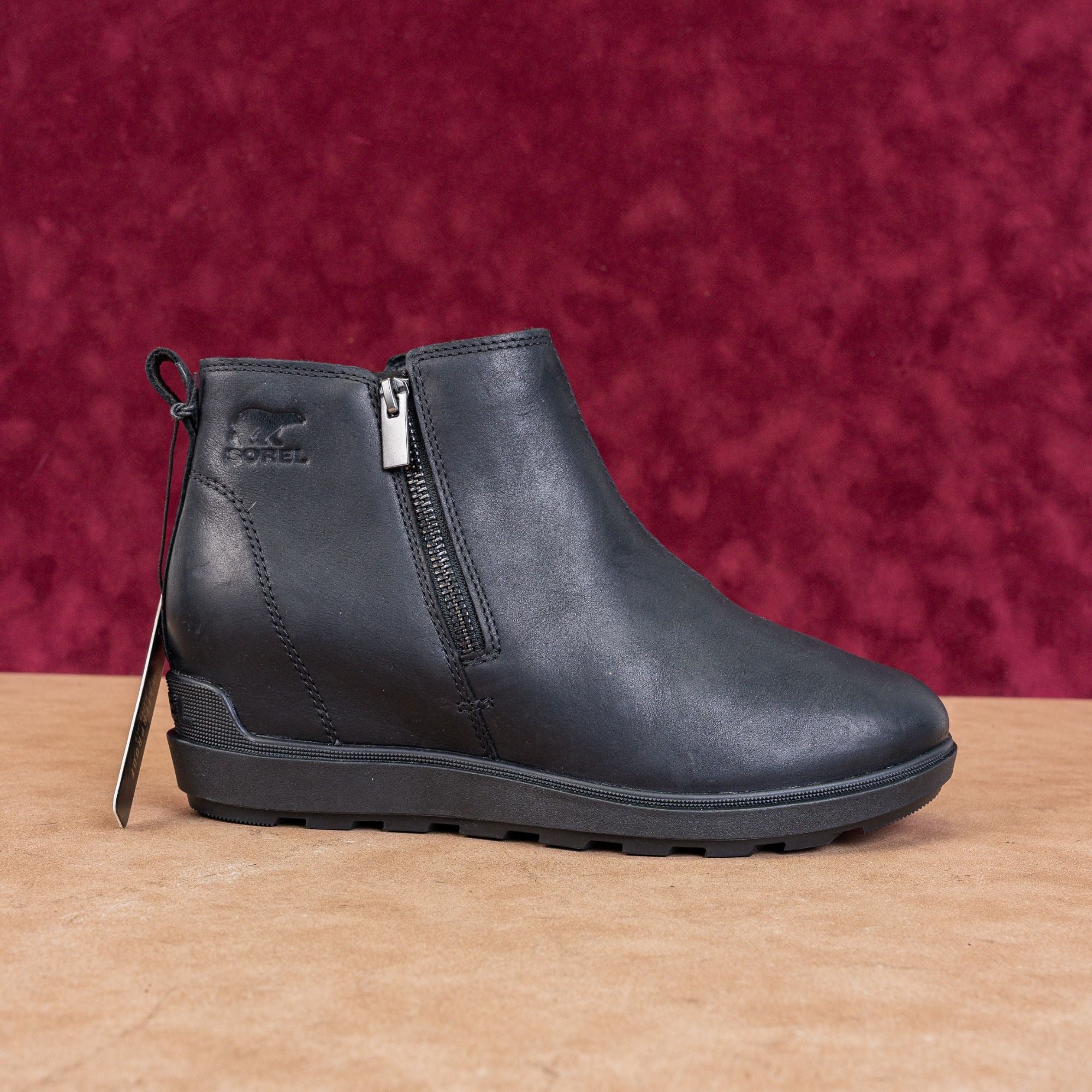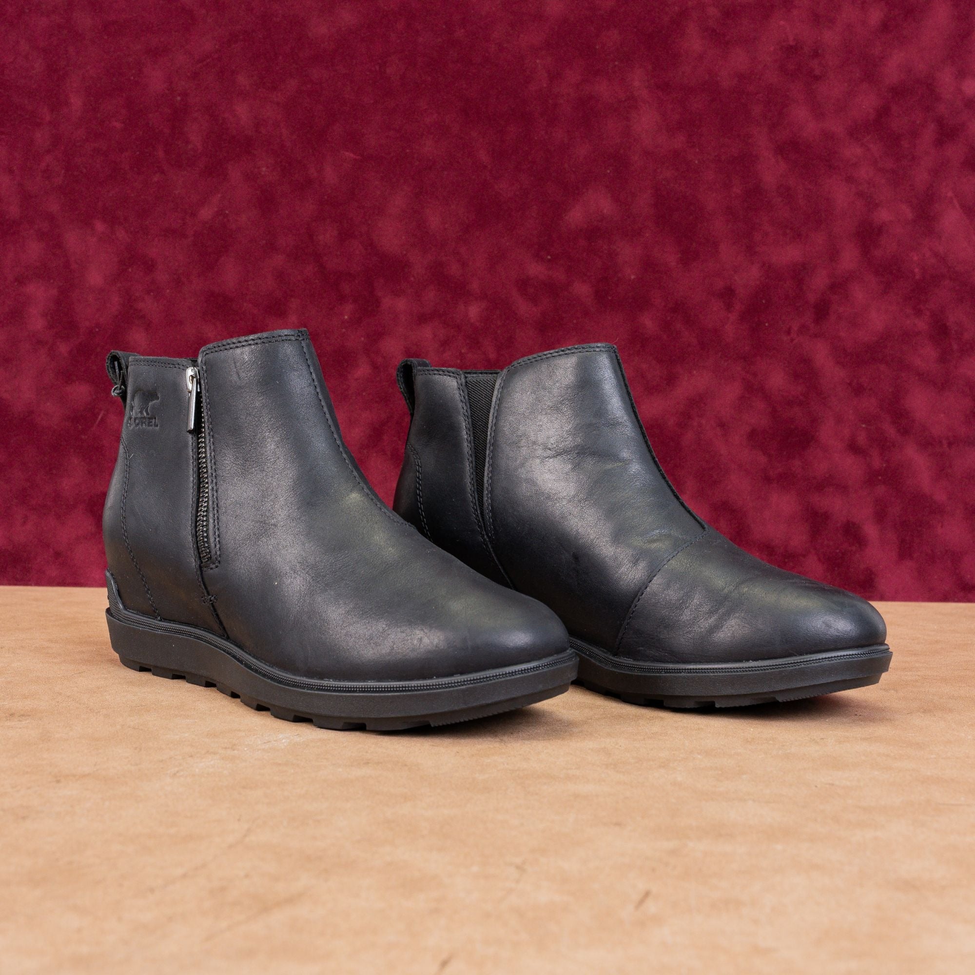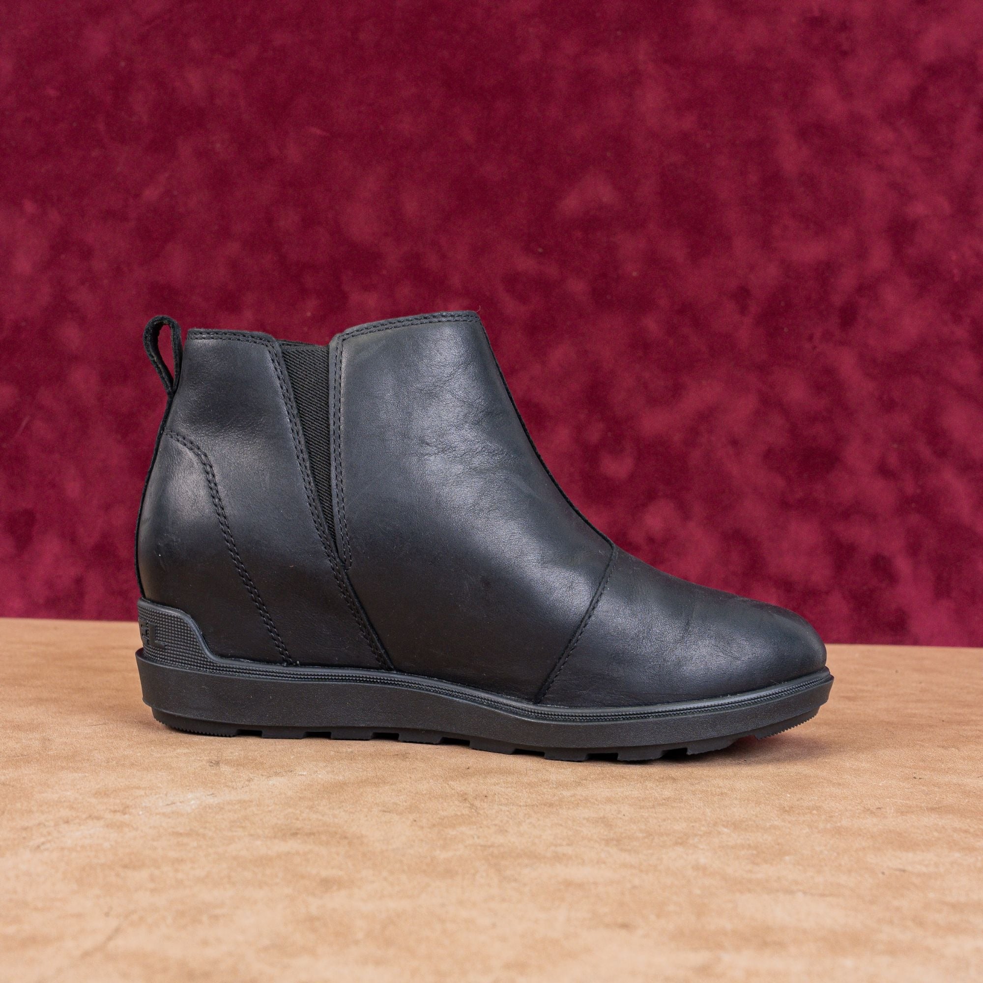 Sorel's Evie II black leather ankle boots (size 10) feature a side zip and cushioned footbed - perfect for spring showers. Water-resistant and work-ready.