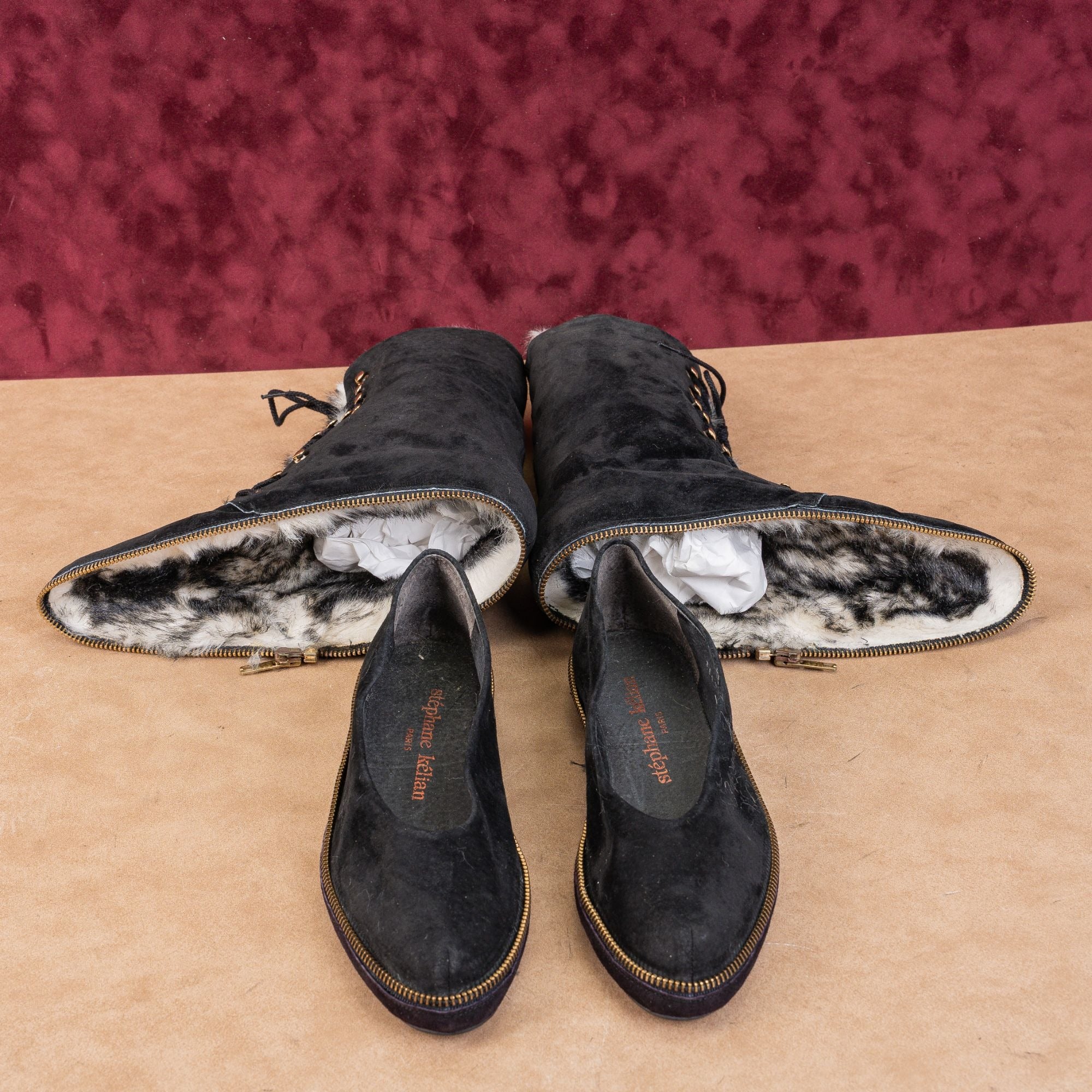 The Stephane Kelian Convert Boot Loafer in soft black suede offers the perfect hybrid of a sophisticated loafer and a sleek bootie. Featuring a comfortable heel or subtle platform. Made in France.