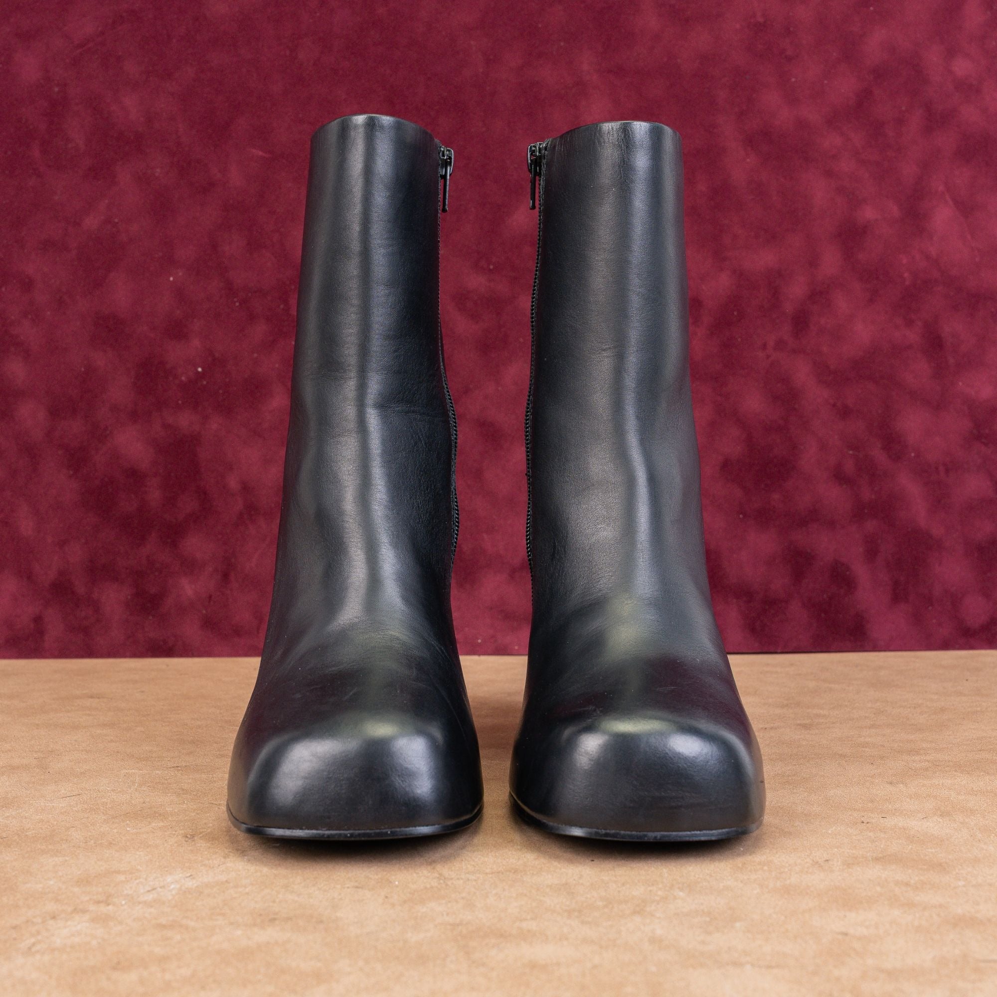 the iconic Steve Madden "Cami" ankle boots in a Women's size 9.5. If you lived through the 90s, you know this boot. It's the perfect retro silhouette crafted from classic black leather with that essential chunky block heel.