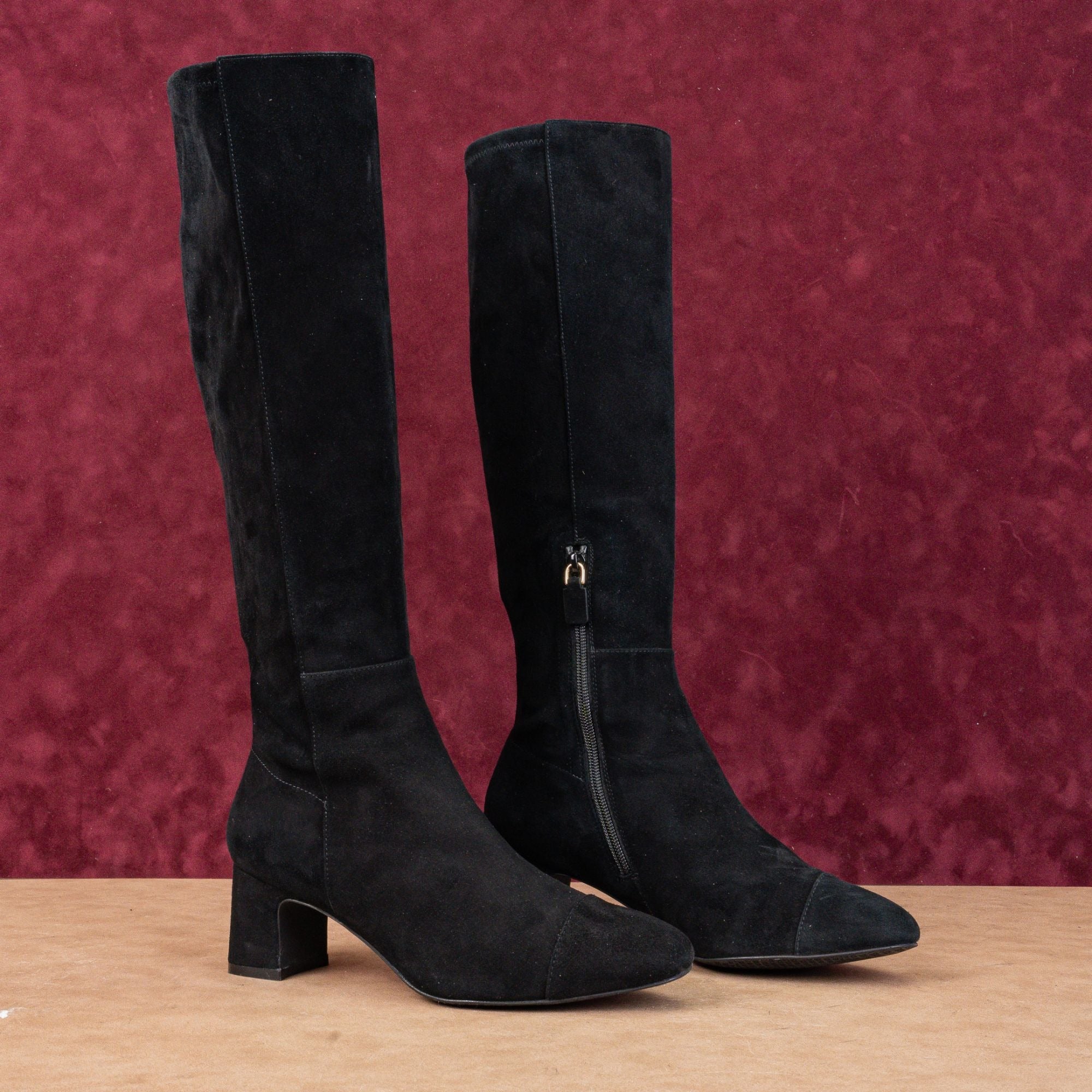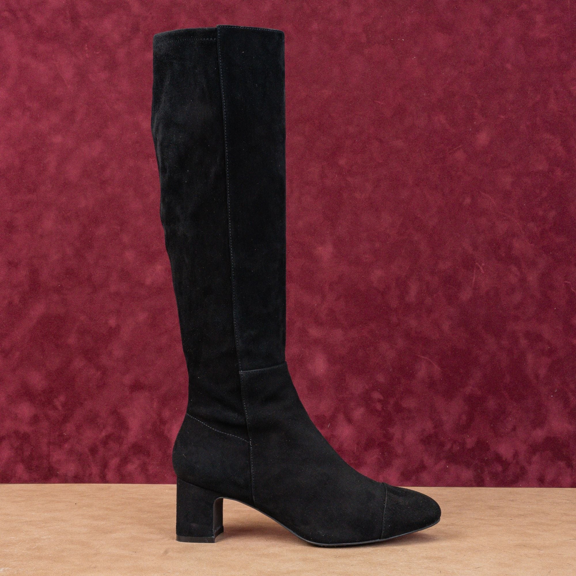 Crafted from premium black suede, this timeless tall boot features a walkable block heel and a sleek silhouette. A full side zip makes for effortless, polished style.