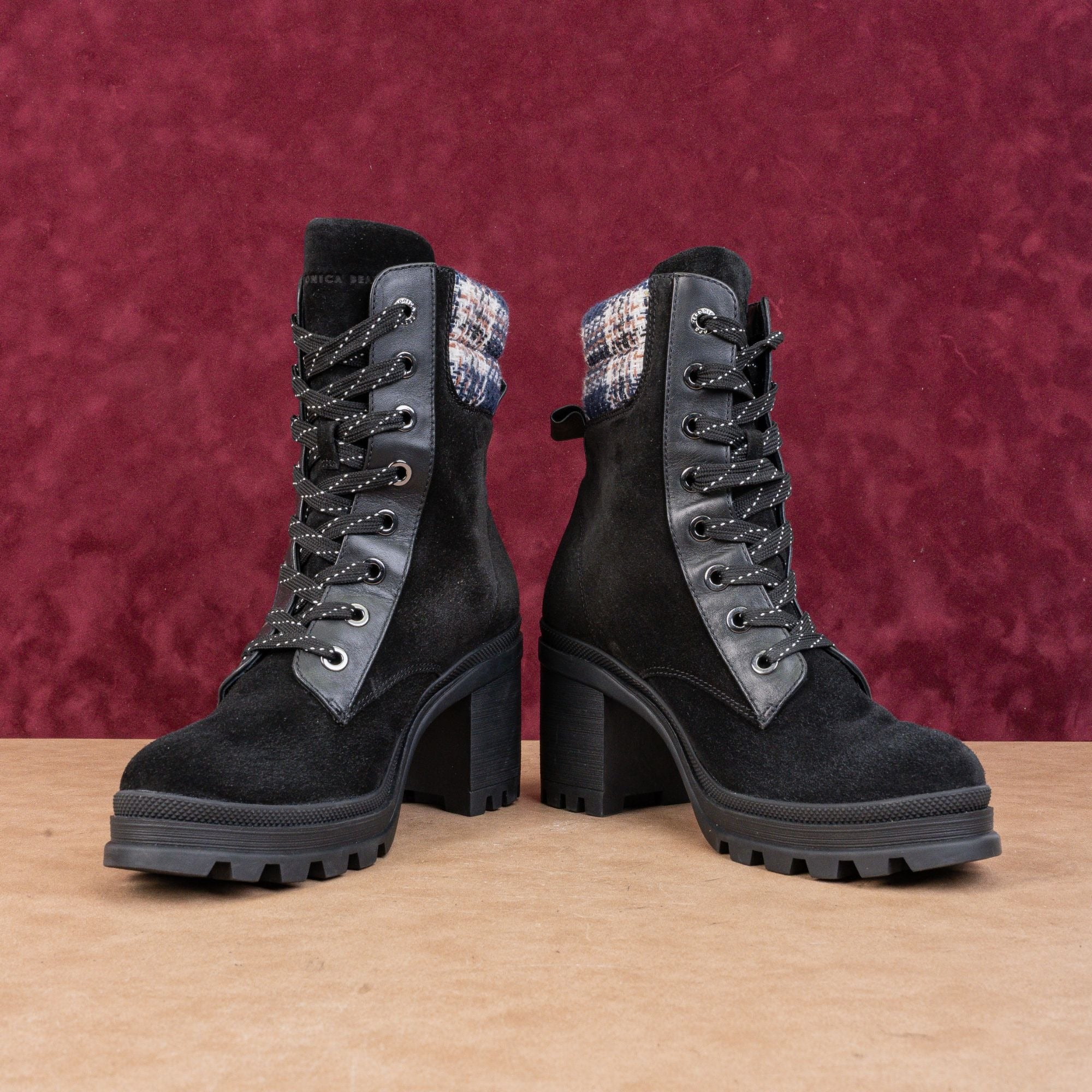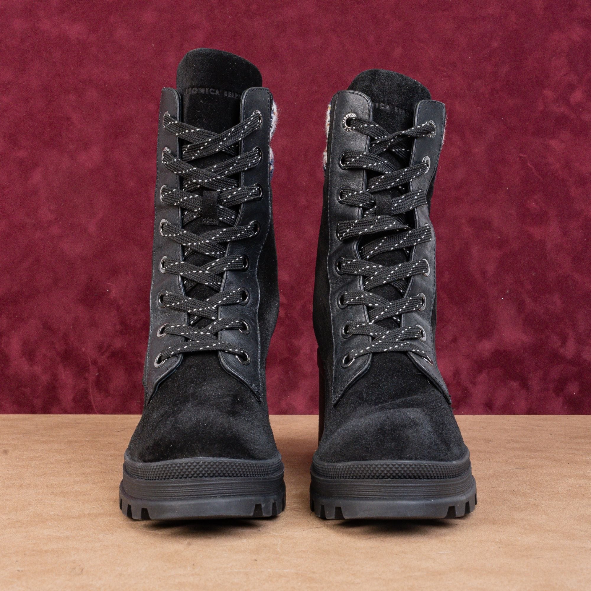 New Condition. No signs of wear on the soles. Never-Worn. Retails for $495 Made in China. Chunky Heel Hiking Style. Leather Upper, fabric lining and synthetic soles. Lace-up style for easy on and off. Round Toe. SKU11655