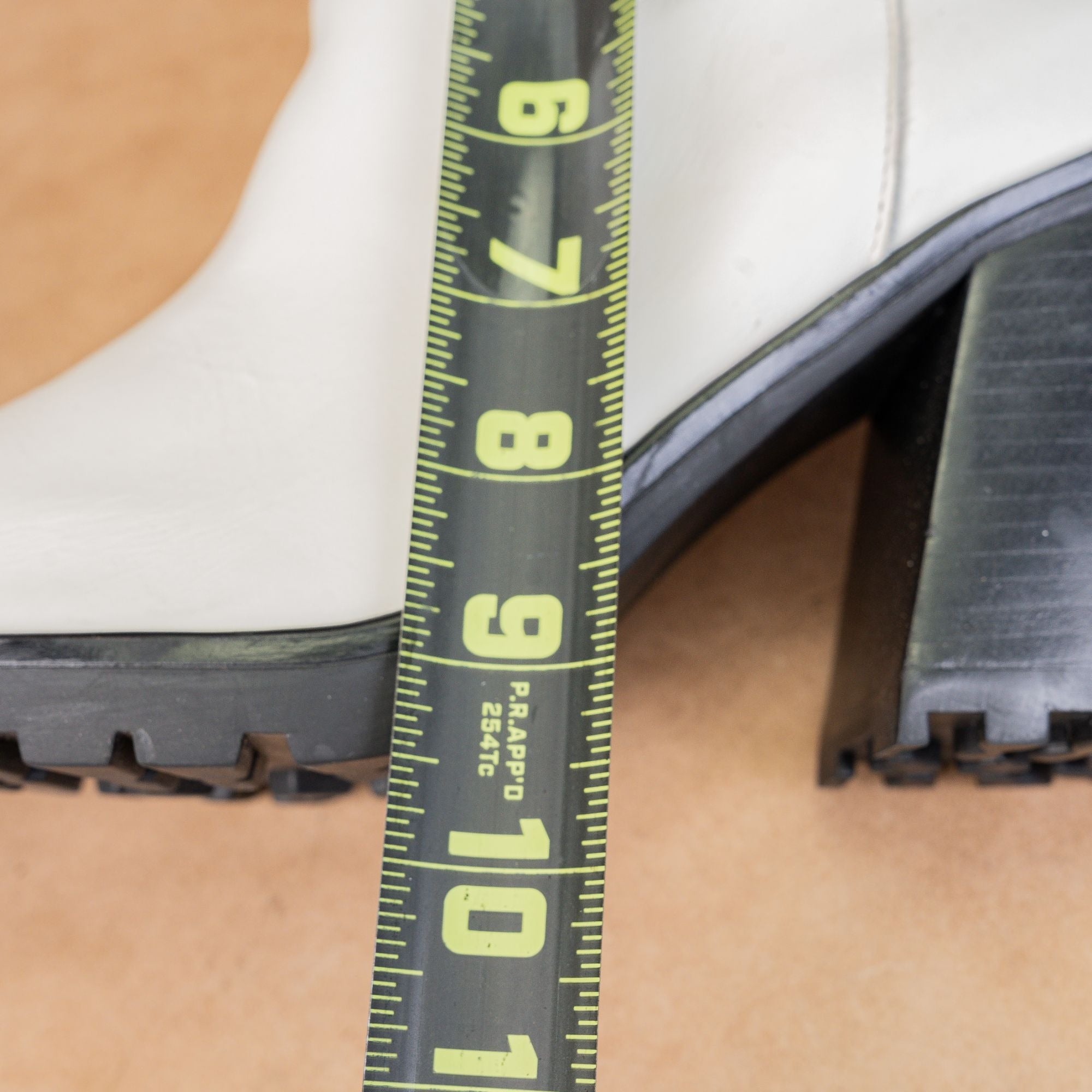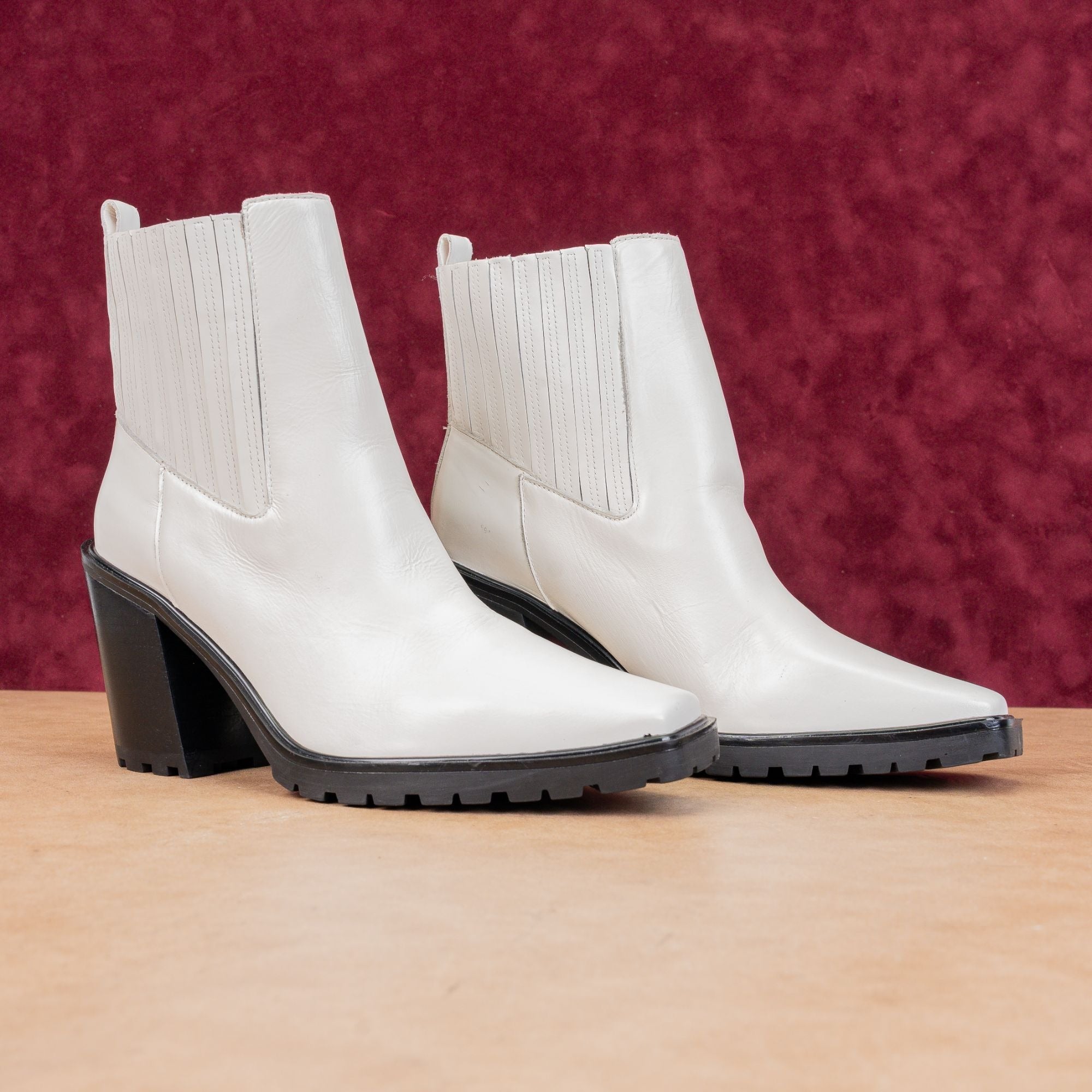 Crafted from chic white leather, this on-trend bootie blends a '90s-inspired square toe and chunky block heel with the modern-western vibe of a Chelsea boot. The perfect high-fashion staple.