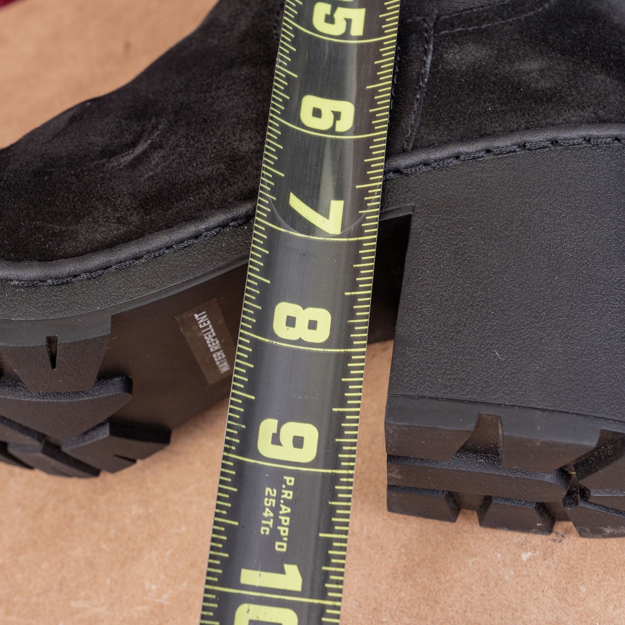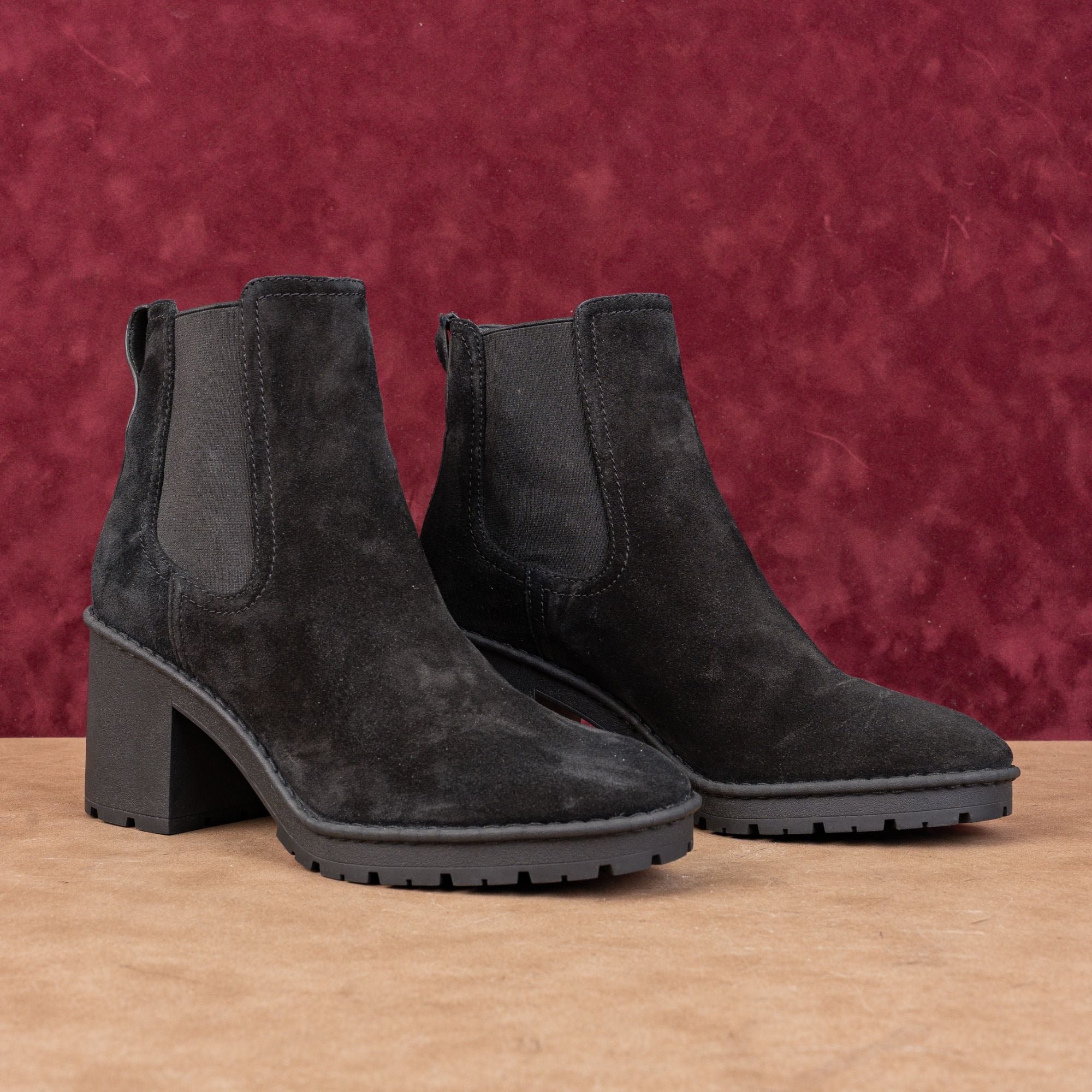 Crafted from premium waterproof black leather, this chic boot features a trendy chunky lug sole and a comfortable block heel. The ultimate blend of modern utility and effortless luxury.