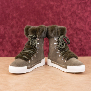 Cecilia NY Women Seymore Olive Green Suede Plush Faux Fur Cuff Lace-up Boots sz 9