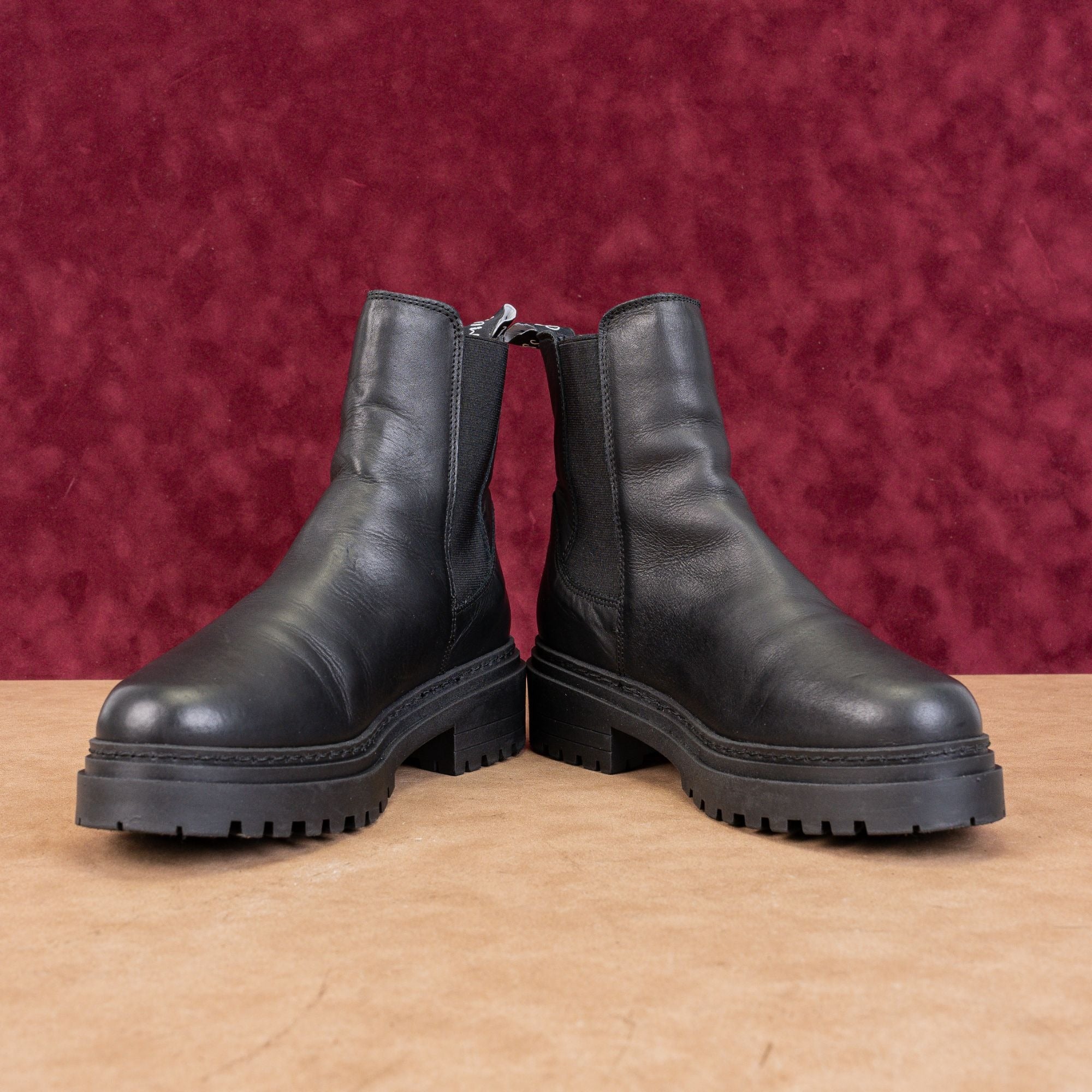 They're crafted from a durable, classic black leather and feature a massive, on-trend platform lug sole that's both stylish and practical for city streets.