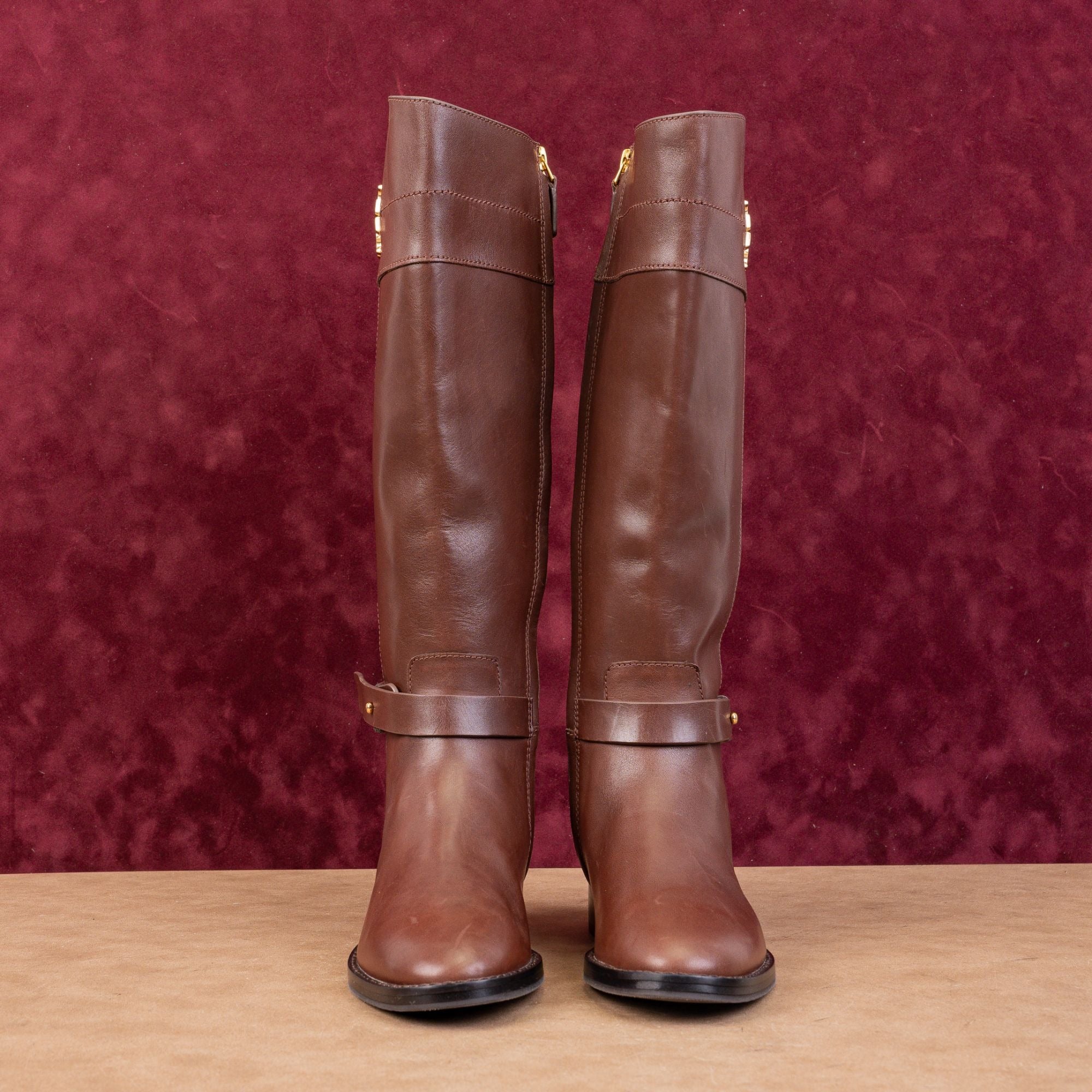 New Condition. No signs of wear on the soles. Wide Calf measures 14.25in. Never Worn. Retails for $395. Made in Vietnam. Leather Upper, Fabric lining and Leather soles. Round Toe. Partial side zipper style for easy on and off. Round Toe. For more information please check every single photo for condition. SKU12089
