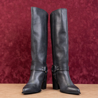 Steve Madden Women Lolly Black Leather Harness Moto Pointy toe Knee Boots sz 6