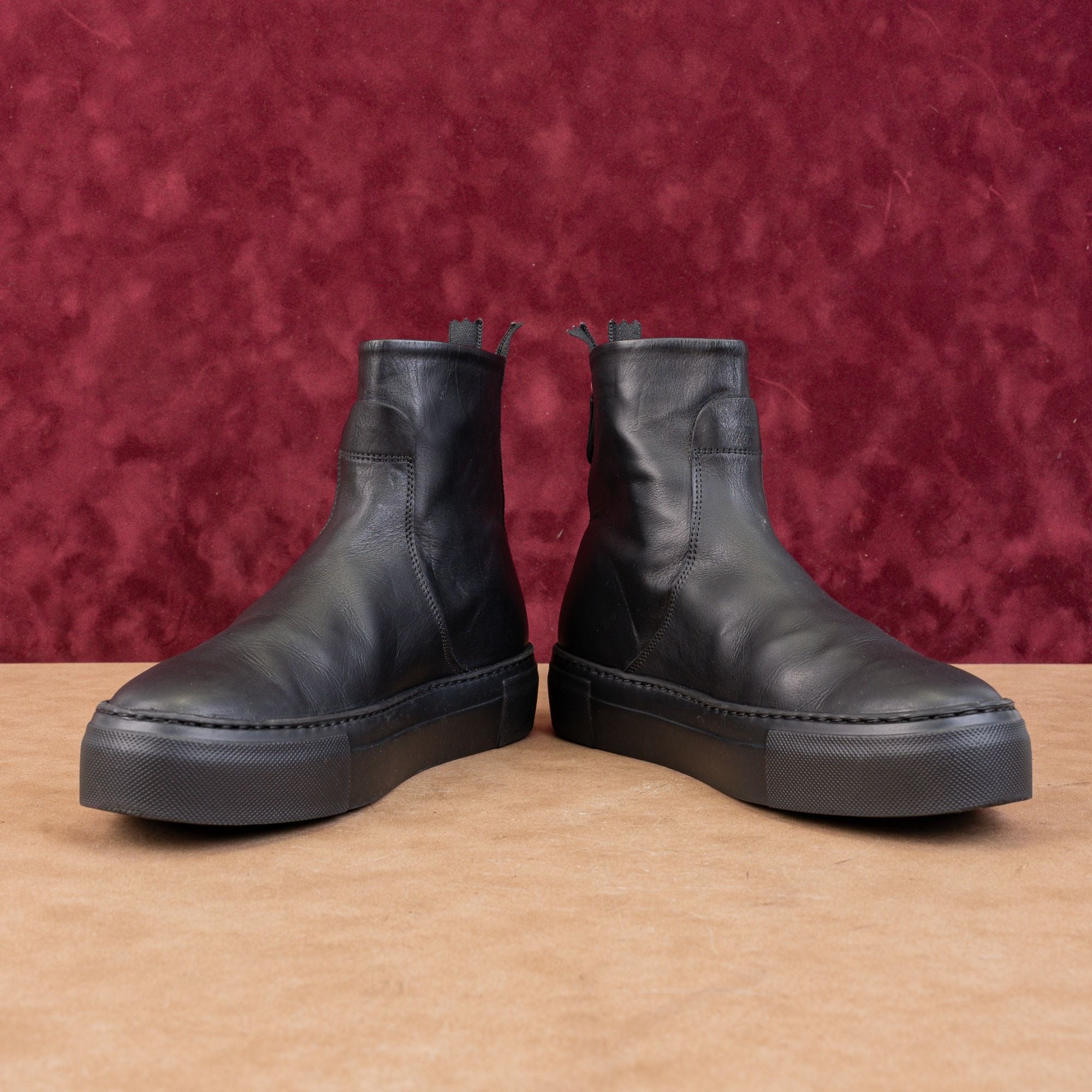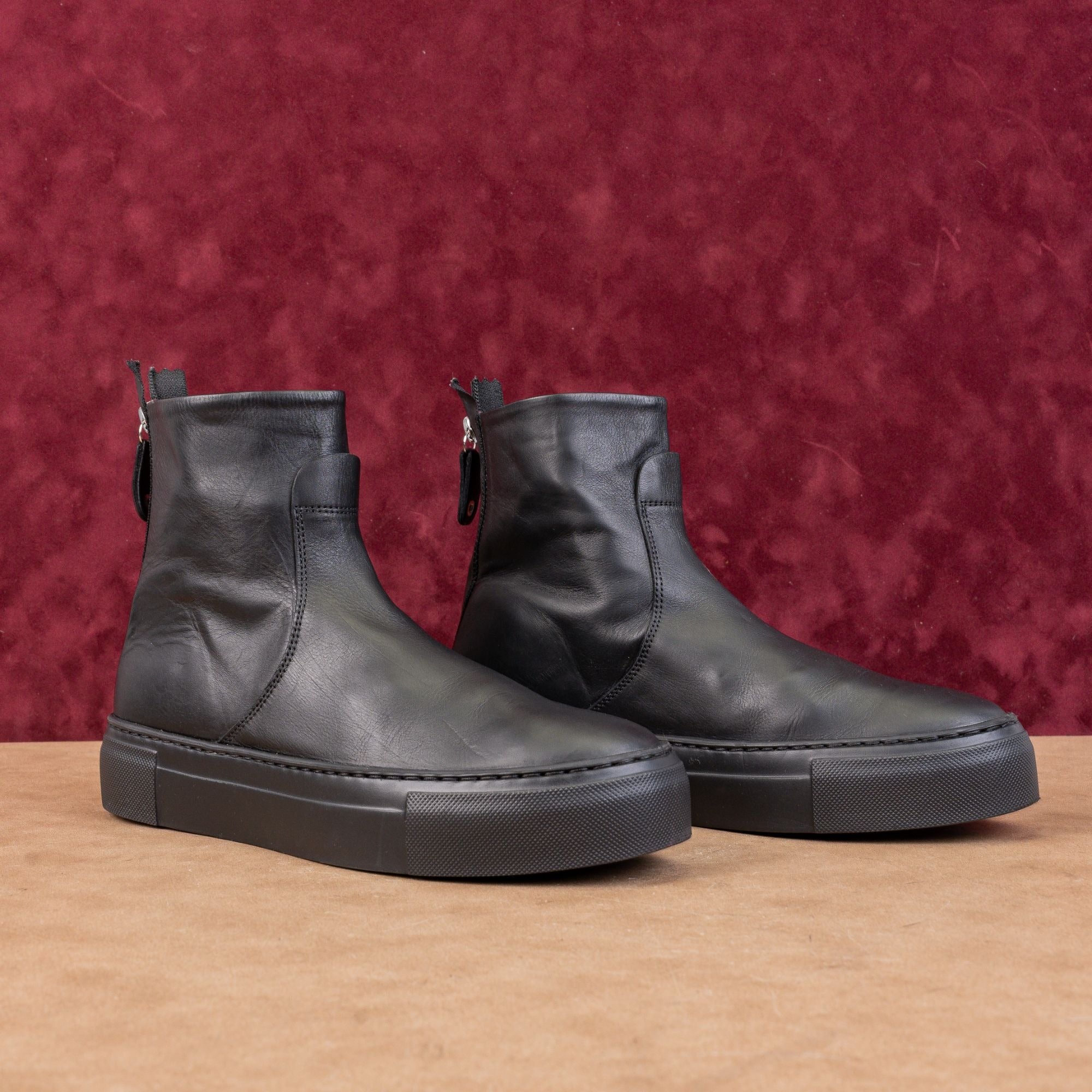 Defined by a sleek, minimalist upper and a striking full-length industrial back zipper, these boots offer a streamlined silhouette that bridges the gap between a high-fashion bootie and a luxury sneaker.
