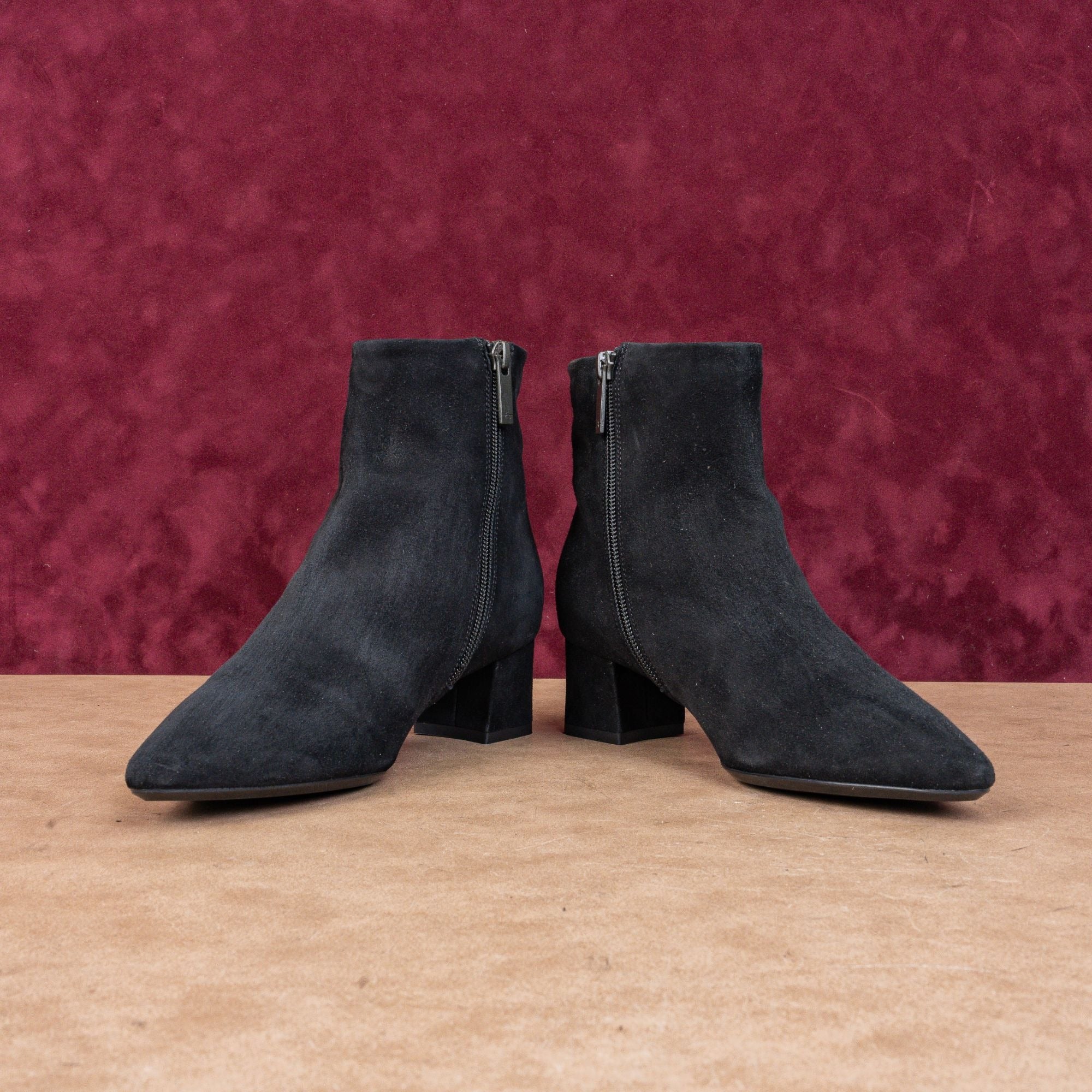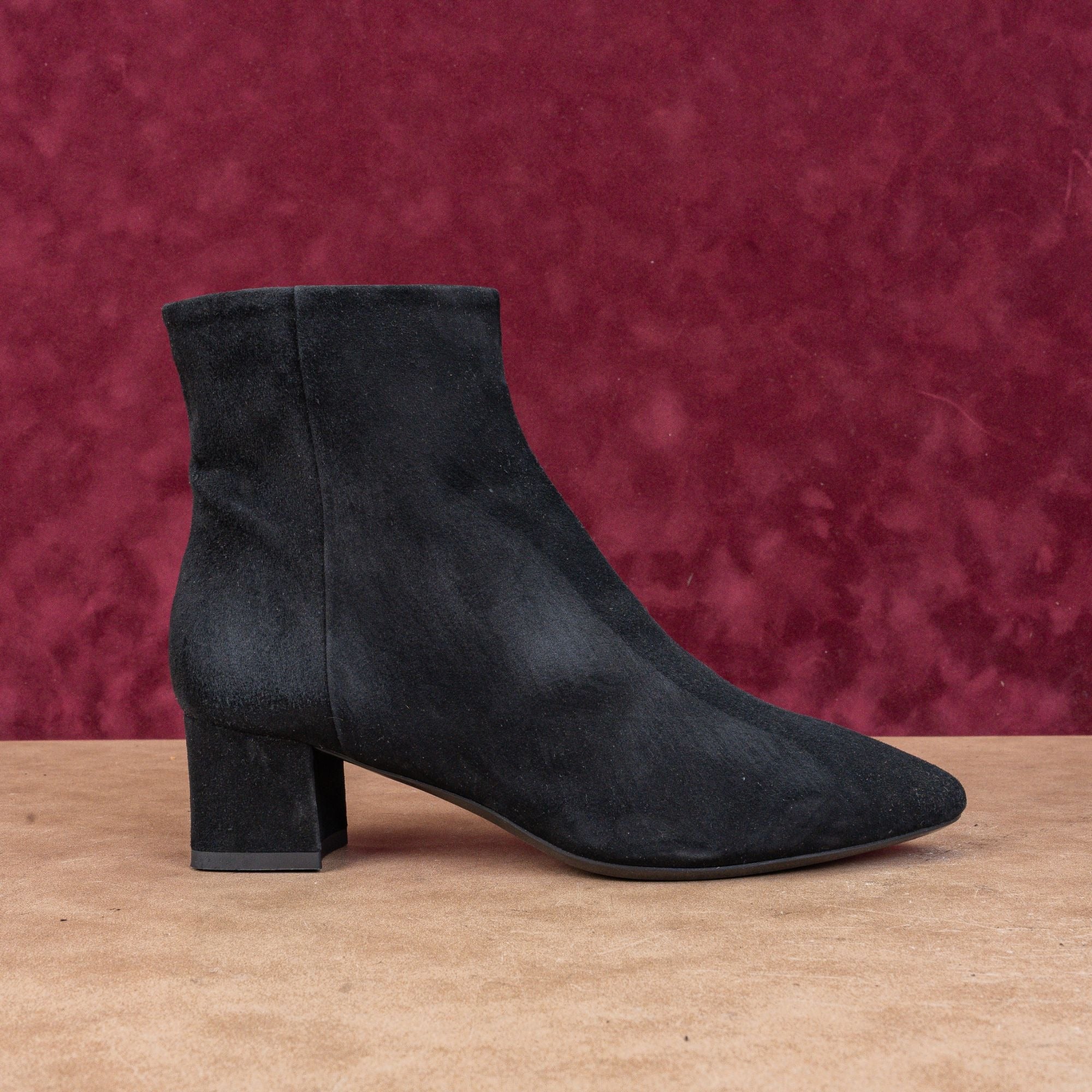 Crafted from premium black weatherproof suede, this bootie features a sharp pointy toe and a comfortable block heel. The perfect polished, all-weather staple for the office or evening.