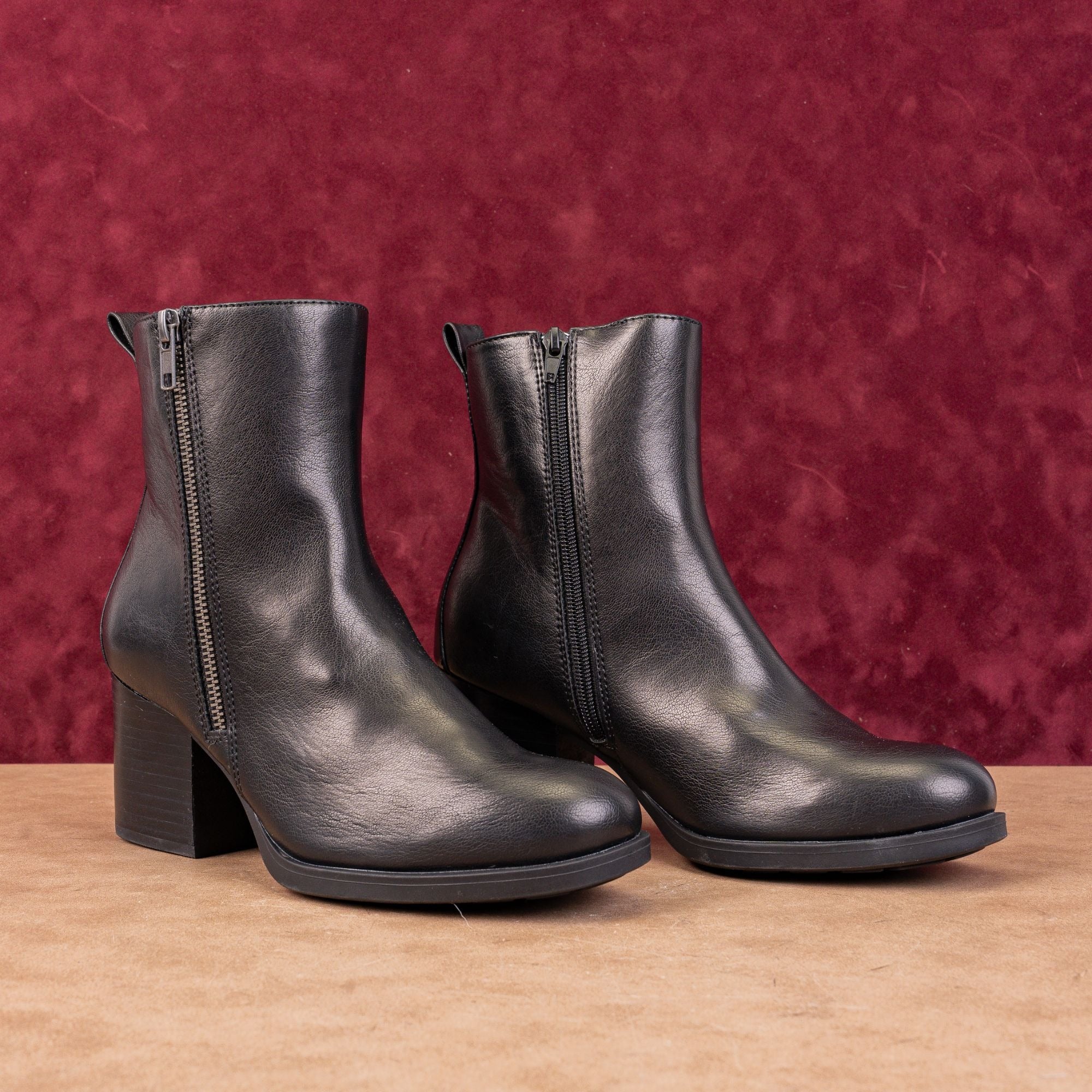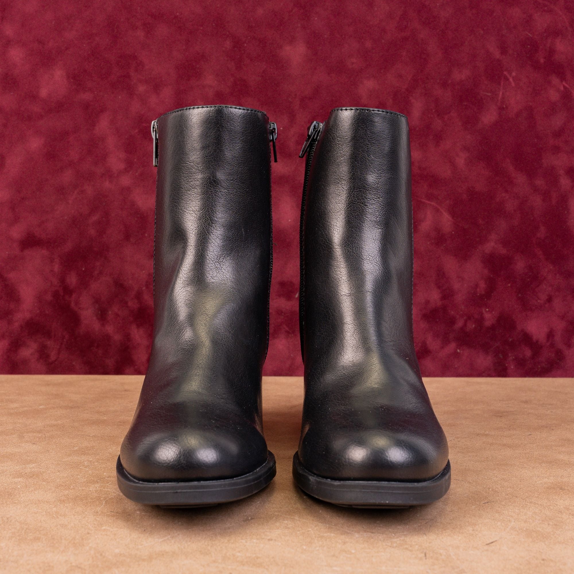 Crafted from high-quality black faux leather that mimics the soft texture of genuine hide, the Boulder features sleek metallic side zippers and a handy rear pull-tab for effortless wear.