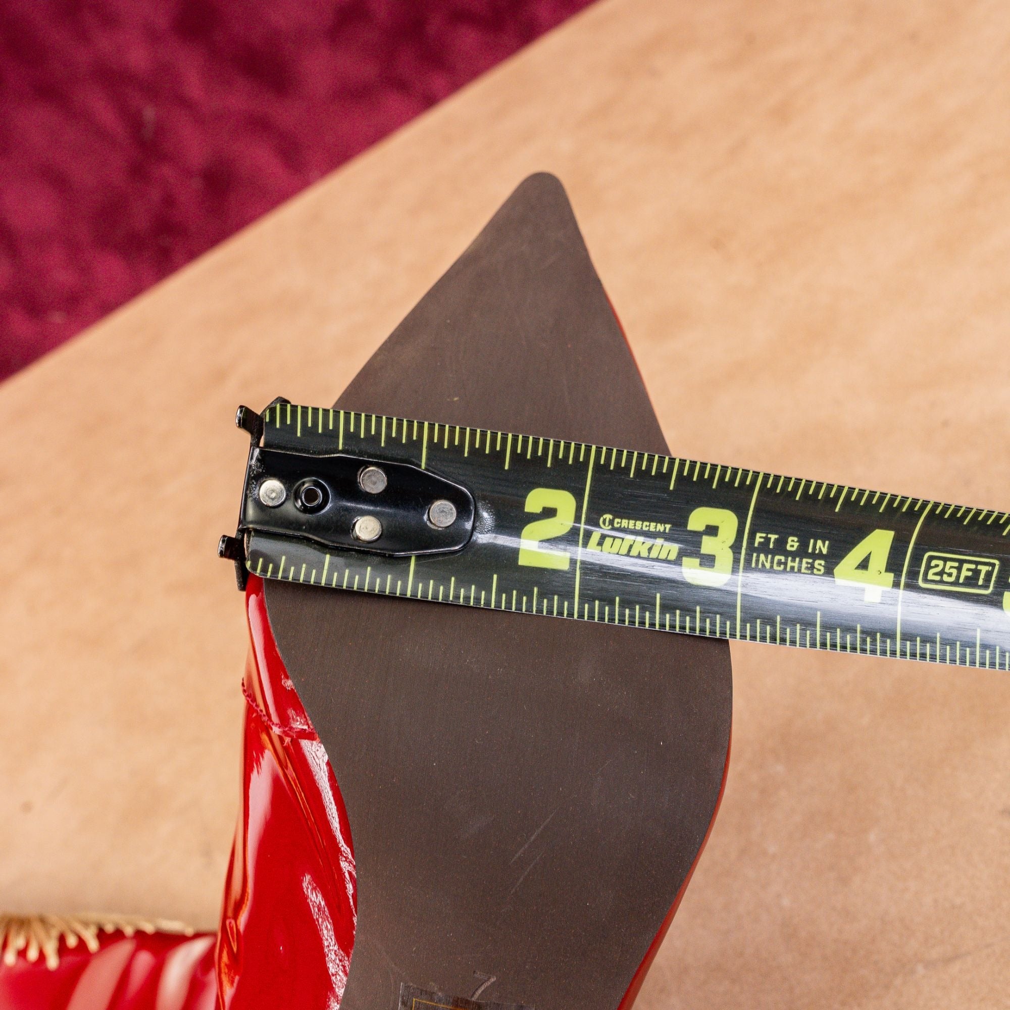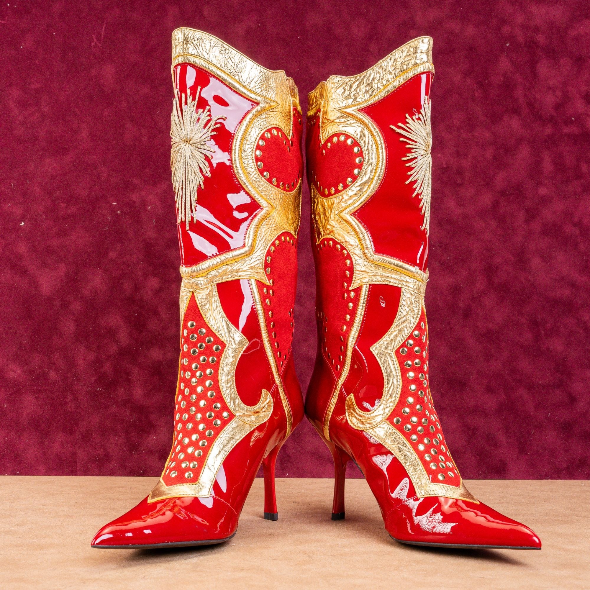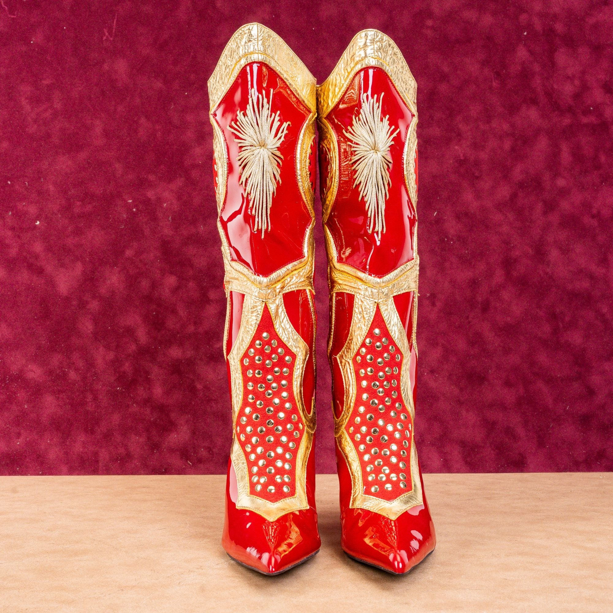 The color is a vibrant, impossible-to-ignore fire engine red in a unique patent and suede mixed-media finish. They feature a razor-sharp pointy toe and a stunning sculptural gold-tone heel that catches the light with every step. The ultimate power boot!