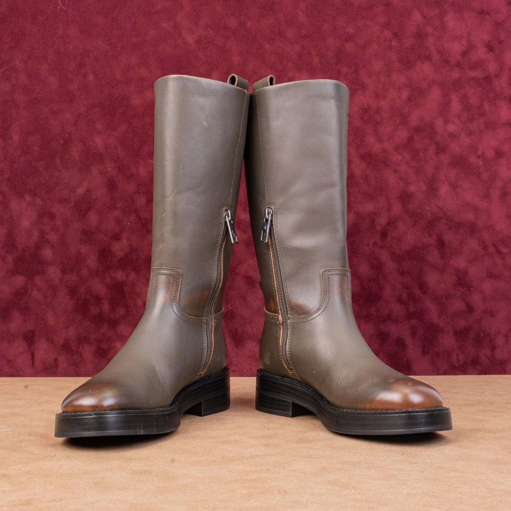 Crafted from rich brown leather, this moto-inspired boot features a sleek pull-on shaft (no zipper!) and a walkable stacked heel. The perfect statement piece for fall and winter.
