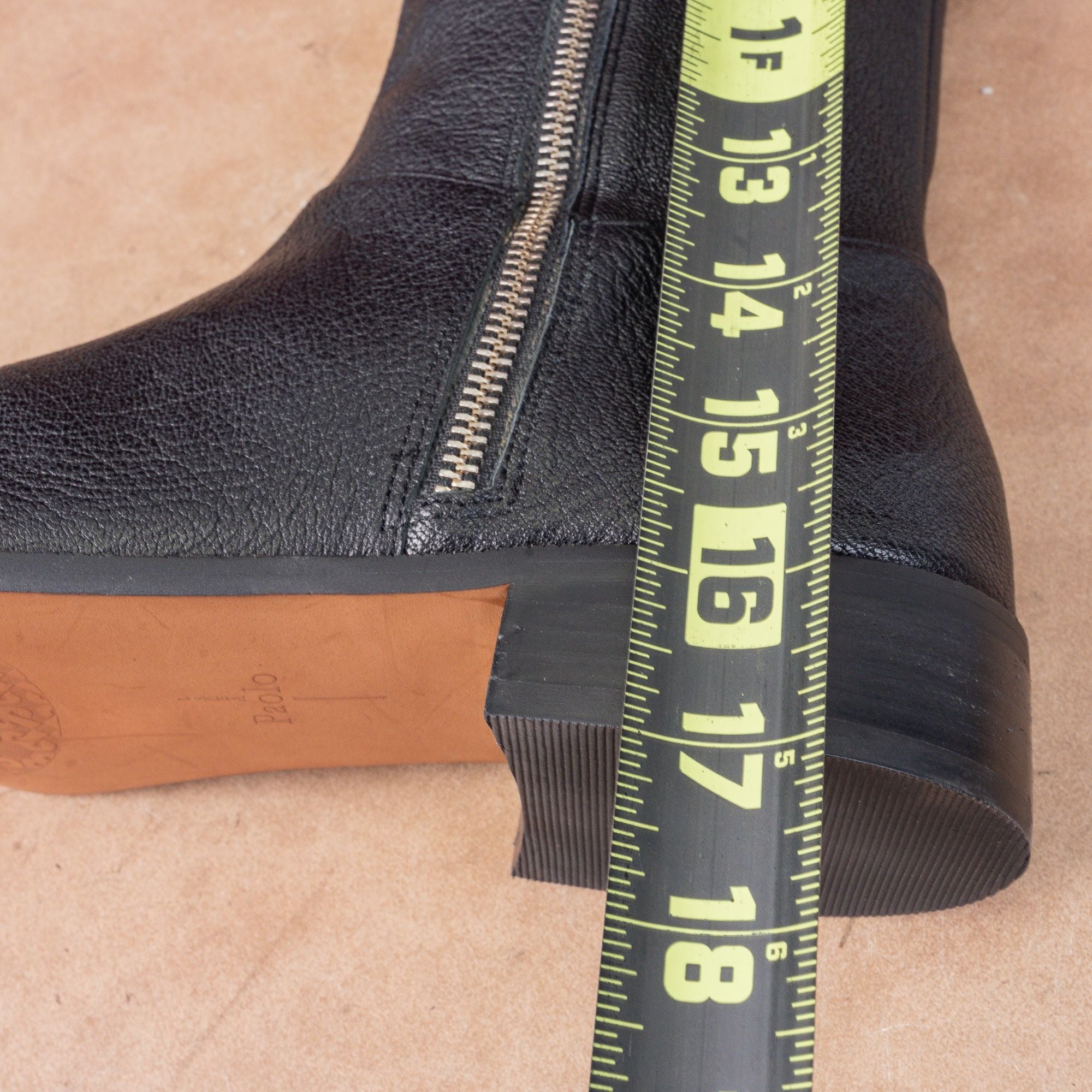 Crafted from sleek black leather, this sophisticated knee-high boot features a pointed toe, a low block heel, and a slim-fit shaft for a flawless, leg-hugging silhouette.