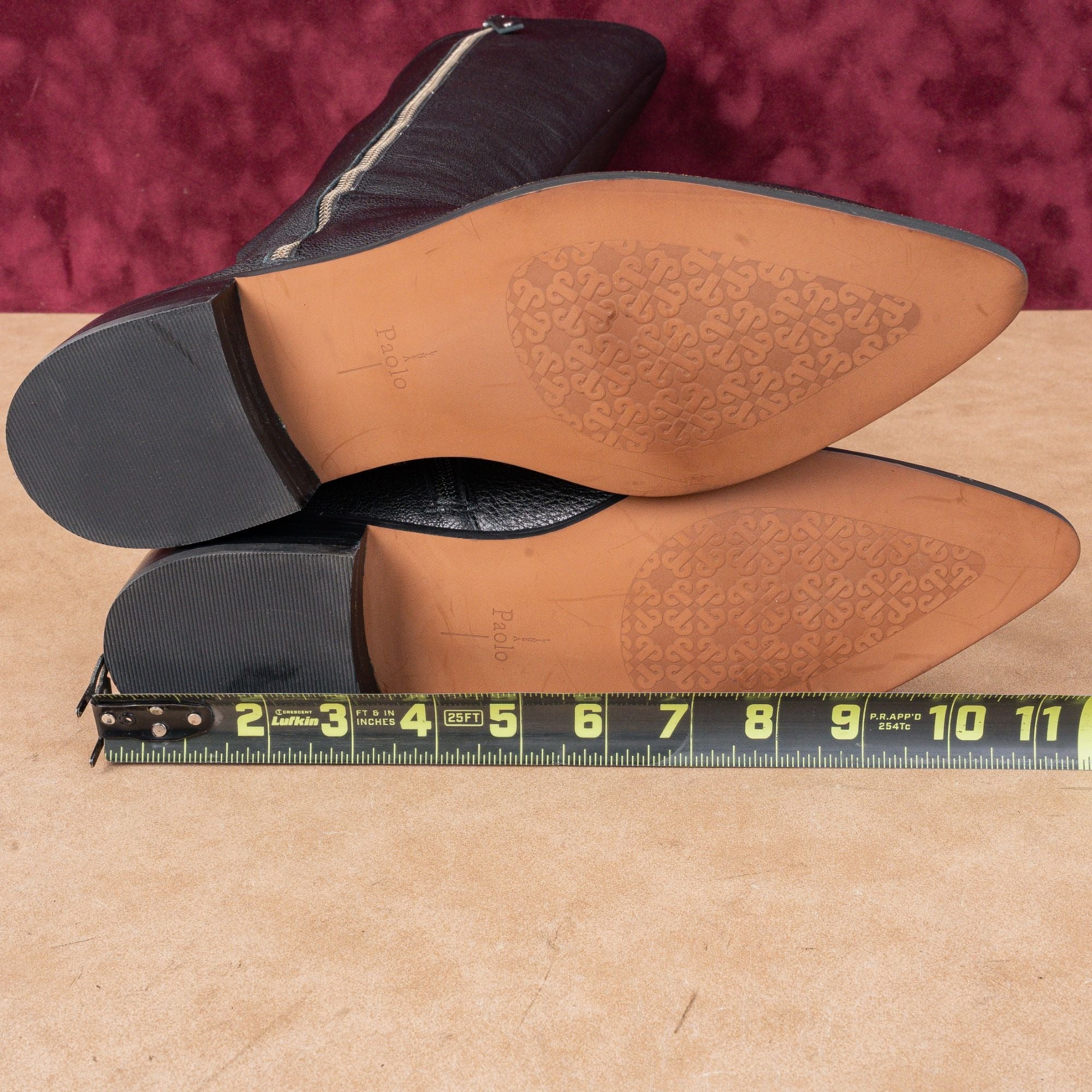 New Condition. No signs of wear on the soles. Never Worn. Made in China. Retail $250. Leather Upper, Fabric Lining and Rubber soles. Side zipper style for easy on and off. Pointy Toe. SKU11553