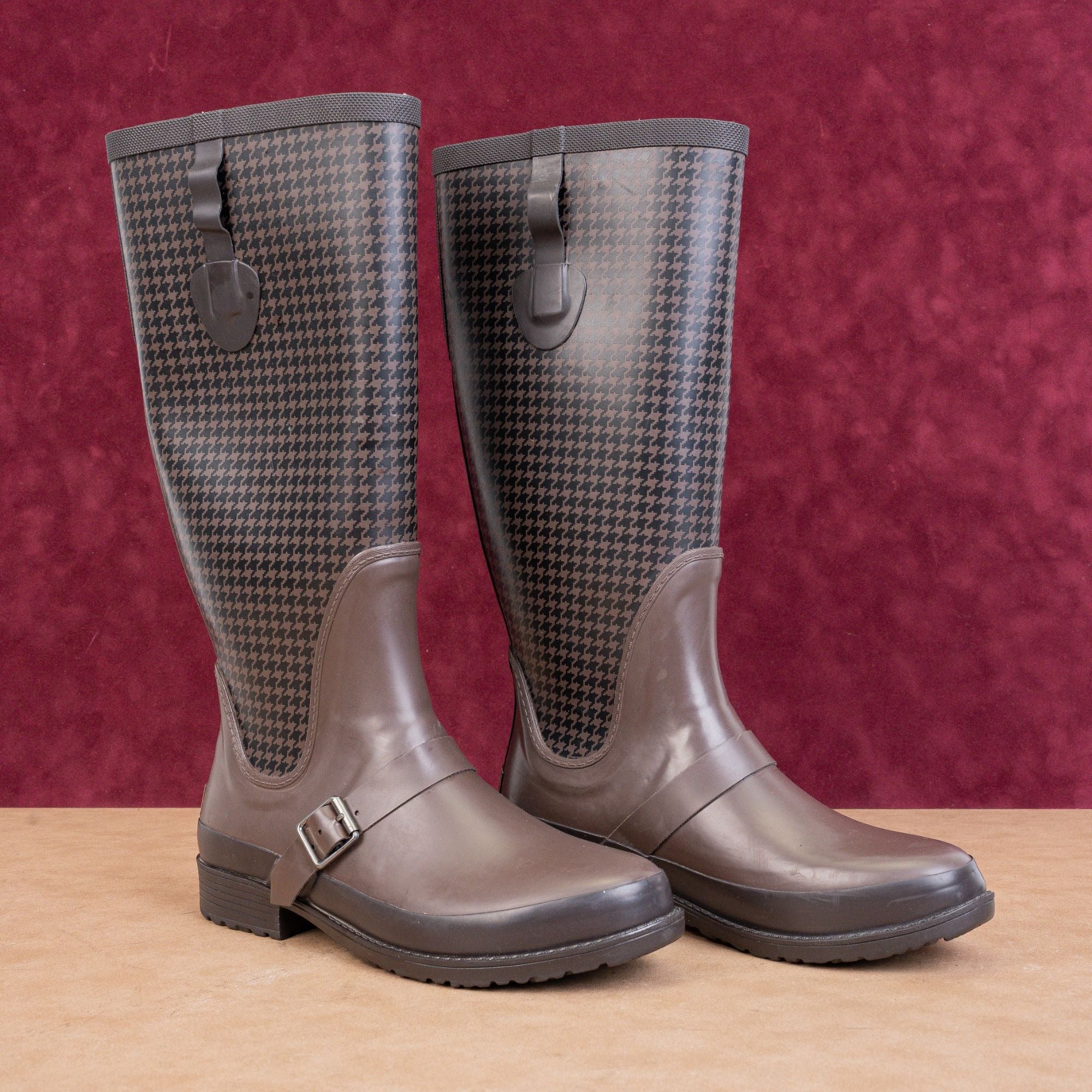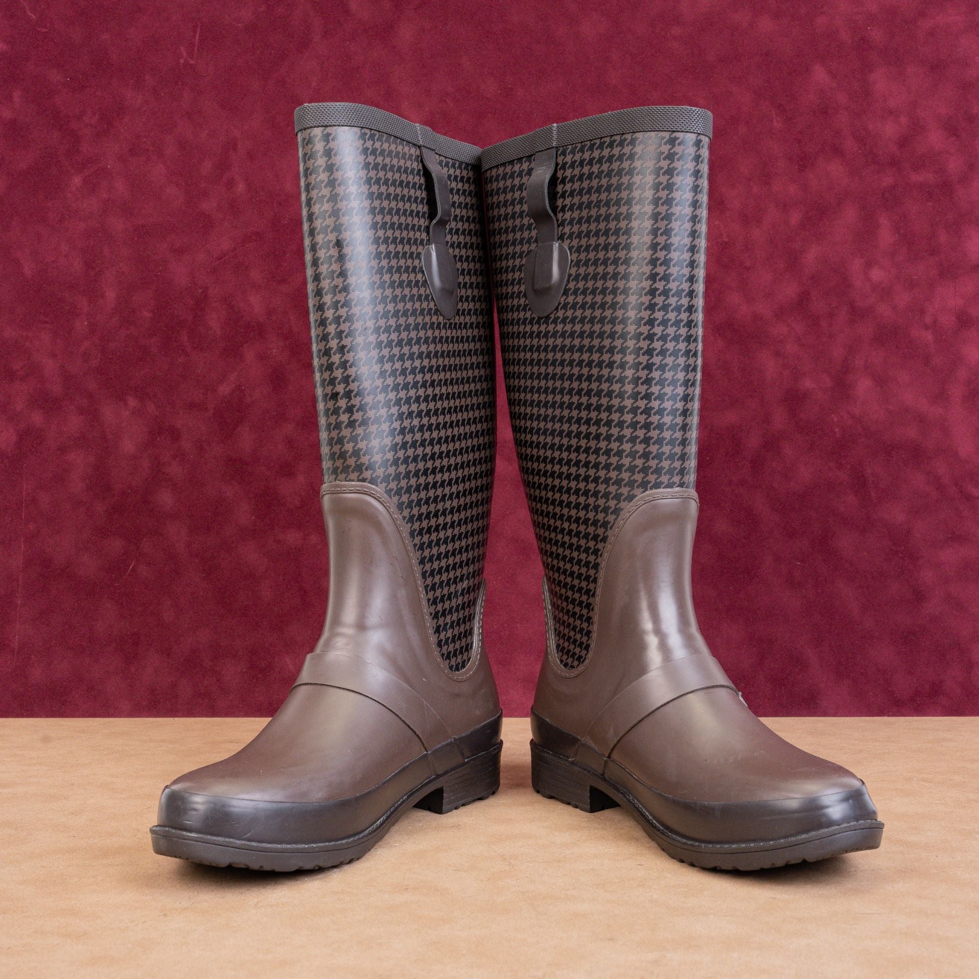 Like New Condition. No signs of wear on the soles. Rain Boots Never Worn. Made in China. Model # Hound. Retail $189. Rubber Upper, Fabric Lining and Rubber Soles. Pull on style for easy on and off. Please check photos carefully for more information and details. SKU#11242