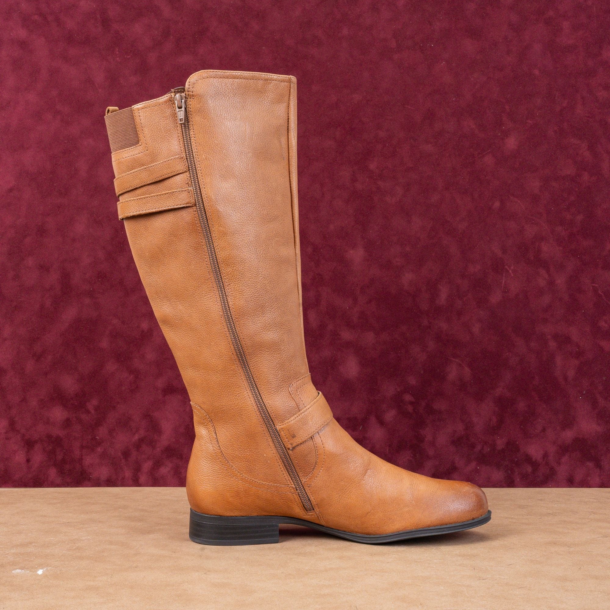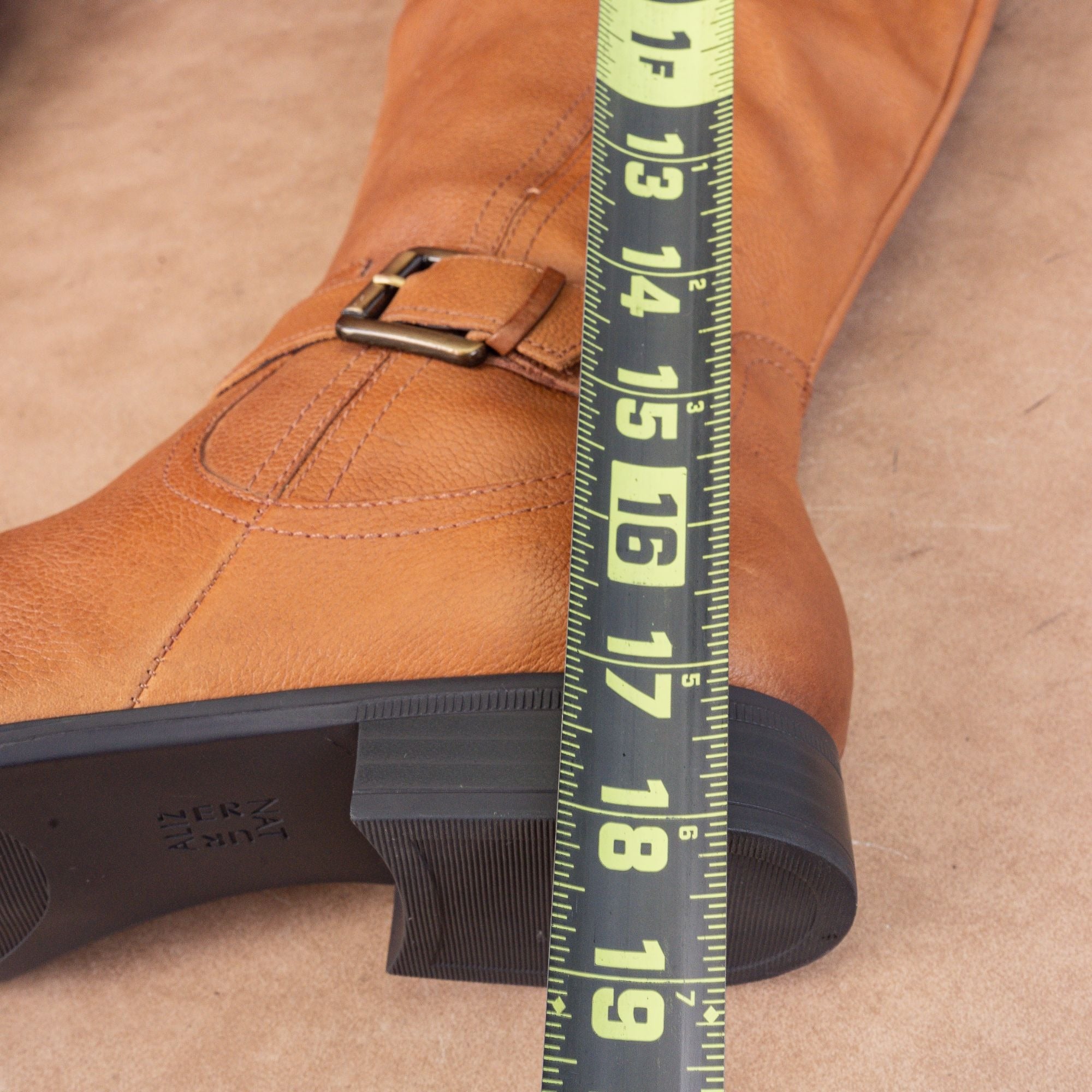 The Naturalizer Jesse riding boot in Women's Size 12W (Wide Width) features a generous Wide Calf shaft. Crafted from rich brown leather, it includes Naturalizer's signature N5 Contour+ comfort technology for all-day wear.