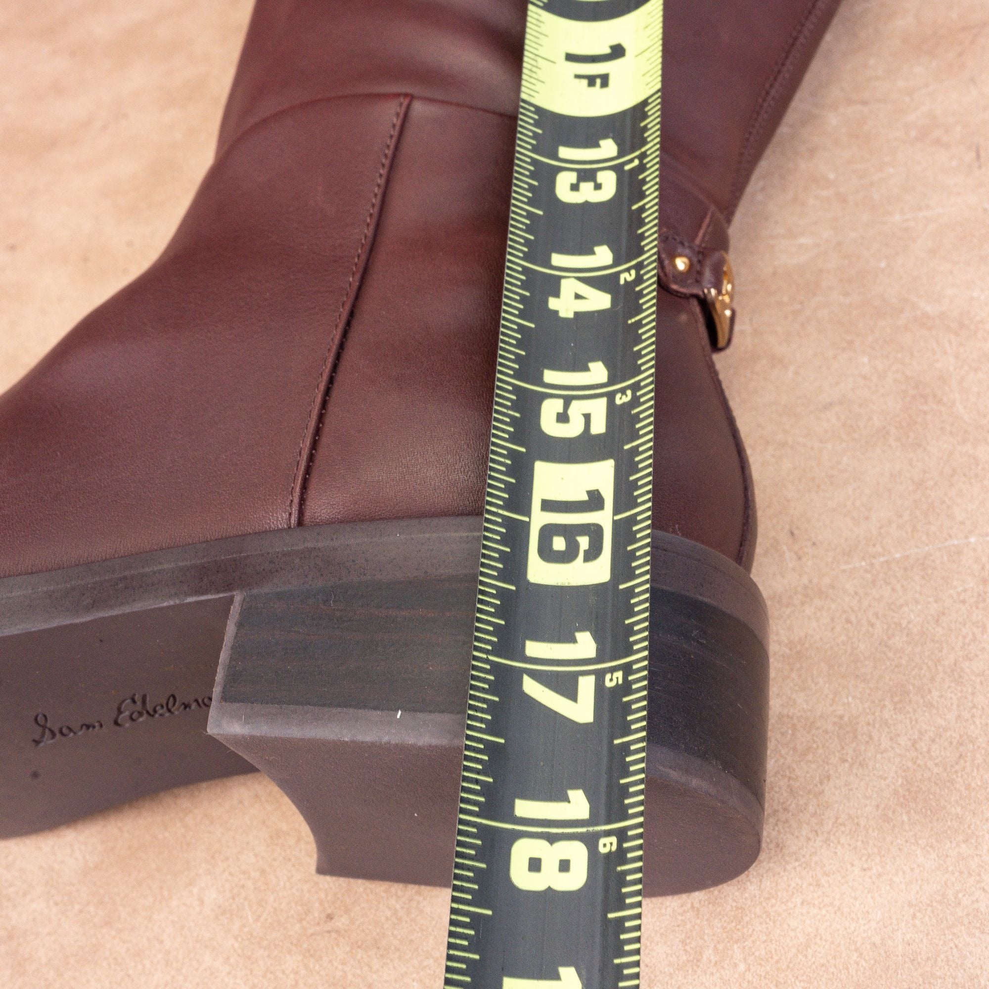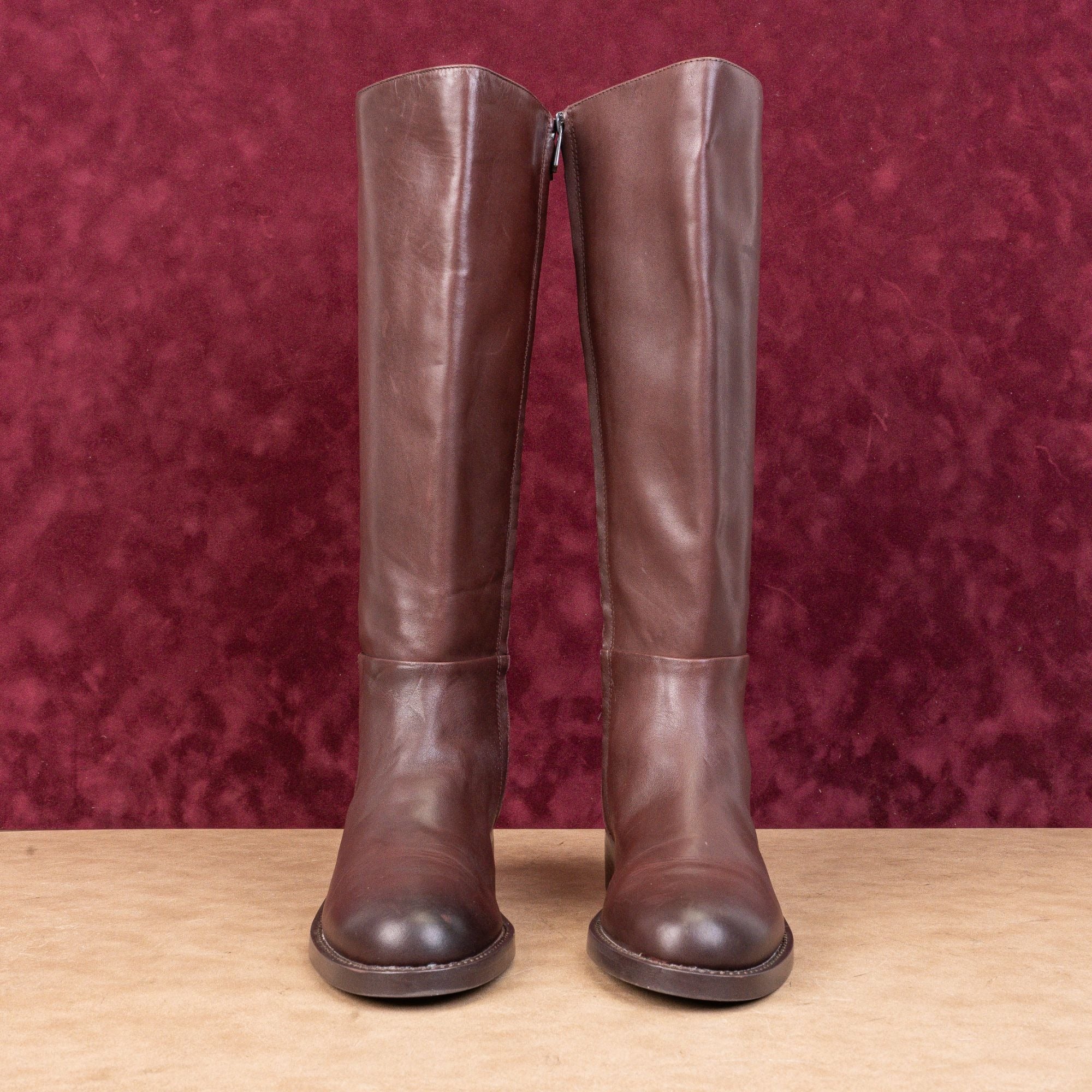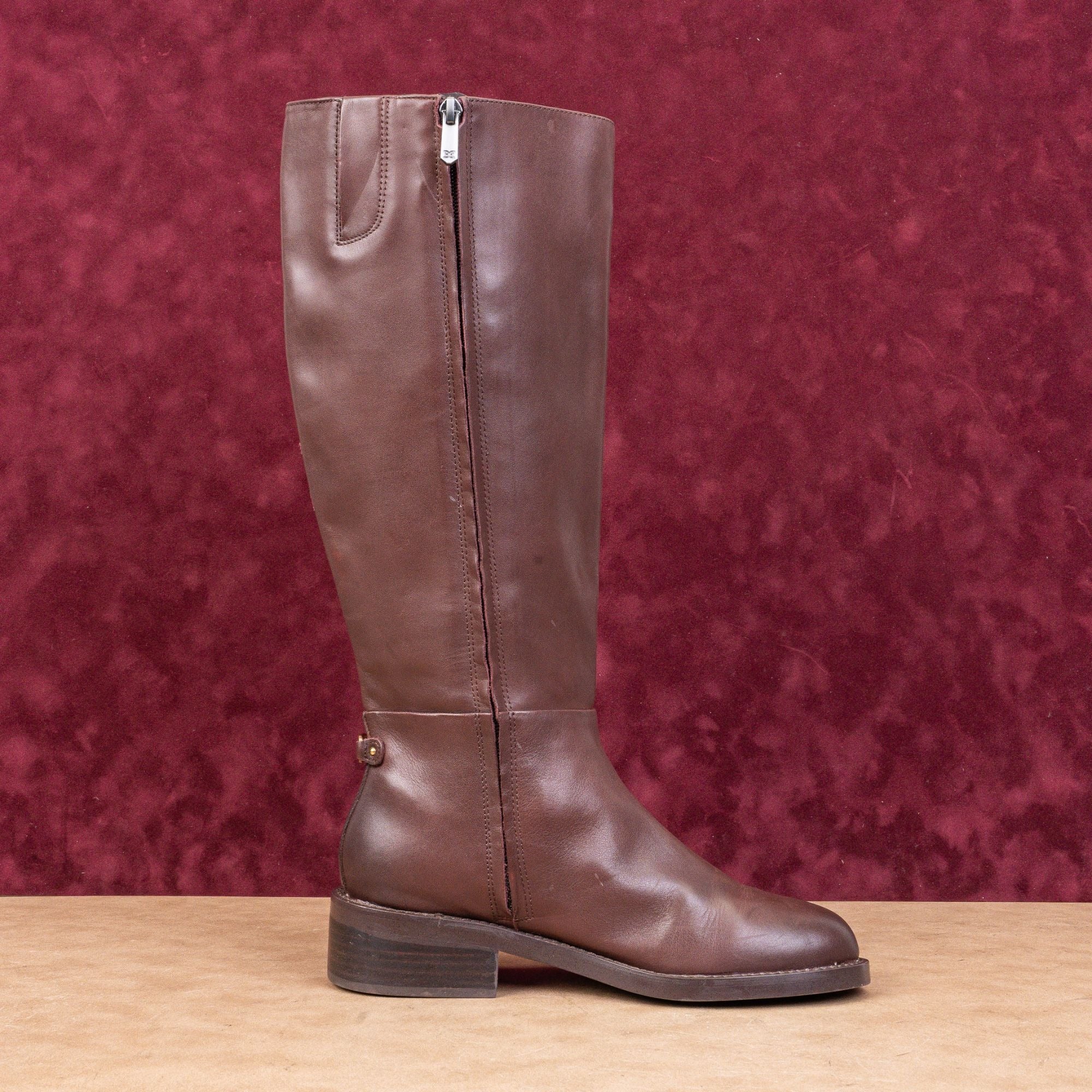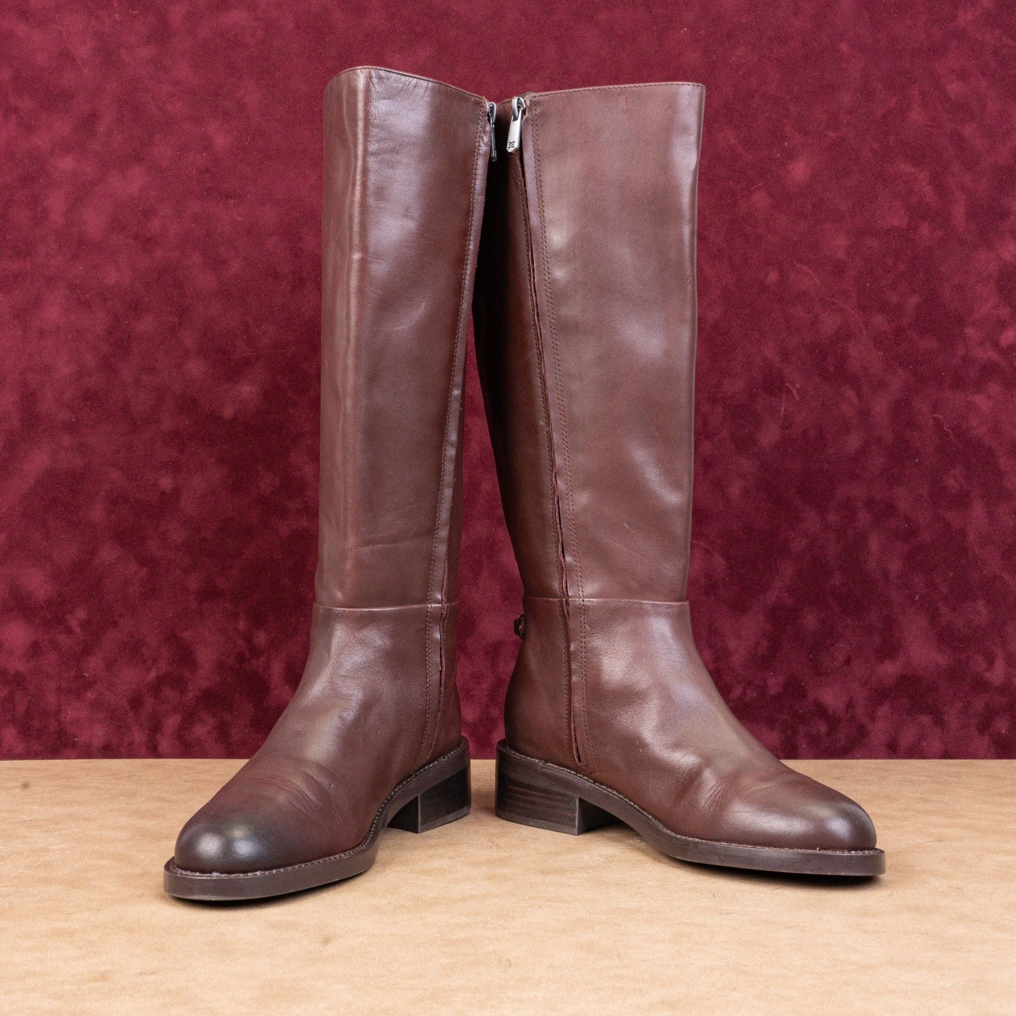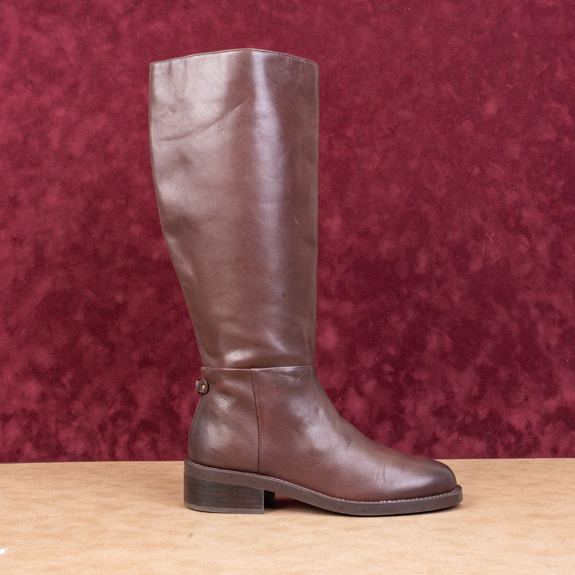 Crafted from rich dark brown leather, this timeless knee-high boot features a generous calf shaft for comfort, a full-length side zip, and classic equestrian hardware details.