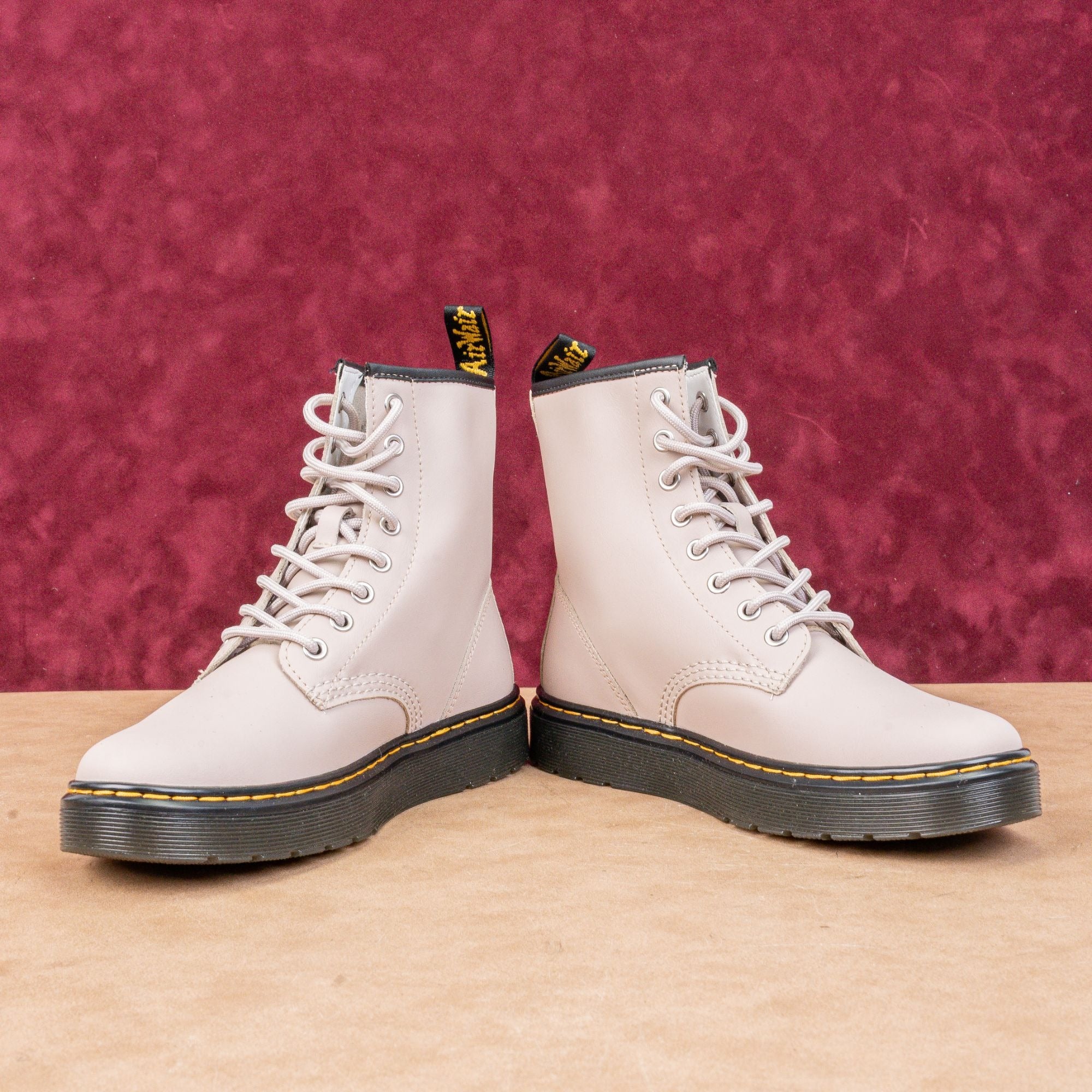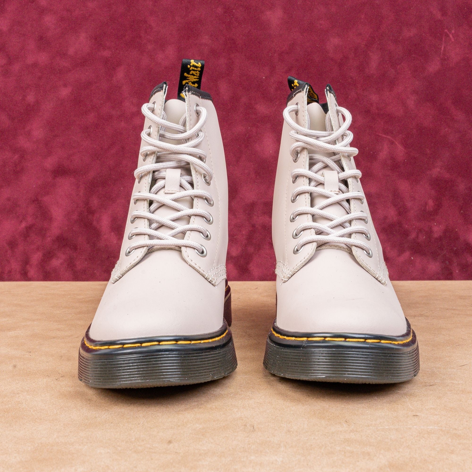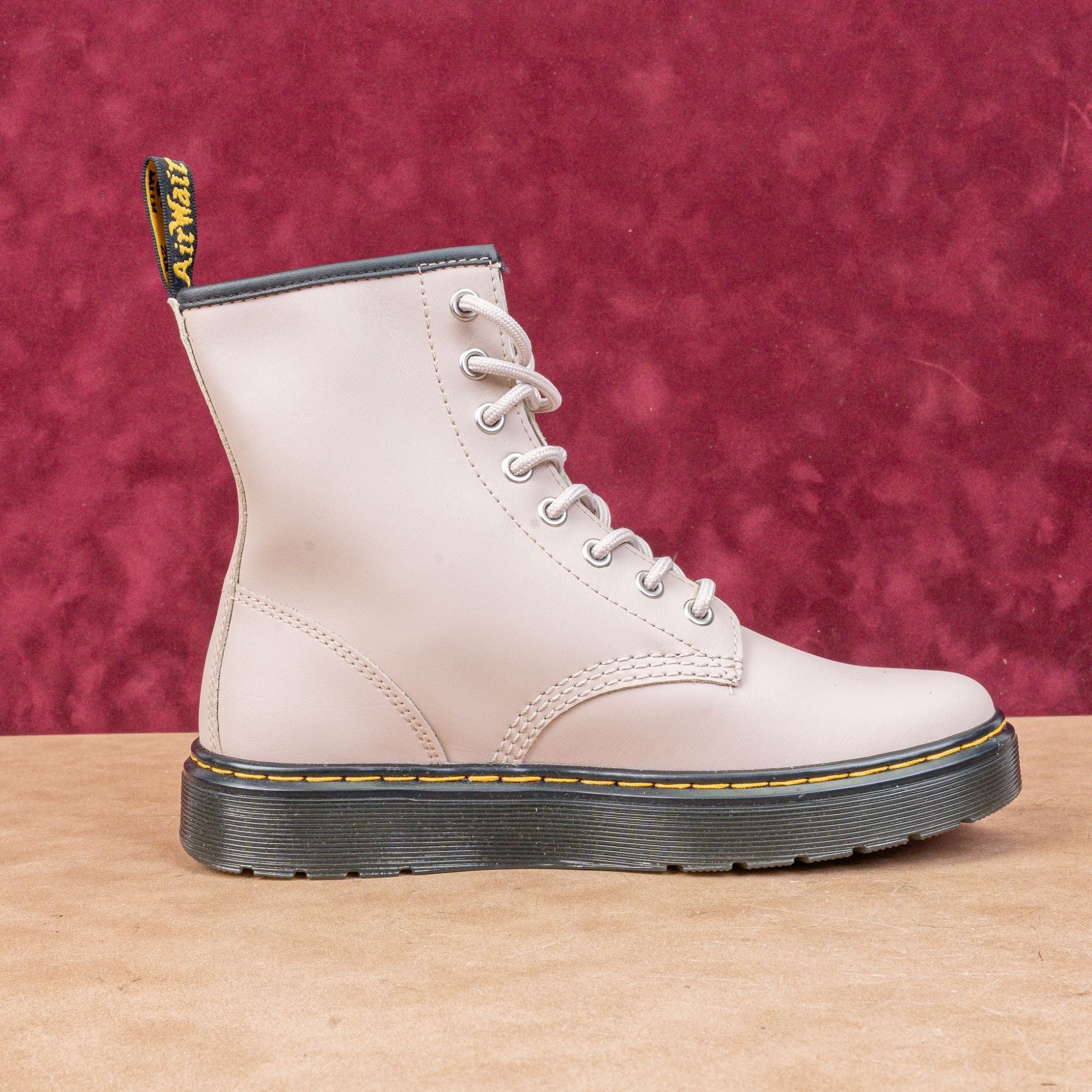 Crafted from textured taupe leather, this 8-eye combat boot features the signature AirWair™ cushioned sole for all-day comfort. The perfect everyday boot.