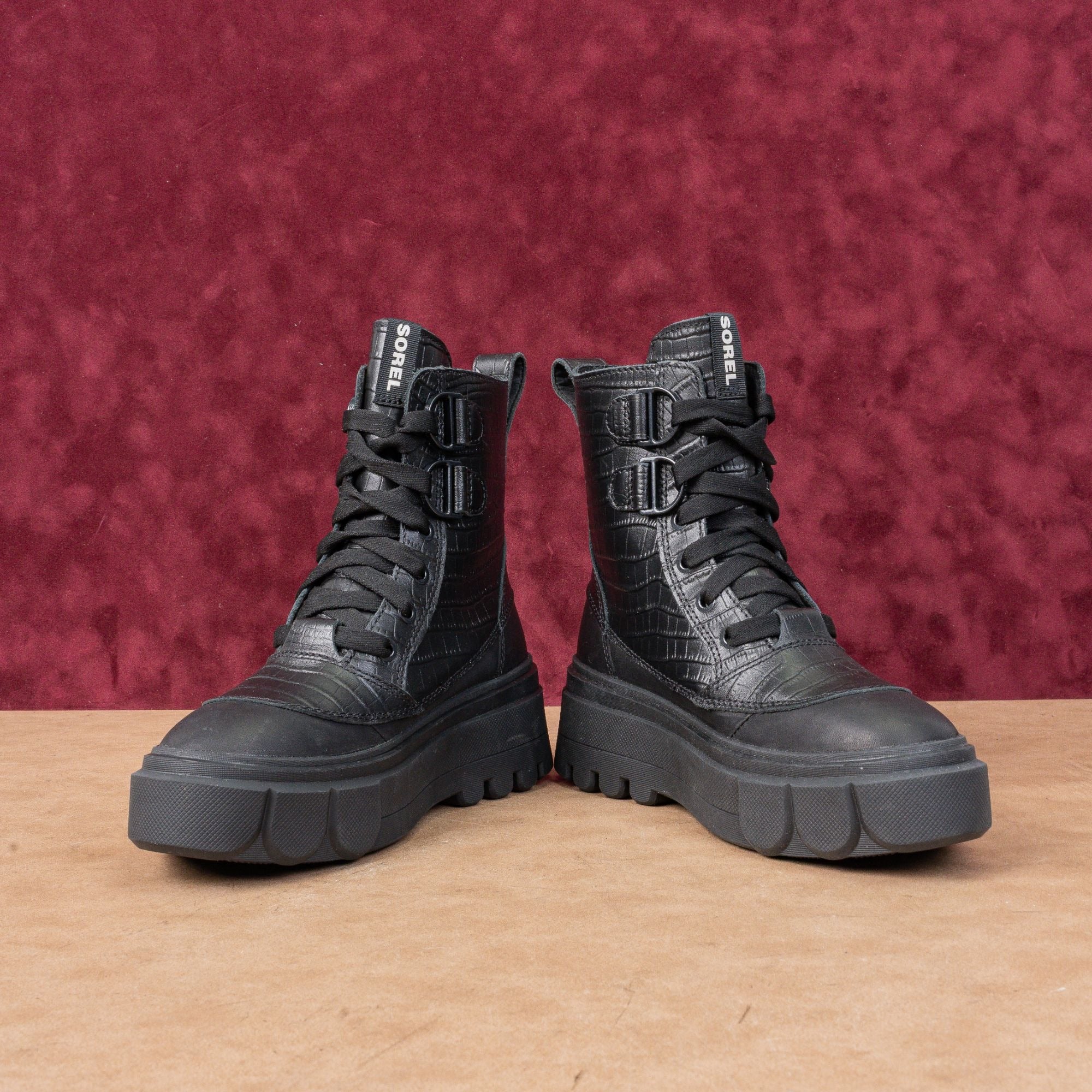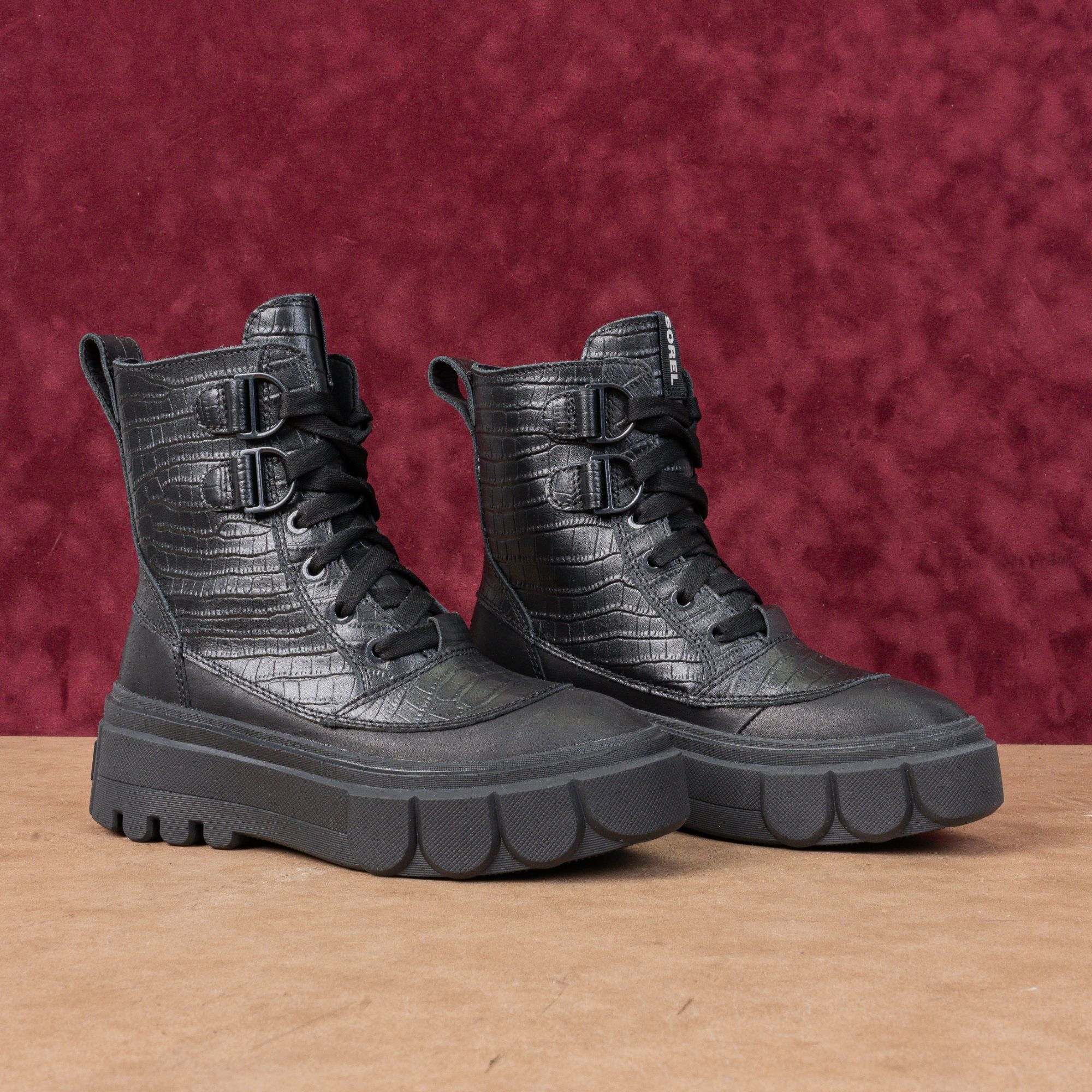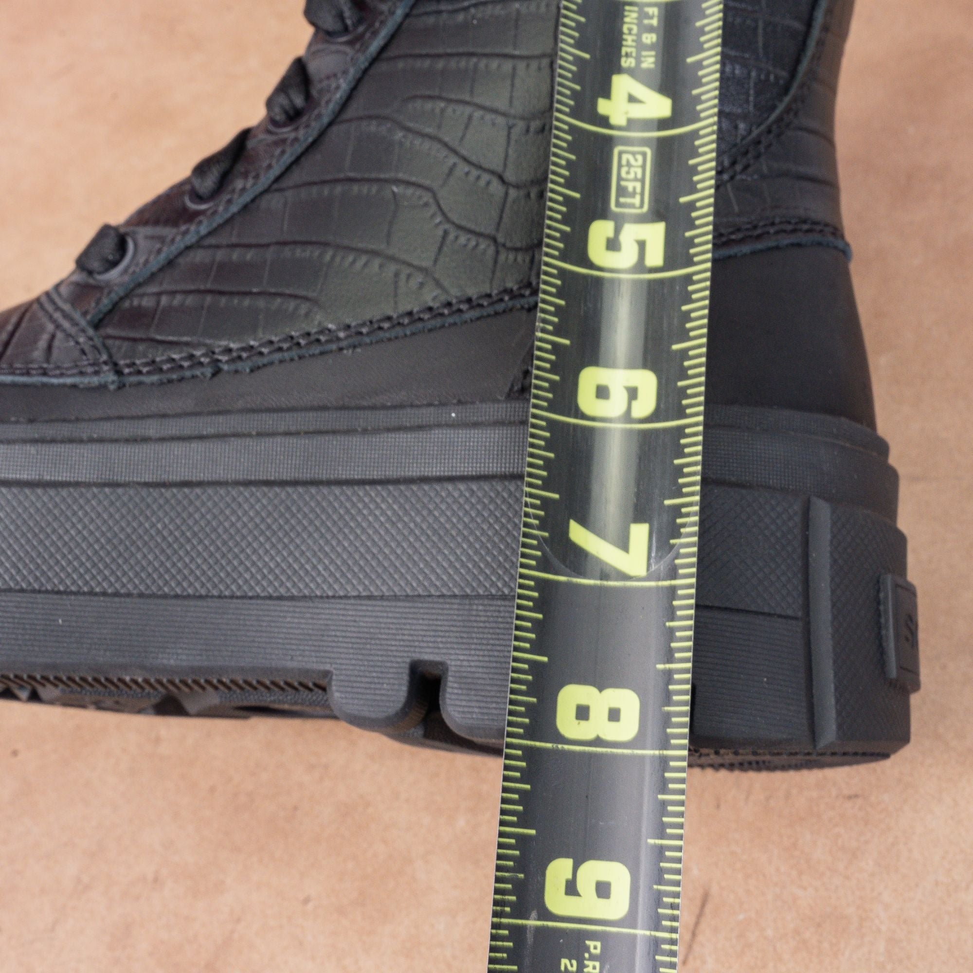 This fashion-forward boot features a waterproof black leather upper, a bold chunky platform sole, and the iconic Caribou shell, all reimagined for the modern trendsetter.