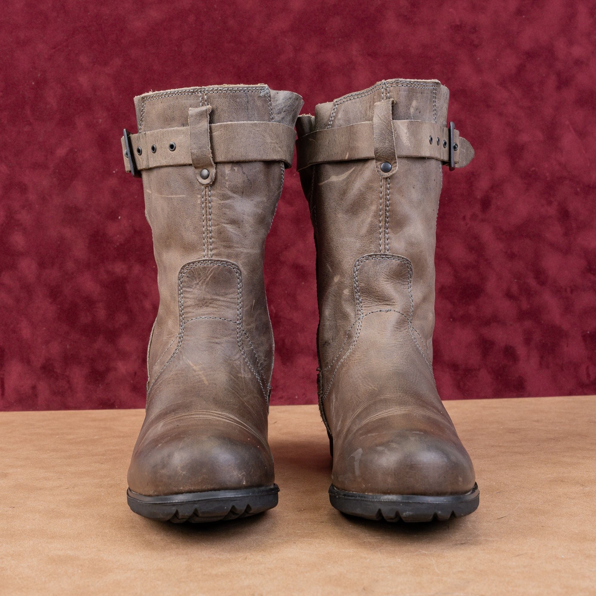 Crafted from premium, distressed grey leather, the Tug features a unique double-strap buckle system and a side-zip entry for that perfect "tough-girl" aesthetic.