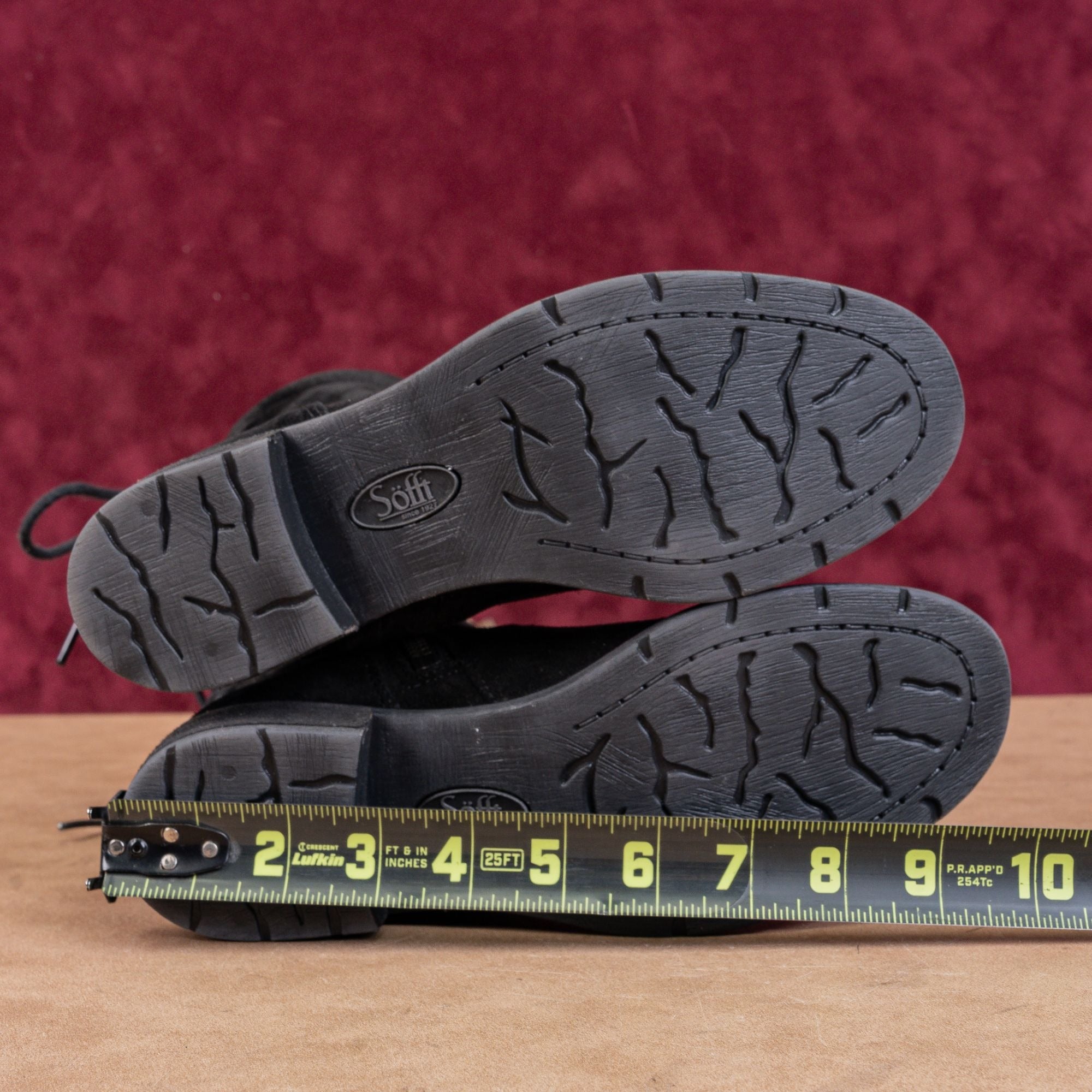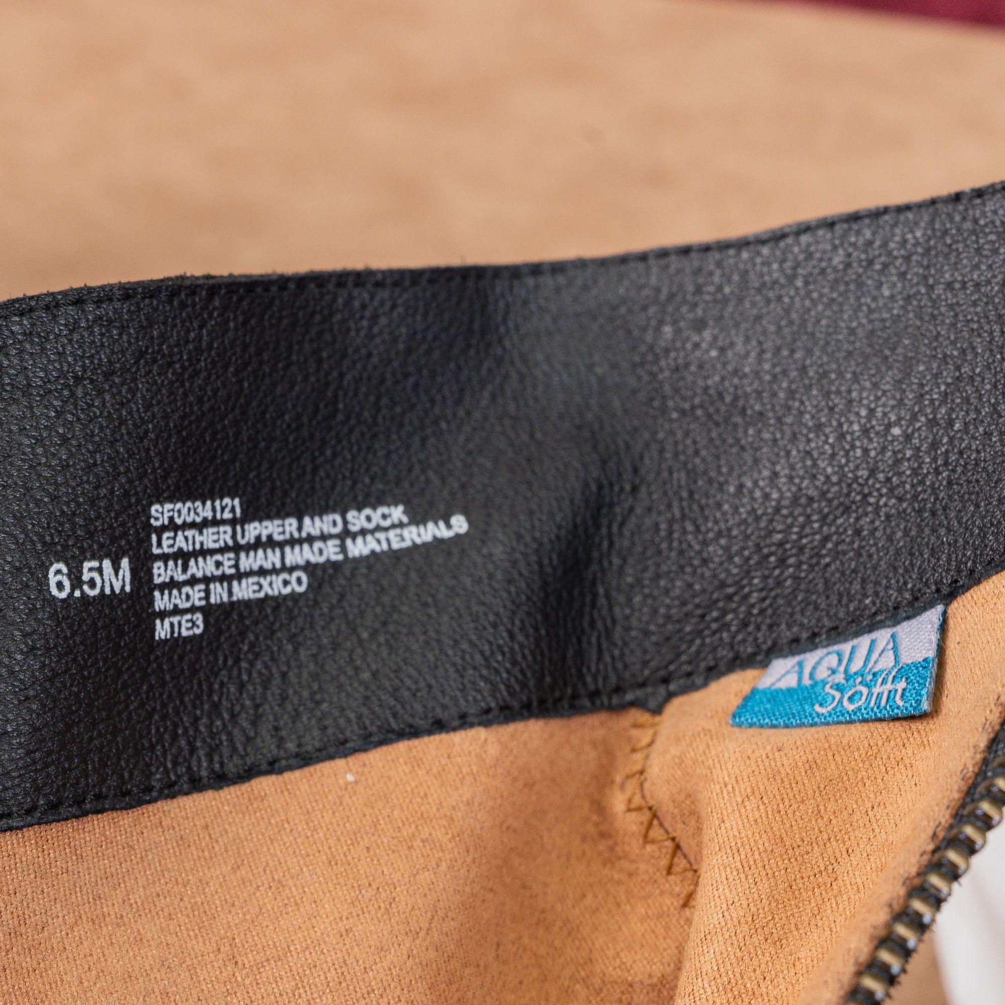 New Condition with yags. No signs of wear on the soles. Never-Worn. Made in Mexico. Model # Sharnell. Retail $195. Leather Upper, Fabric Lining and Rubber soles. Side zipper style for easy on and off. Almond Toe. SKU11880