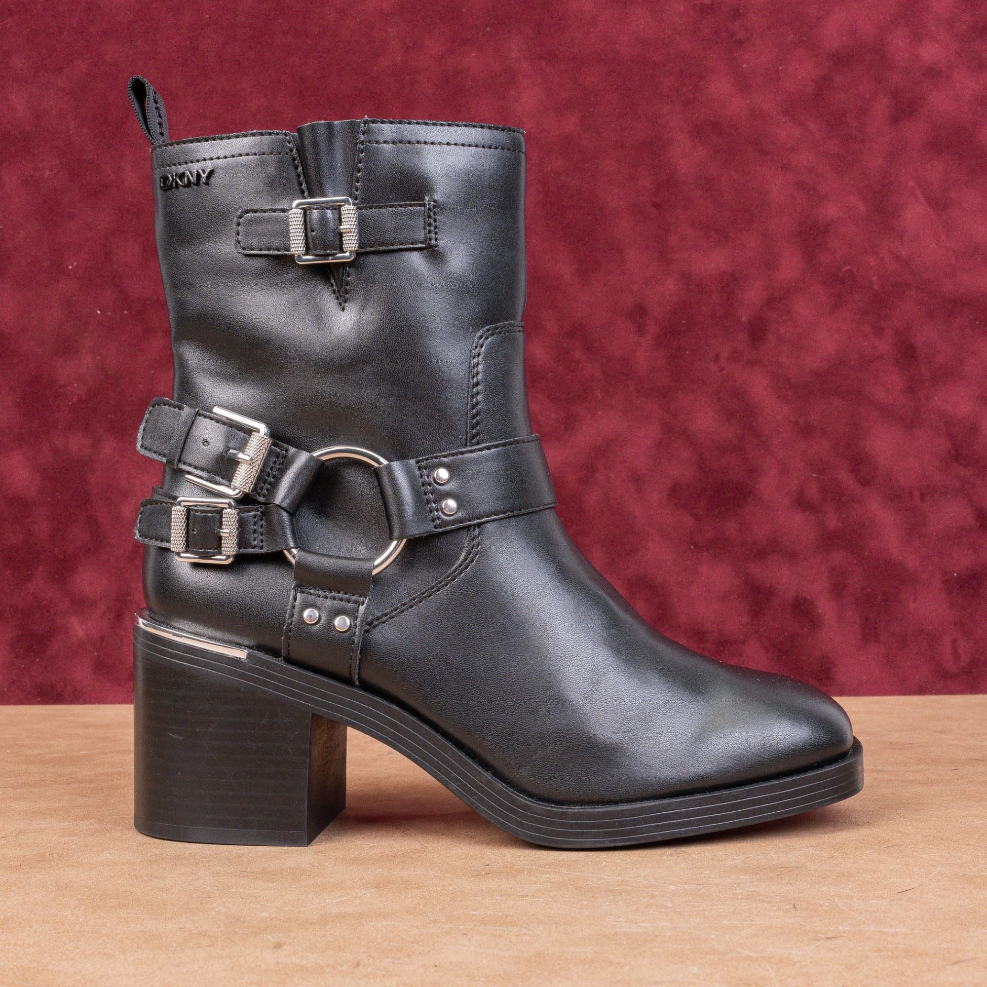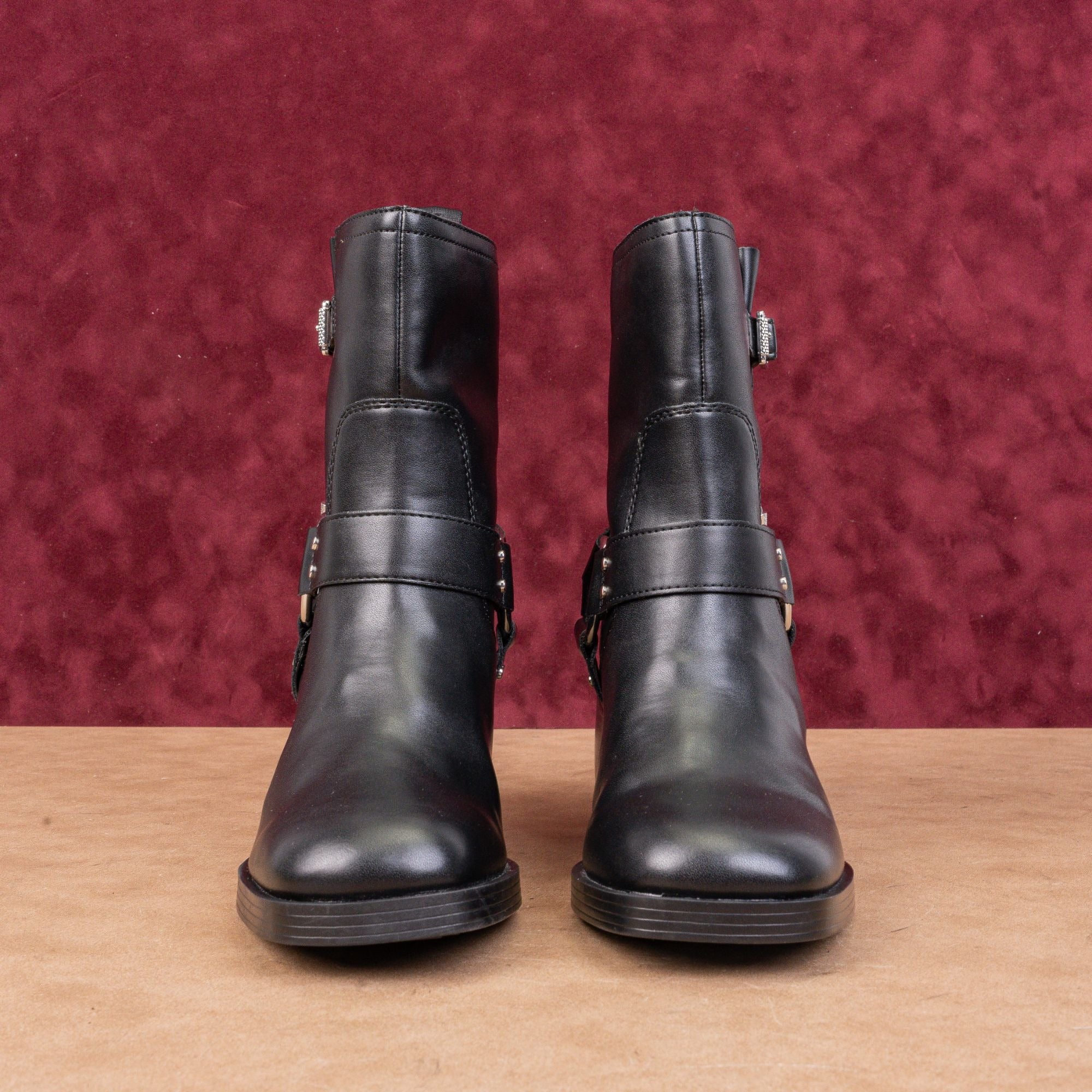 Crafted from durable black vegan leather, this ankle boot features a sleek harness strap, side zip, and a confident lug sole. The perfect animal-friendly boot for an elevated moto look.