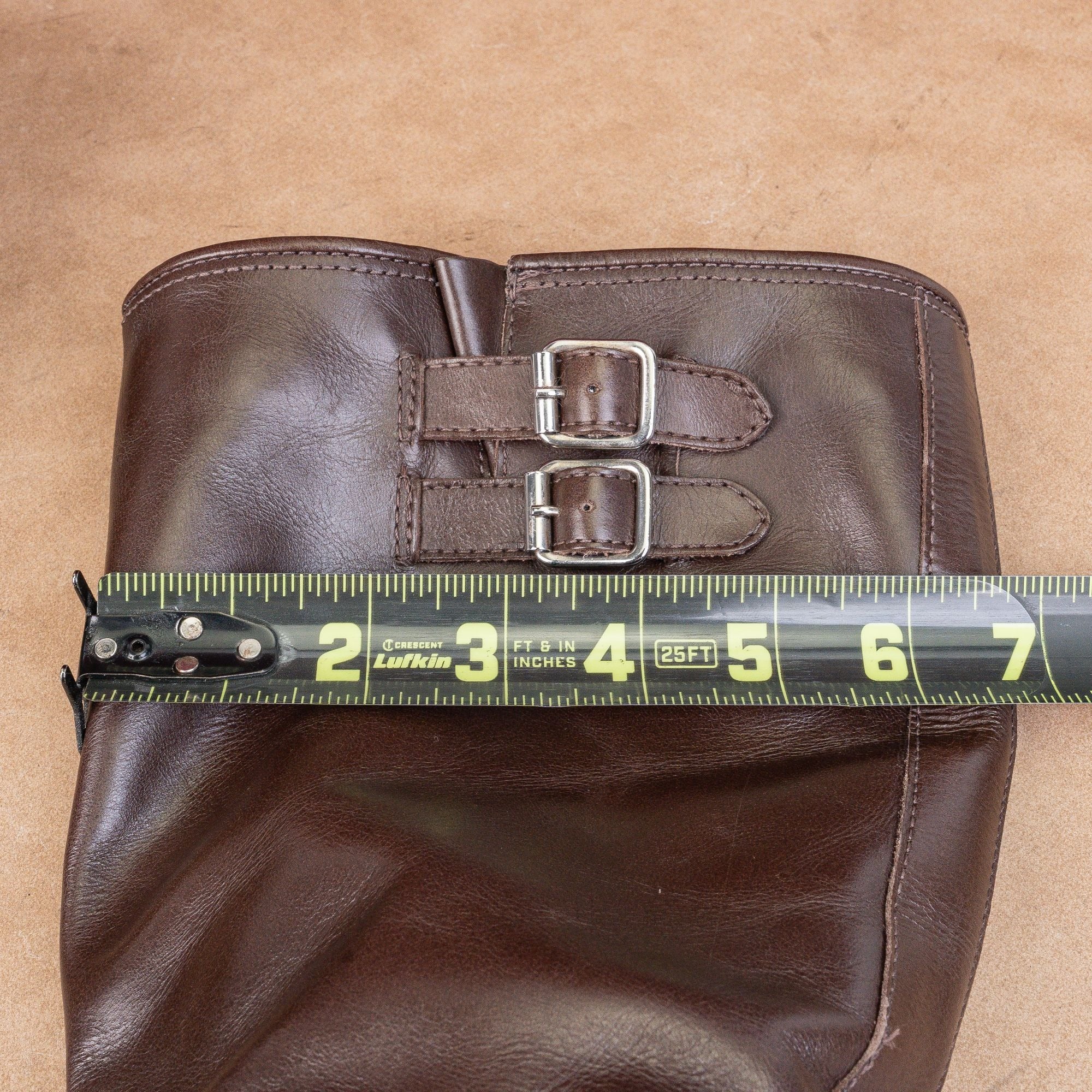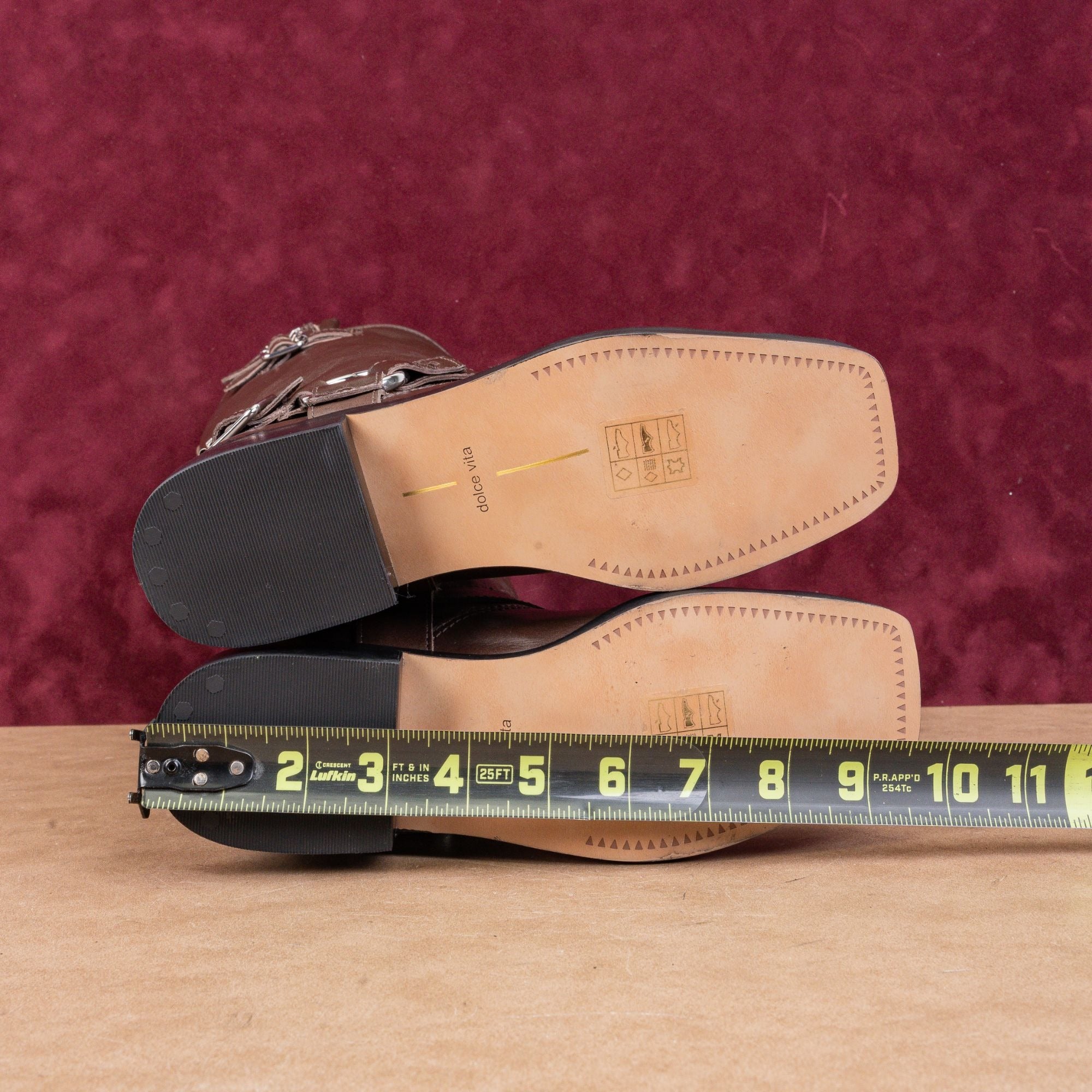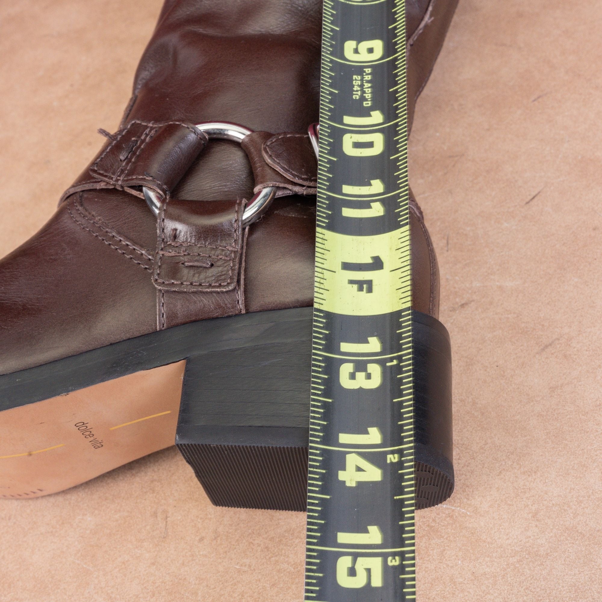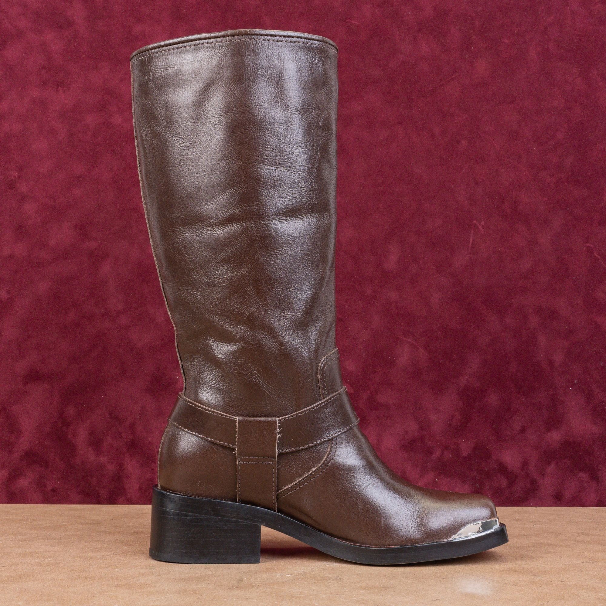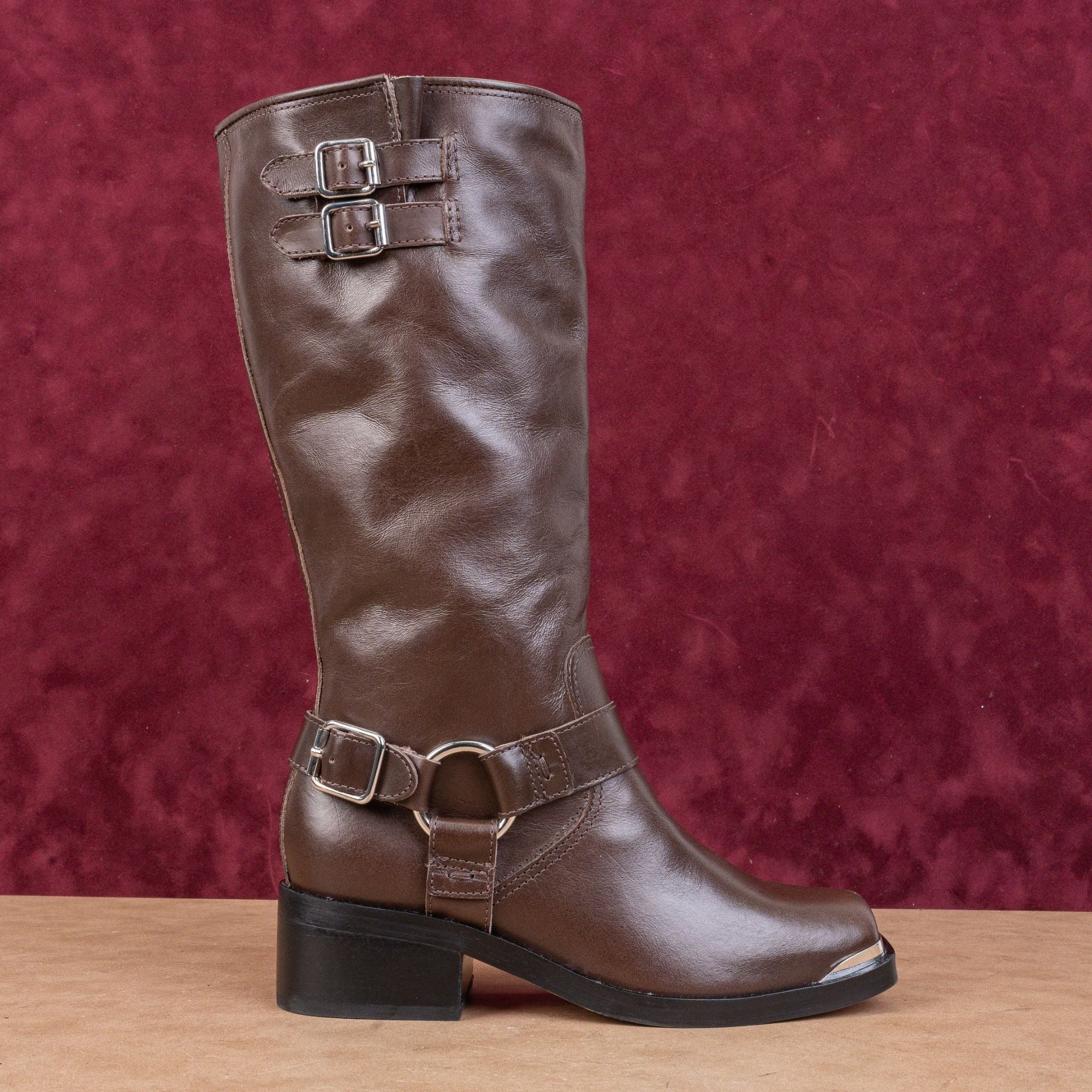 Crafted from rich brown leather, this mid-calf boot features the signature metal O-ring harness for a perfect boho-meets-biker vibe. The ultimate staple for festivals and year-round cool.